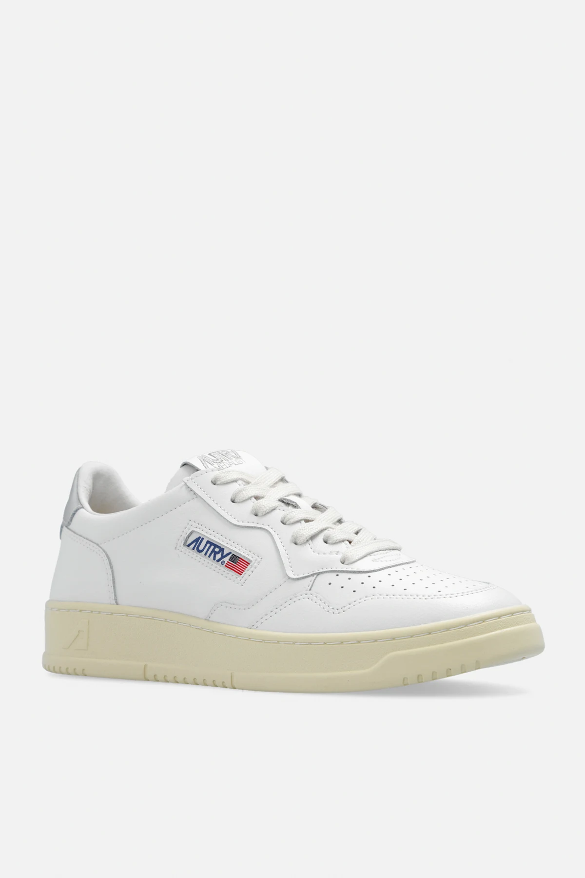 White ‘Aulw’ sneakers from Autry. Crafted from leather, this lace-up model sits on a cream rubber sole and showcases the brand's logo, decorative perforations on the front and a silver-tone heel counter.