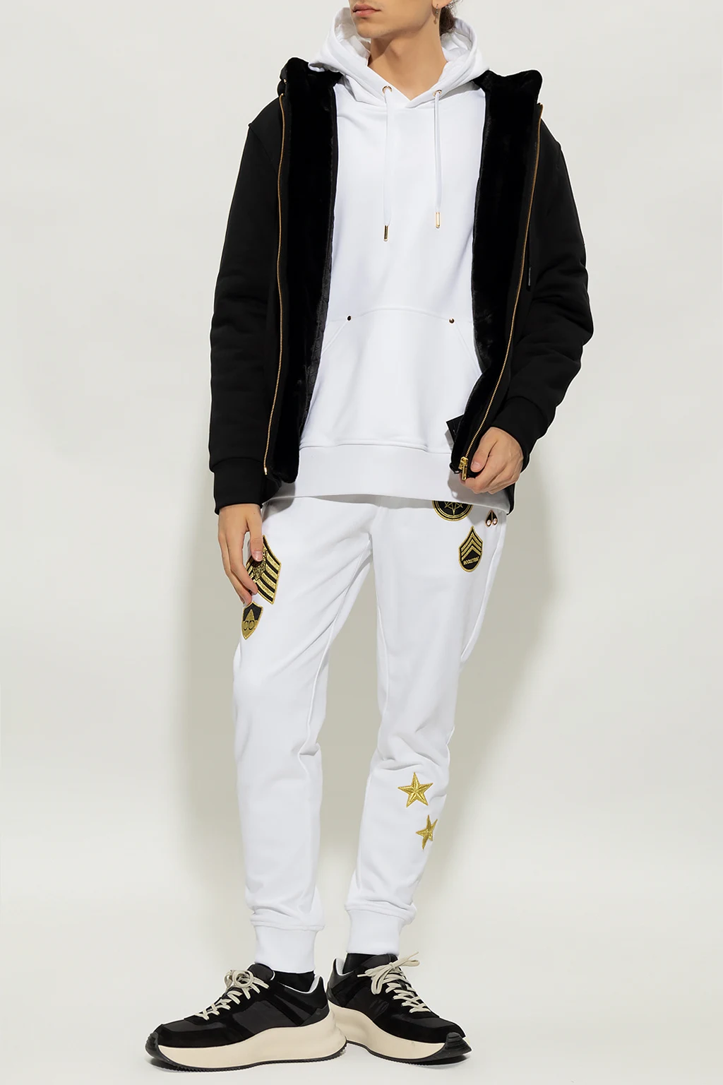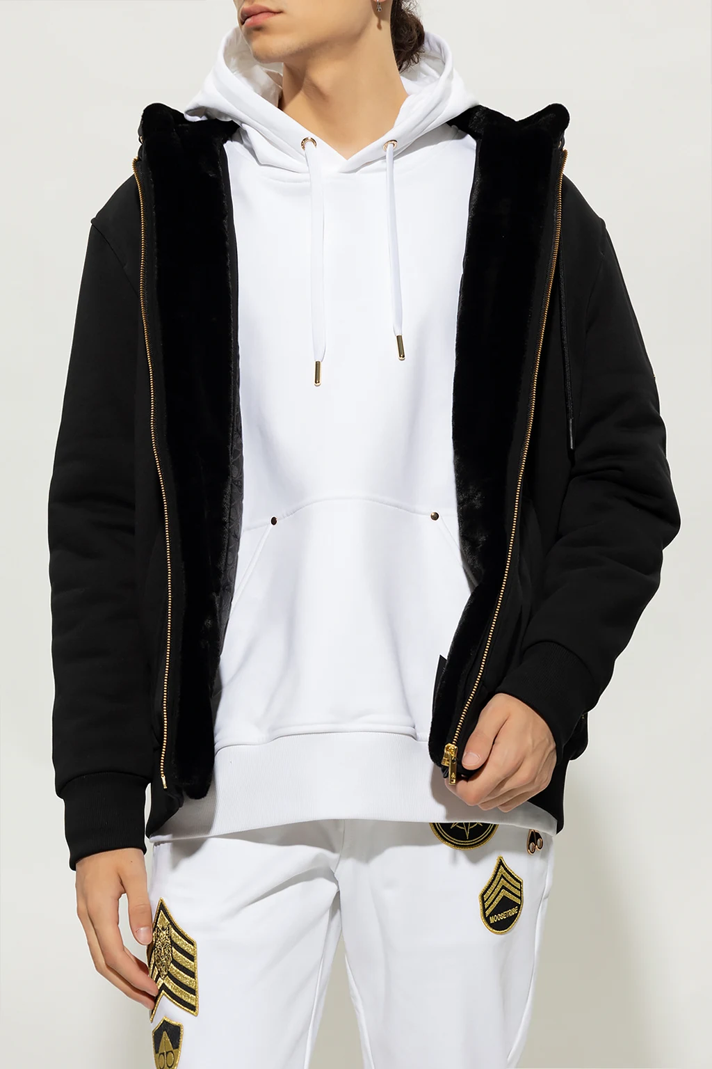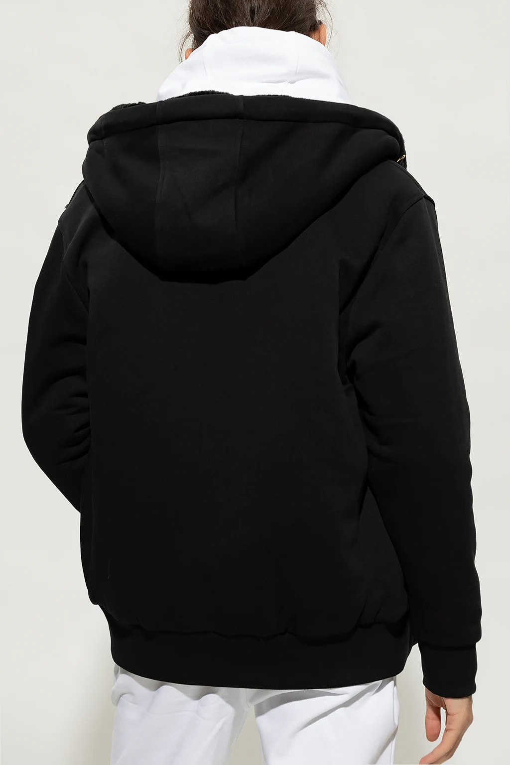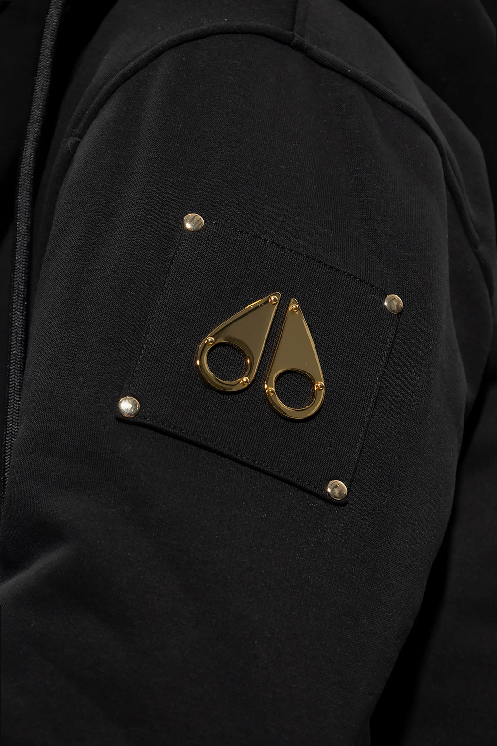Black sweatshirt with a drawcord-adjustable hood from Moose Knuckles. Crafted from cotton and padded with polyester, this style features a zip fastening, a faux-fur trim on the hood, two frontal pockets, a branded sleeve appliqué and an elasticated bottom hem and cuffs.