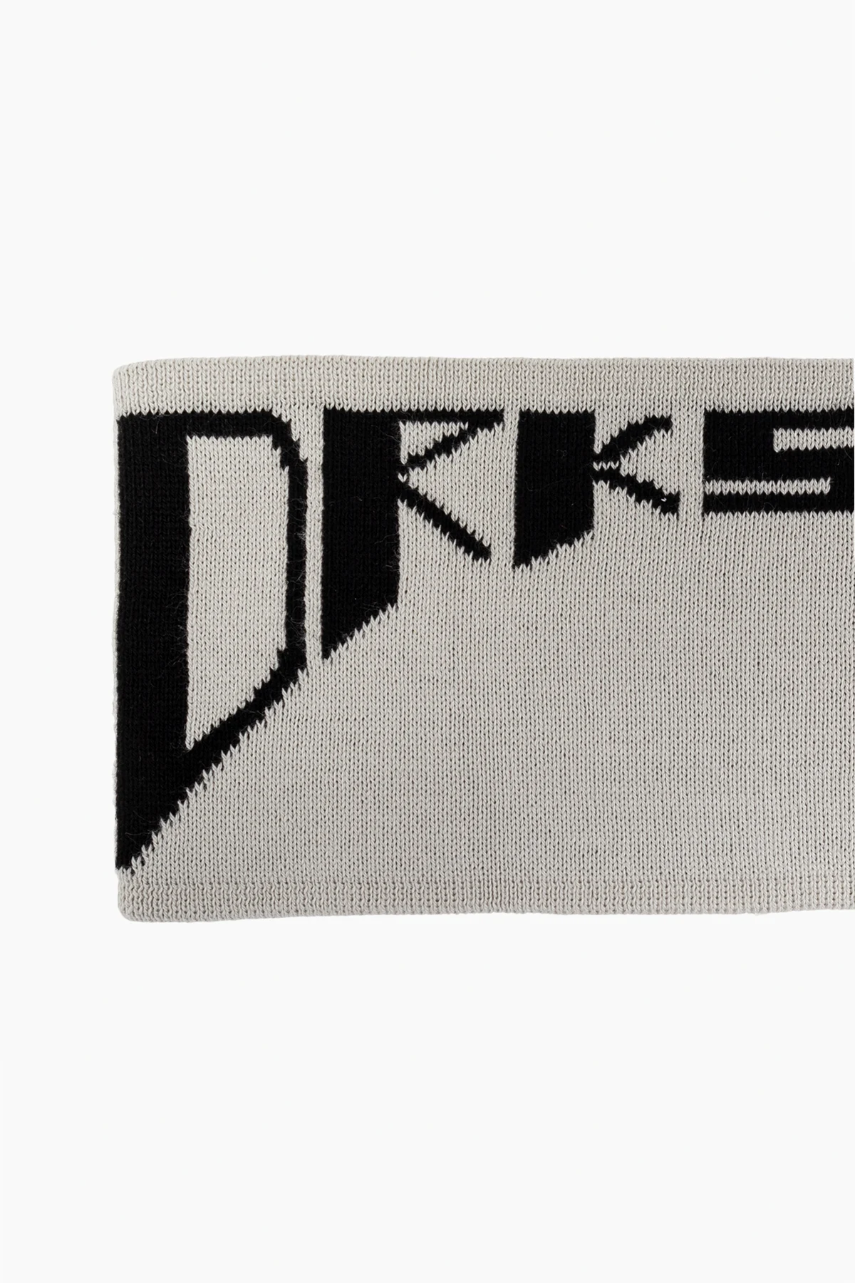 Ein charakteristisches Merkmal des Stirnbands ist der große, schwarze Aufdruck "DRKSHDW", der asymmetrisch auf der Vorderseite platziert ist. Dieses auffällige Detail verleiht ihm einen modernen und dynamischen Charakter und betont den rebellischen Stil des Designers. Das Stirnband hat eine klassische, rechteckige Form und ist breit, was einen bequemen Sitz und effektiven Schutz vor Kälte gewährleistet.