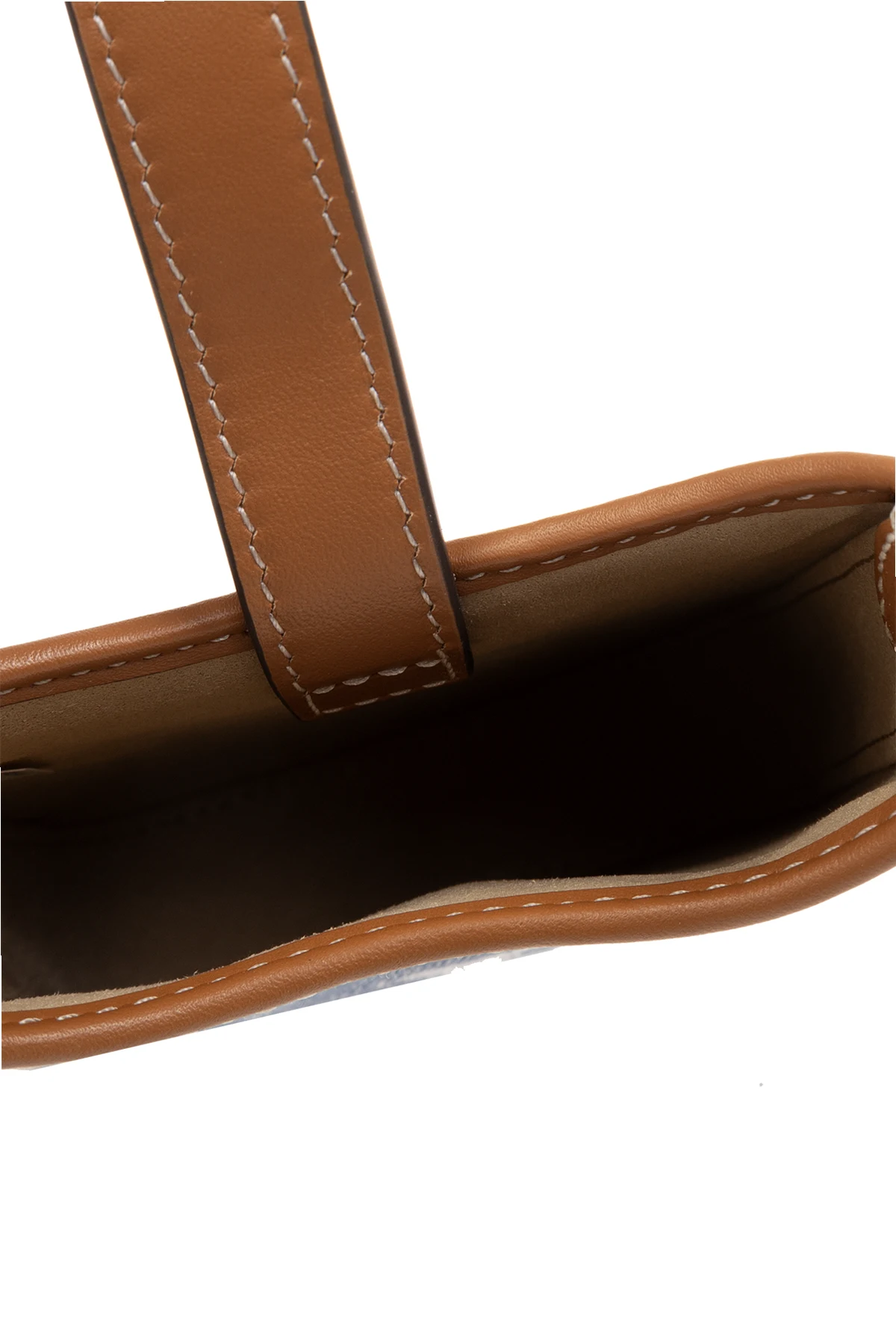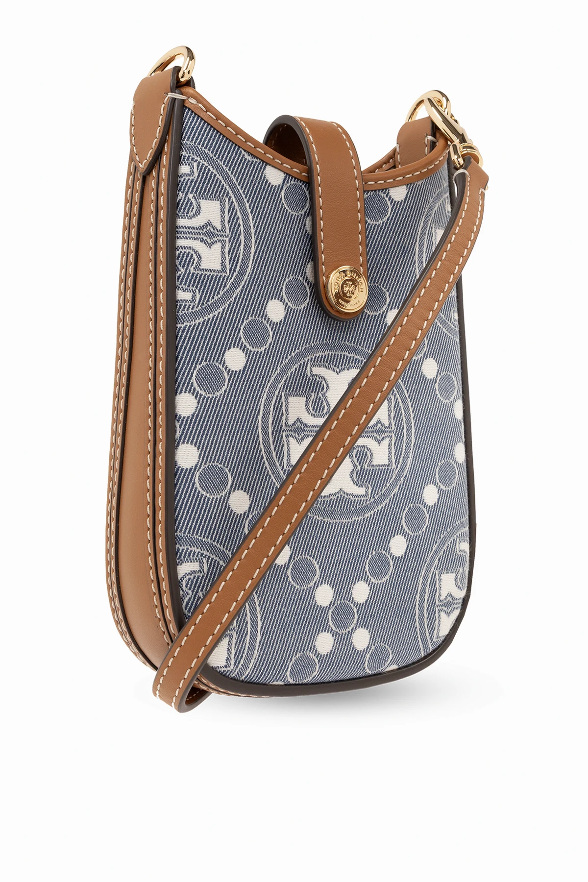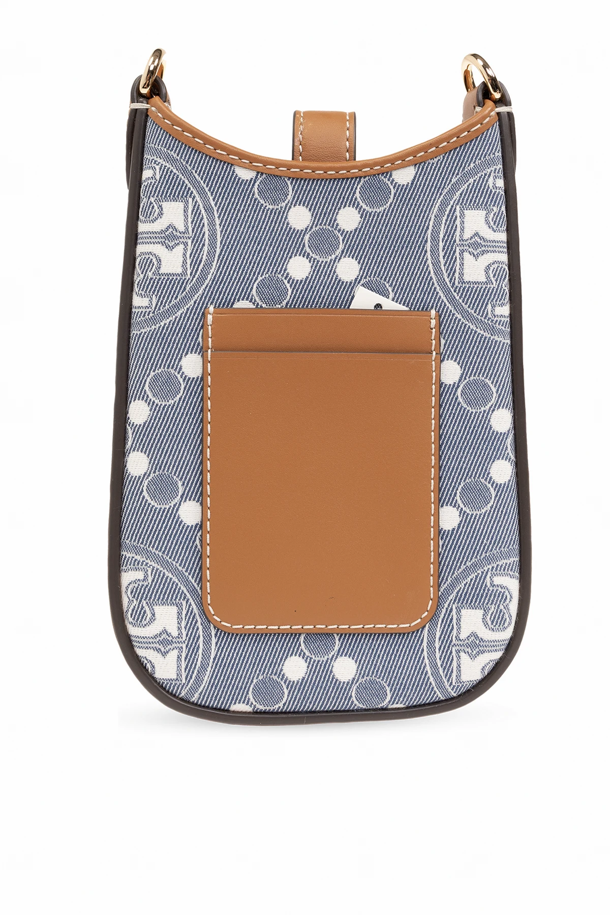 Blue, white and brown ‘T Monogram’ phone pouch from Tory Burch. Made of denim embroidered with a monogram embroidery and leather trims, this model features a snap closure, two card slots at the back, detachable and adjustable strap, one internal compartment and gold-tone metal hardware