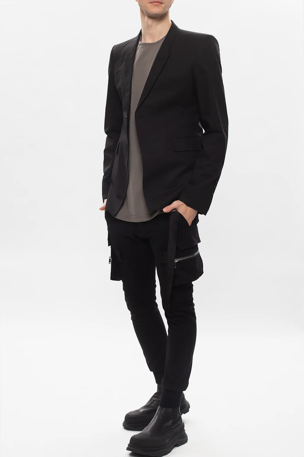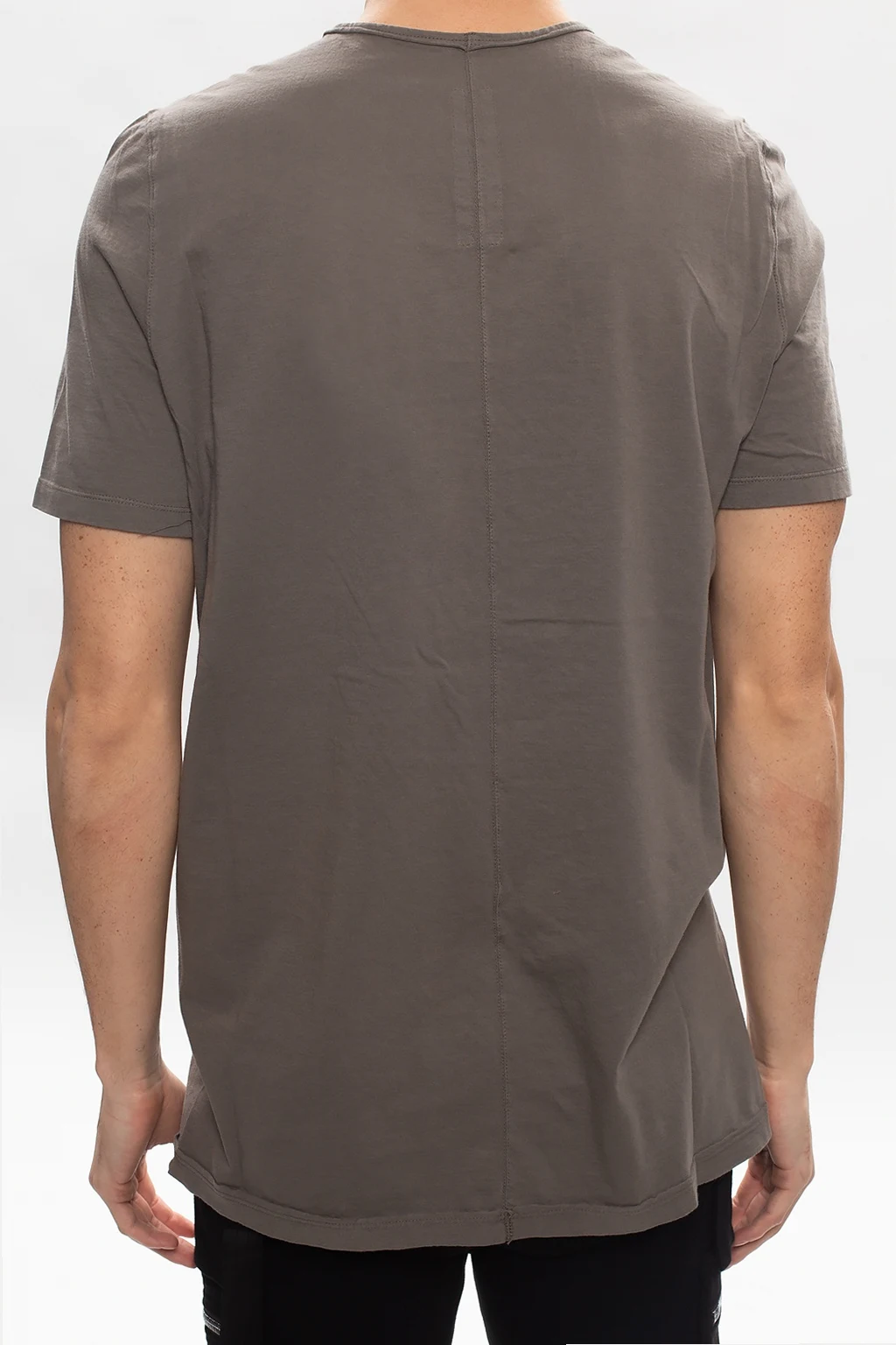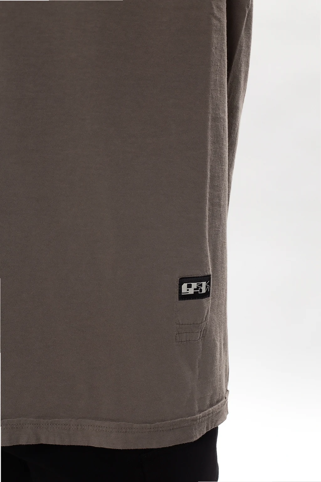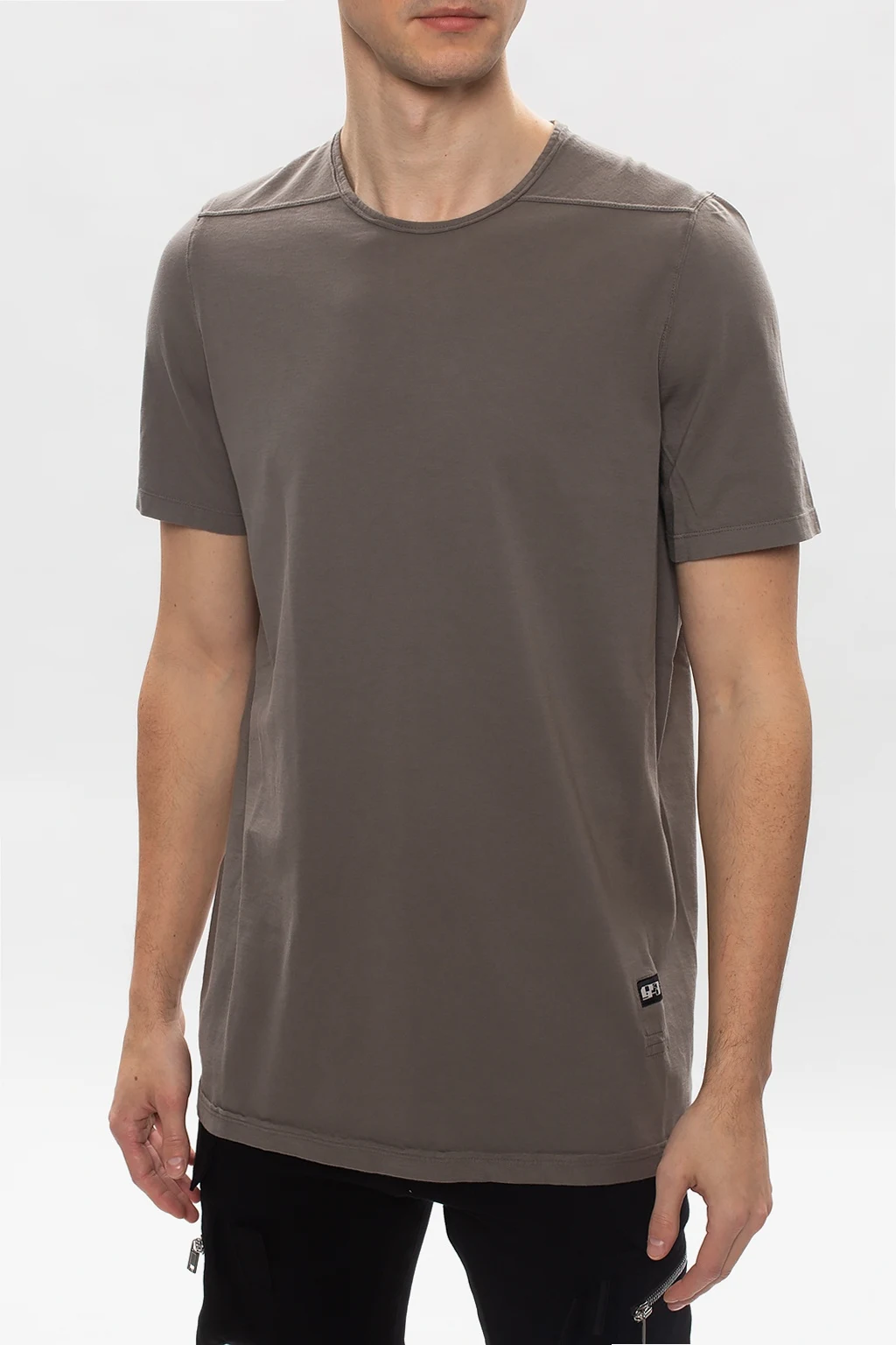 Grey crewneck T-shirt from Rick Owens DRKSHDW. Cut from cotton with an oversize silhouette, this style boasts a branded patch, a sewn-on black strap and a distressed edge at the collar.