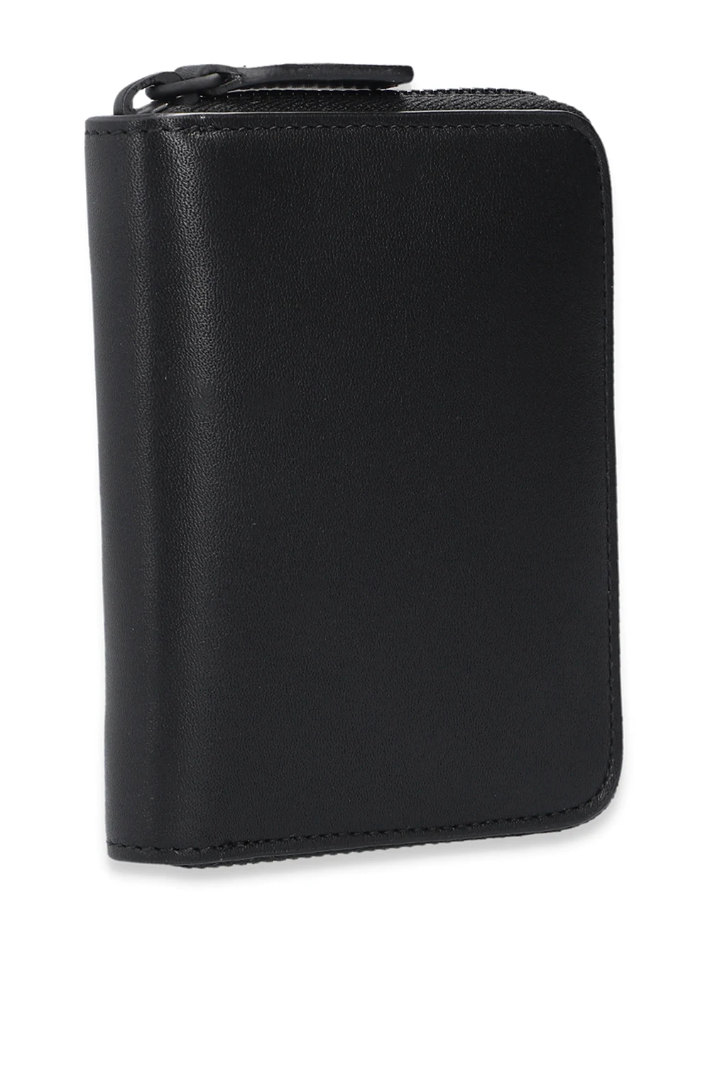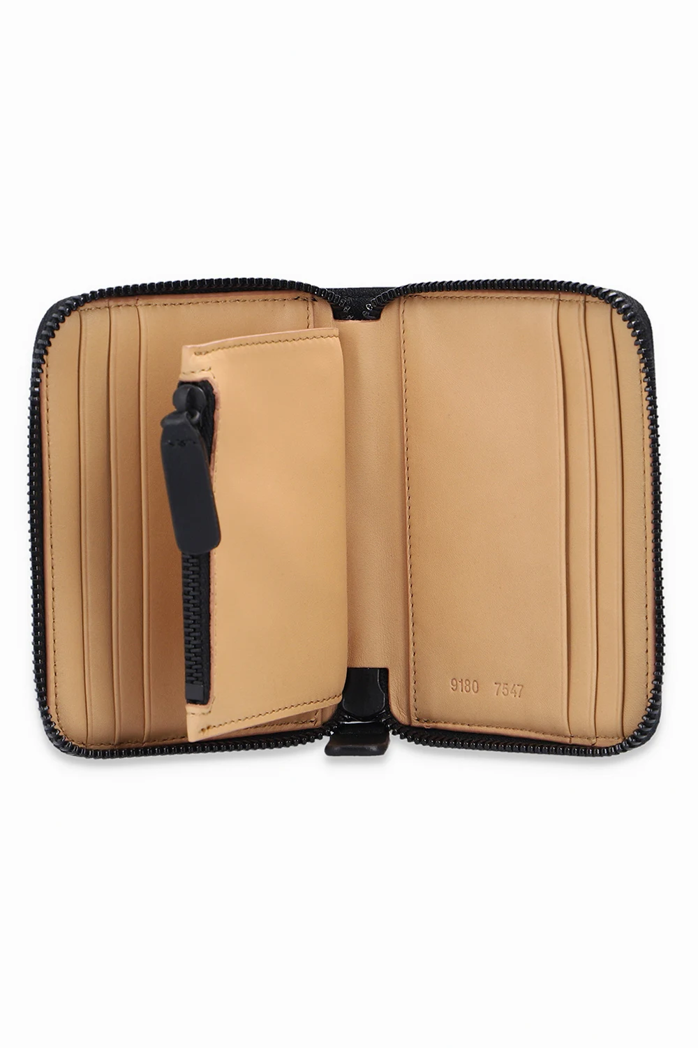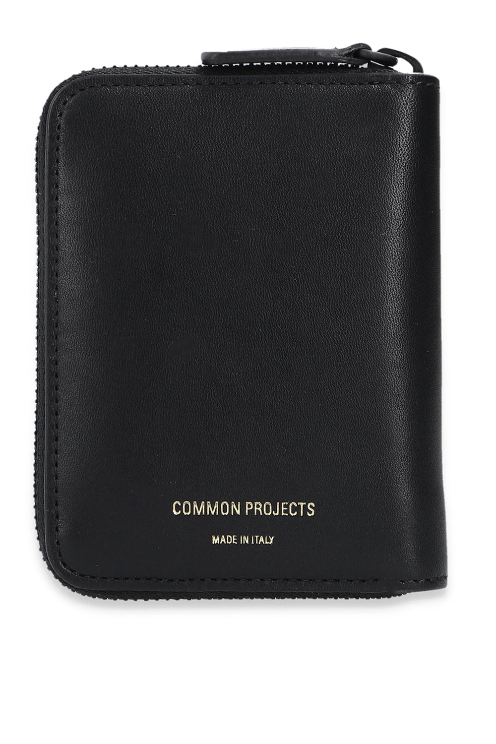 Black wallet from Common Projects. Crafted from leather, this design fastens via a zipper and showcases a gold-tone logo detail and a light brown-clad interior with a coin pocket and six card slots.