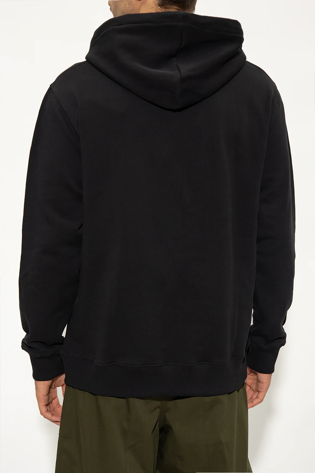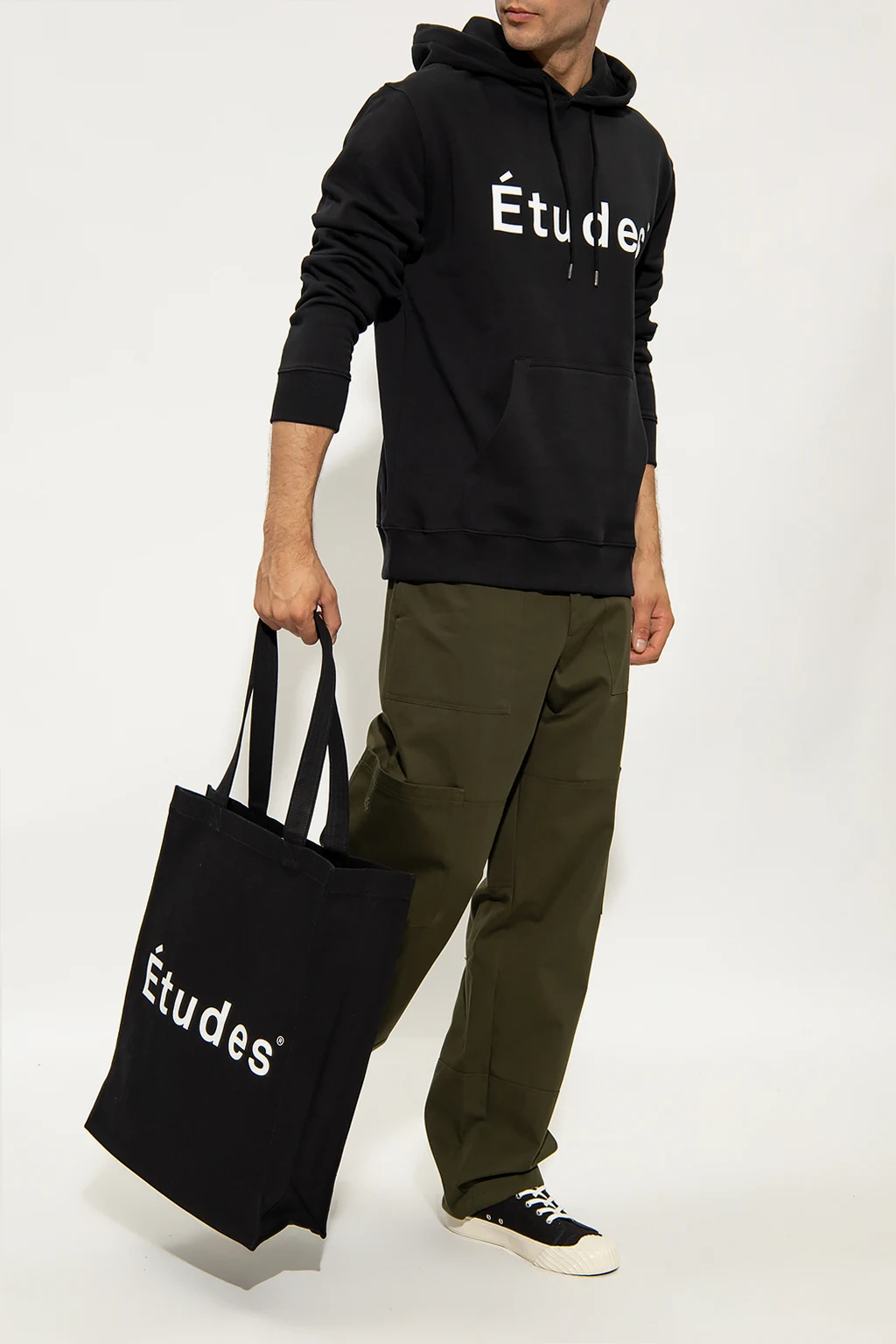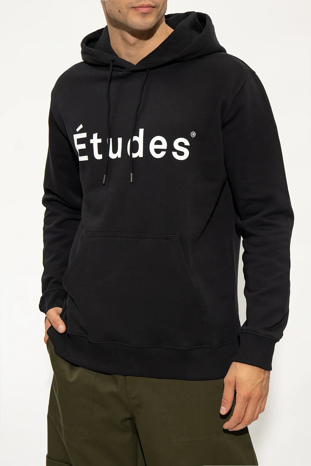 Black sweatshirt with a drawcord-adjustable hood from Etudes. Crafted from organic cotton, this style features a printed white logo on the front, a kangaroo pocket and a ribbed bottom hem and cuffs.