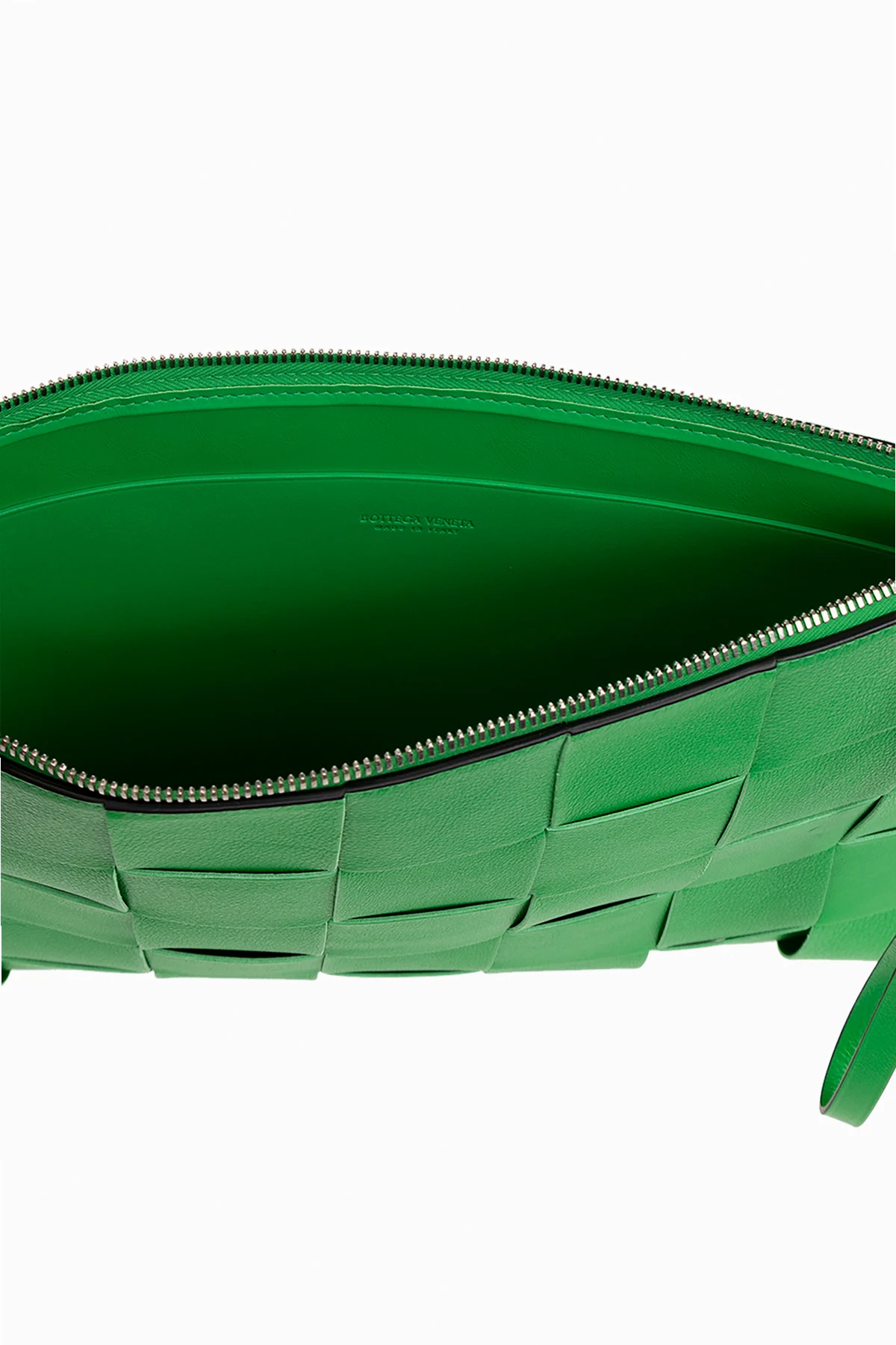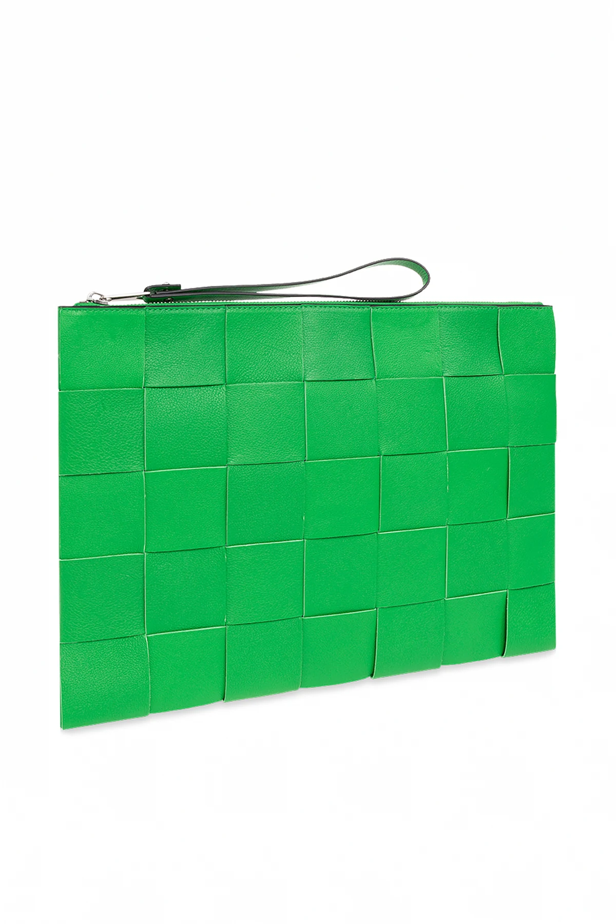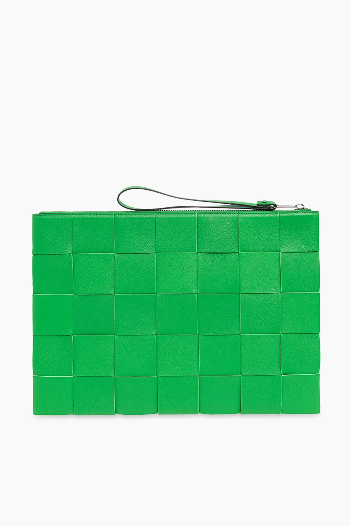 Green ‘Pouch Large’ handbag from Bottega Veneta. Crafted from calf leather and lamb leather accentuated with the brand's iconic Intreccio weave, this design secures with a metal zipper with a wrist strap and features silver-tone metal hardware and one internal compartment with a slip pocket.
