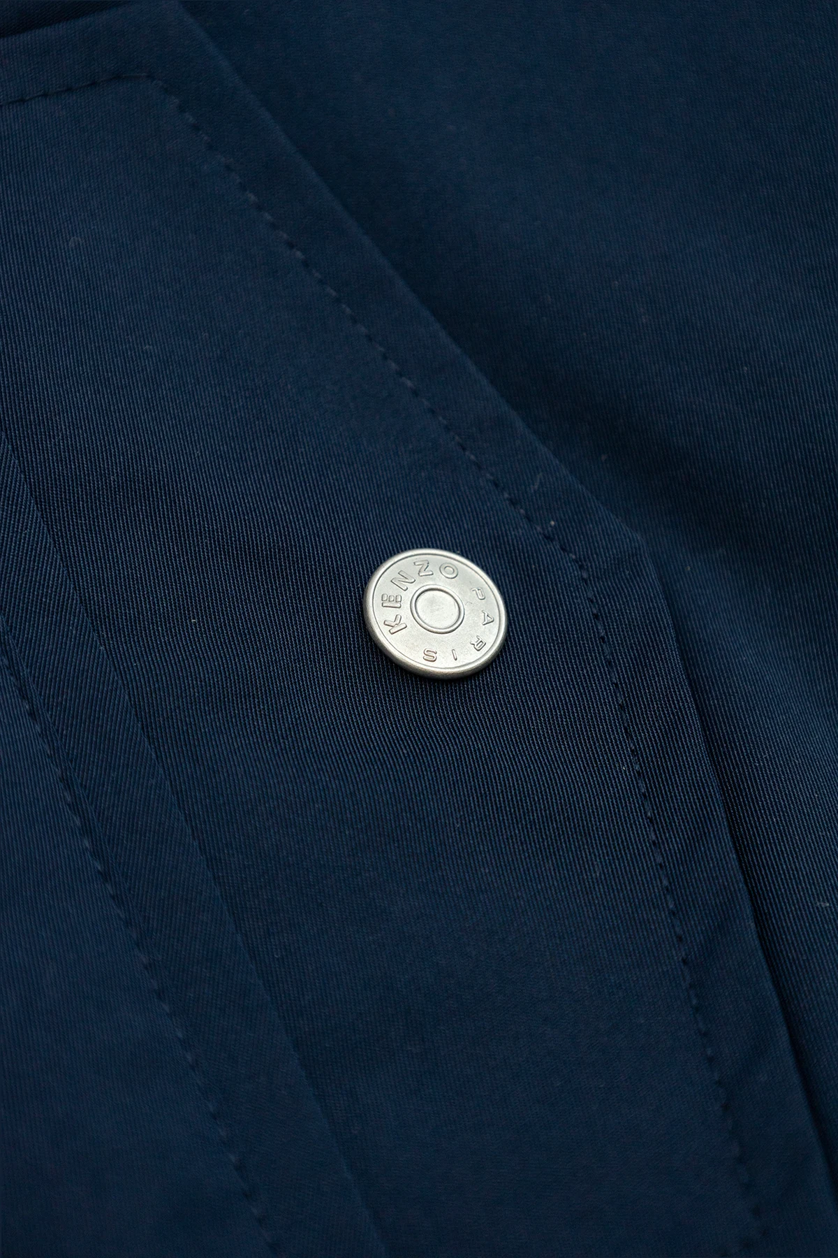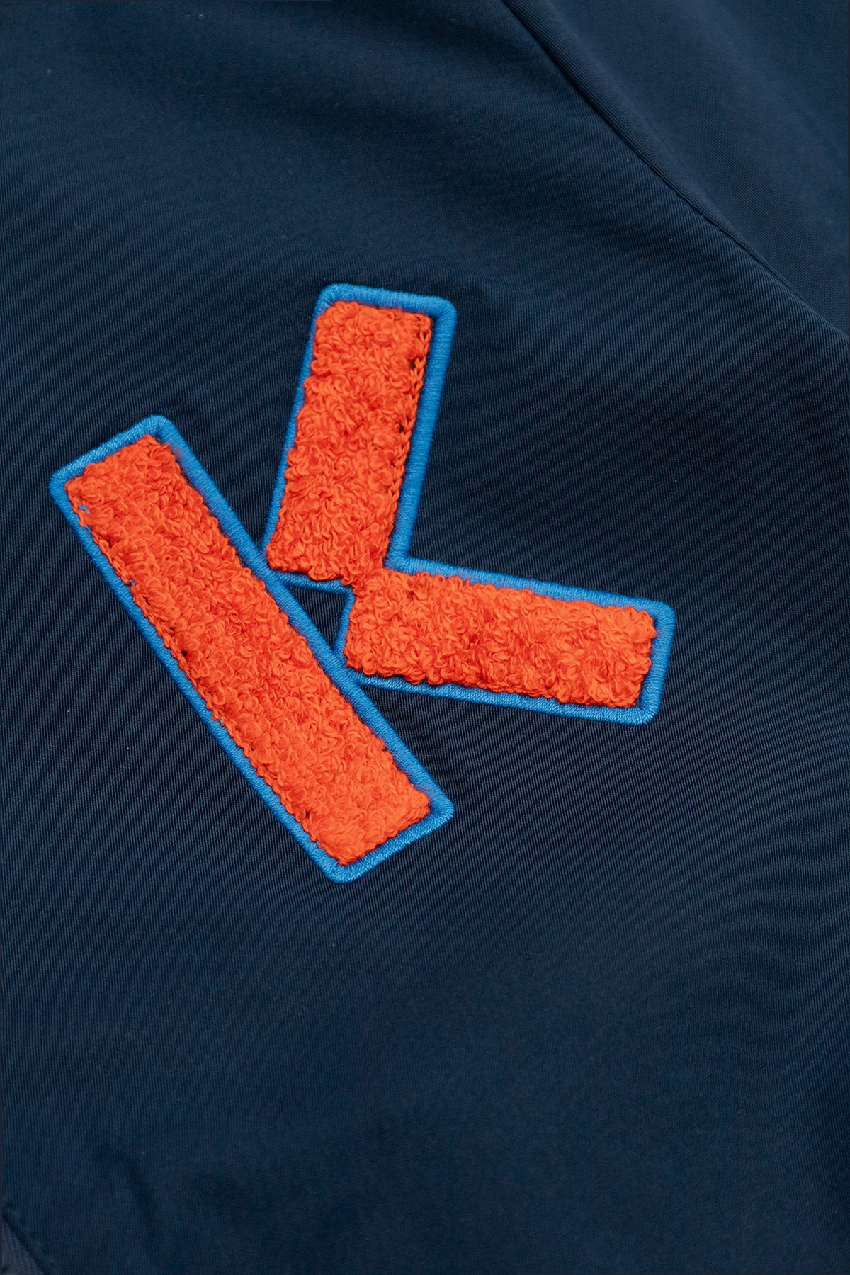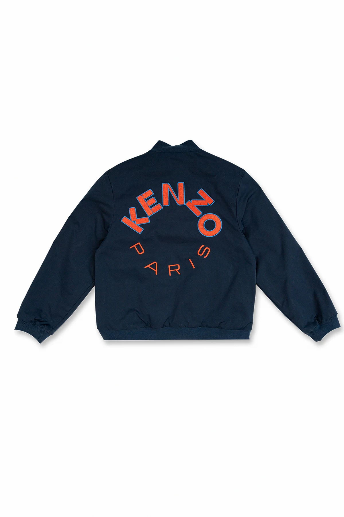 Insulated bomber jacket in navy blue from Kenzo Kids. Embellished with a red and blue logo print, this style features a zip fastening, two flapped pockets with snaps and ribbed trims on the collar, bottom hem and cuffs.