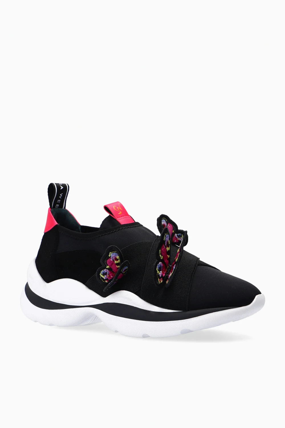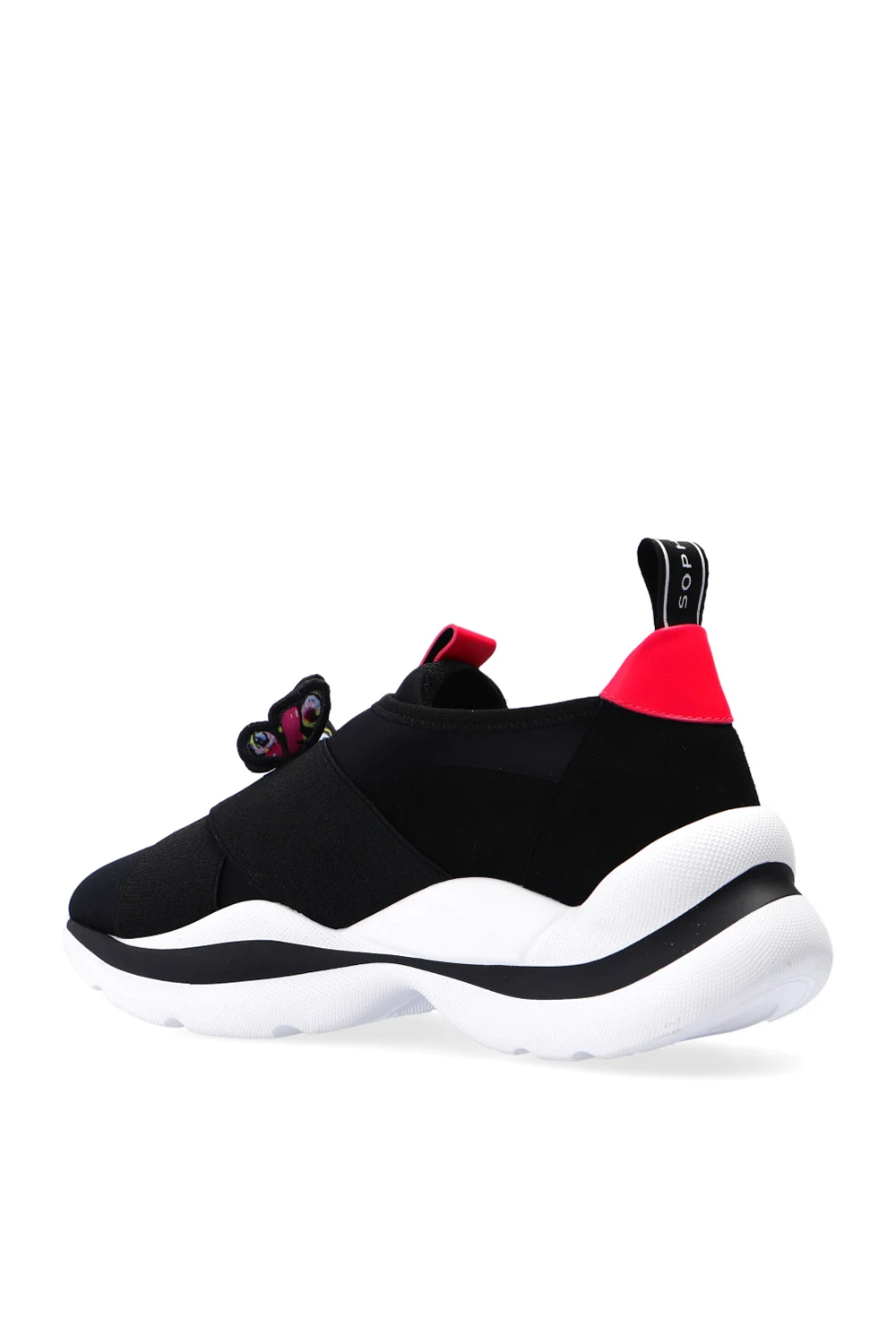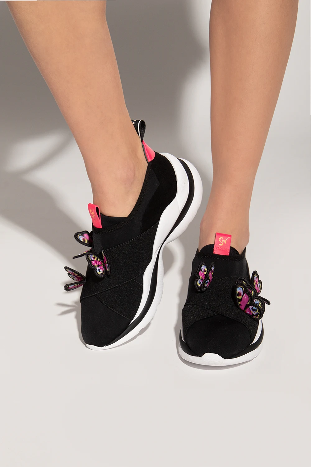 Black, white and pink ‘Riva’ slip-on shoes from Sophia Webster. Trimmed with leather, this slip-on design features a logo detail, the label’s signature multicolored butterfly and a white rubber sole.