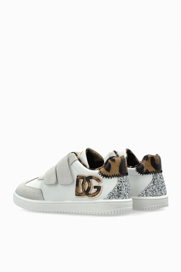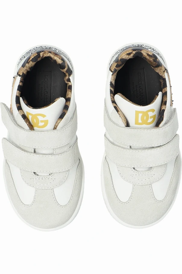 Sportschuhe mit Logo und glänzenden Applikationen von Dolce & Gabbana Kids begeistern durch eine raffinierte Ästhetik, die die klassische Form von Sneakern mit einem modernen Akzent verbindet. Die dominierende Farbe des Schuhwerks ist Weiß , betont durch glattes Leder sowie eine subtile Kombination aus matten und wildledernen Einsätzen an den Klettverschlüssen und der Schuhspitze. Zwei breite Klettverschlüsse sorgen für Komfort und einfaches An- und Ausziehen und machen das Produkt äußerst praktisch für Kinder.
