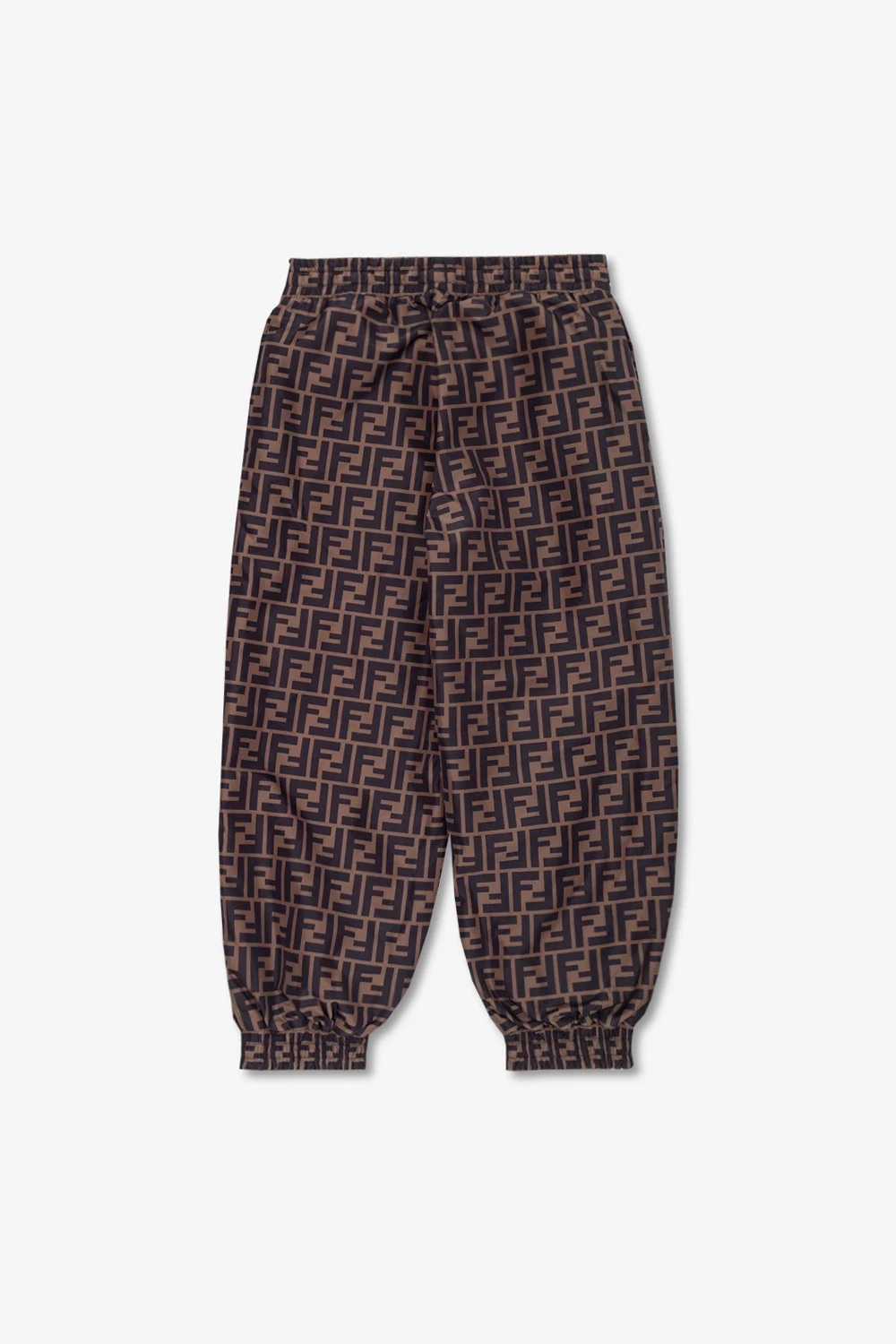 Reversible trousers in brown and black from Fendi Kids. Embellished with a monogram pattern, this pair features a drawstring waistband, two slip pockets, elasticated cuffs and a yellow cotton interior.