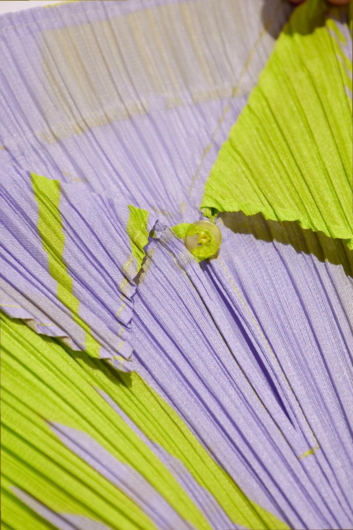 Wir laden Sie ein, das Top mit Kragen von Issey Miyake aus der Kollektion Pleats Please zu entdecken, das die Quintessenz von Raffinesse und Modernität darstellt. Das vorgestellte Modell zieht die Aufmerksamkeit mit seiner neonfarbenen Palette auf sich, in der Gelb- und Grüntöne dominieren, harmonisch durchbrochen von violetten Akzenten. Eine einzigartige Textur und Tiefe verleiht ihm der plissierte Stoff, auf dem sich abstrakte, pflanzliche Motive mit Anmut ausbreiten.