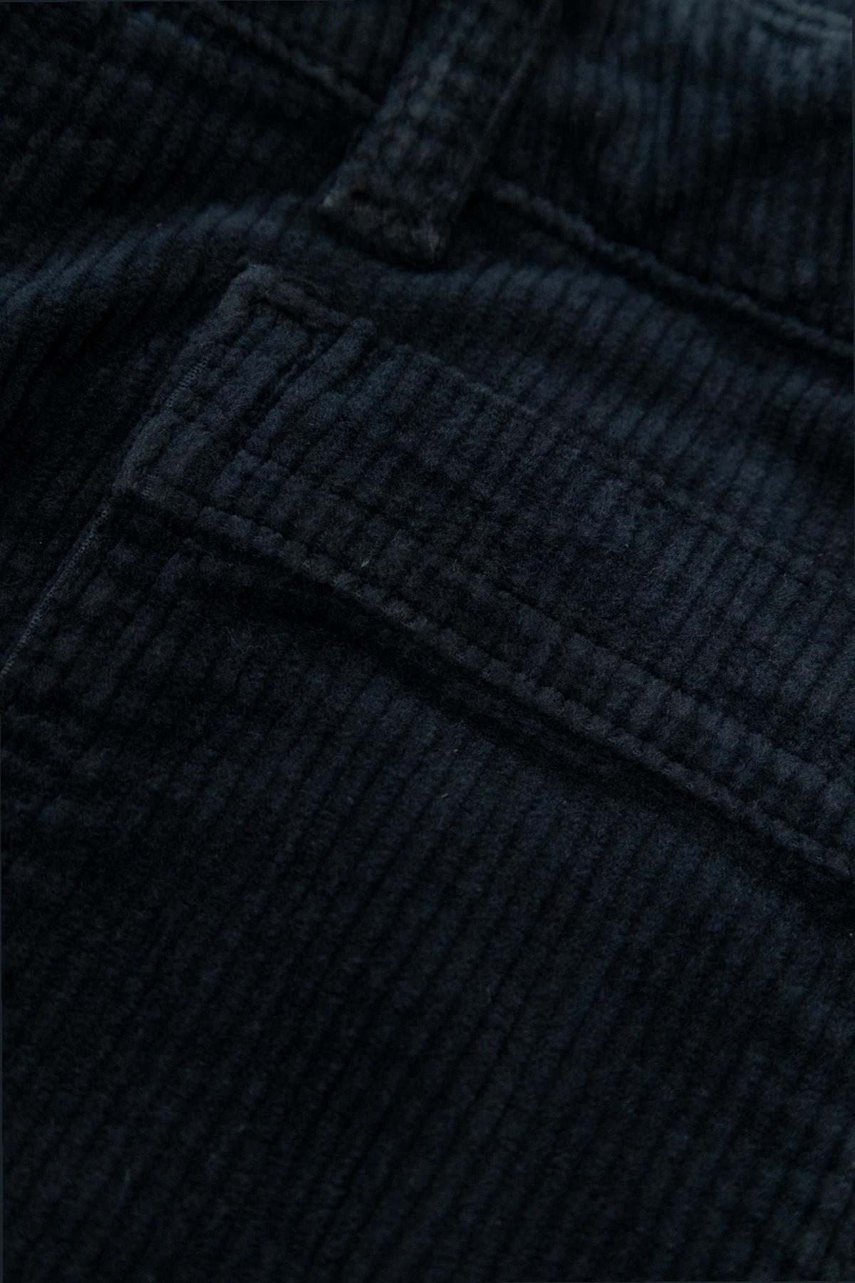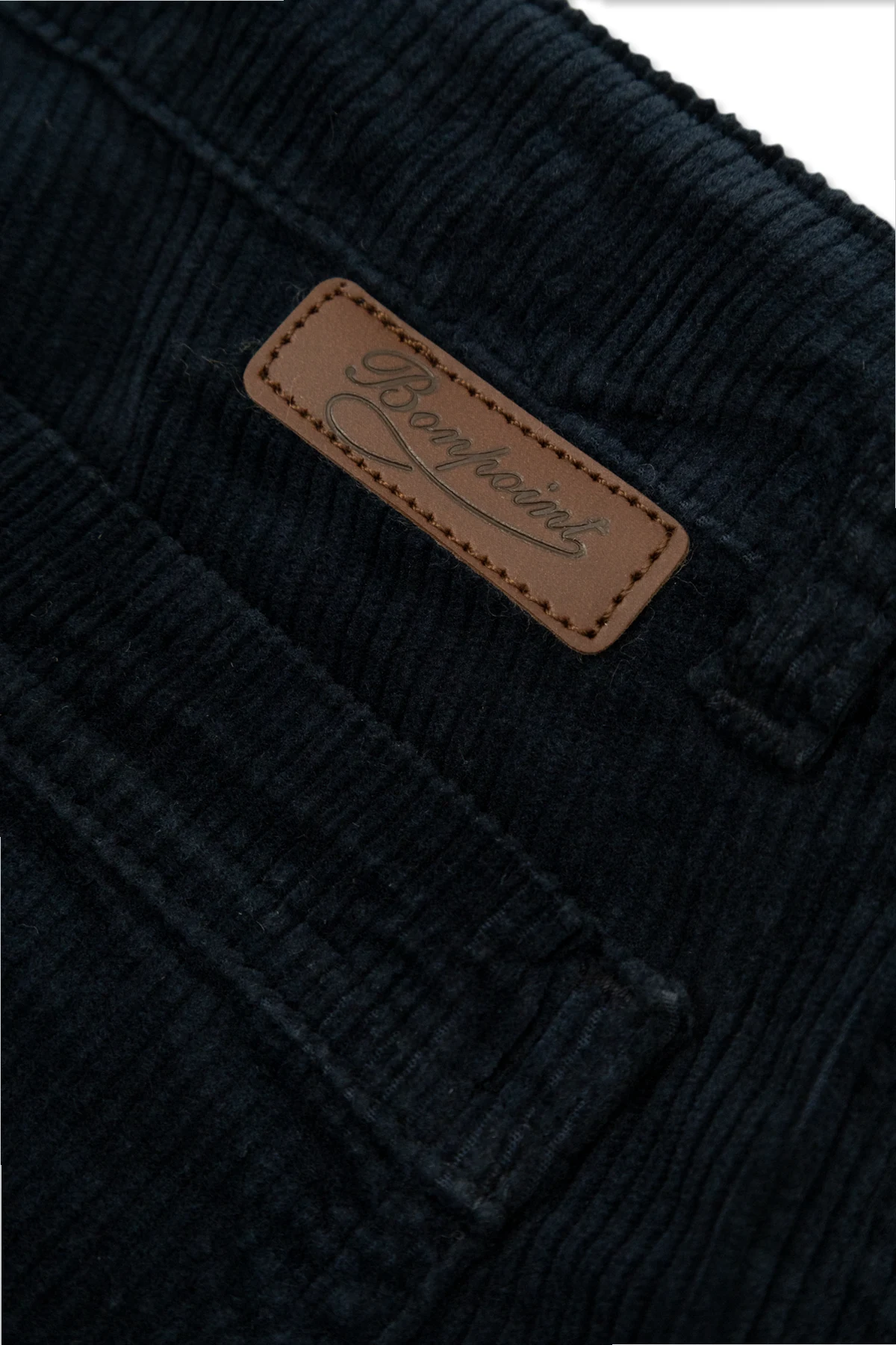 Die marineblaue Farbe dominiert die gesamte Oberfläche der Hosen, und das charakteristische gerippte Muster verleiht ihnen eine subtile Eleganz. Große Vordertaschen sowie zwei hintere Taschen bieten Praktikabilität, und ein kleines Etikett mit der Aufschrift "Bonpoint" aus braunem Leder auf der hinteren Tasche fügt einen exklusiven Akzent hinzu.