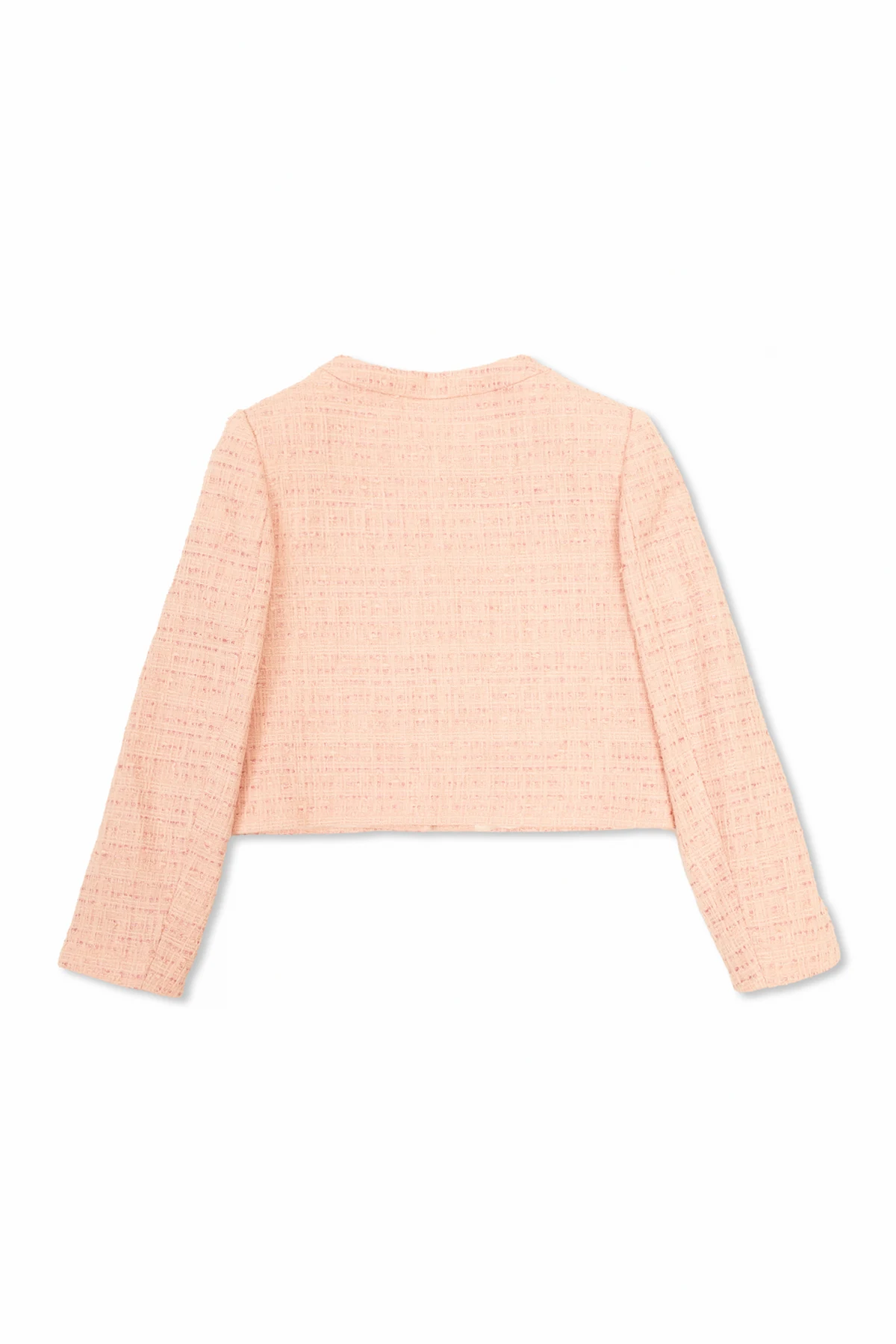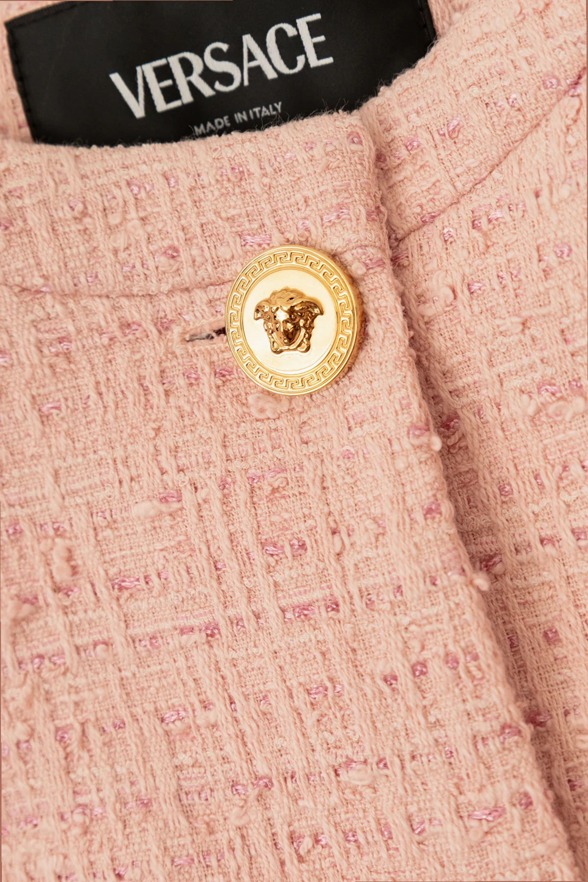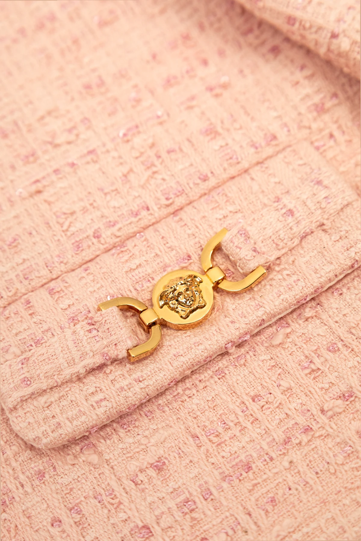 Wir präsentieren Ihnen eine raffinierte, tweedige Jacke in einem dezenten Rosaton, die die Quintessenz von Luxus und verfeinertem Geschmack darstellt. Dieses kurze Modell mit langen Ärmeln, die mit einem geraden Manschettenabschluss enden, strahlt außergewöhnliche Eleganz aus. Charakteristisch für dieses Stück ist der runde Ausschnitt ohne Kragen und der Verschluss mit goldenen Knöpfen, die mit einem einzigartigen Motiv verziert sind und die Zugehörigkeit zu den exklusiven Kollektionen von Versace Kids bezeugen.