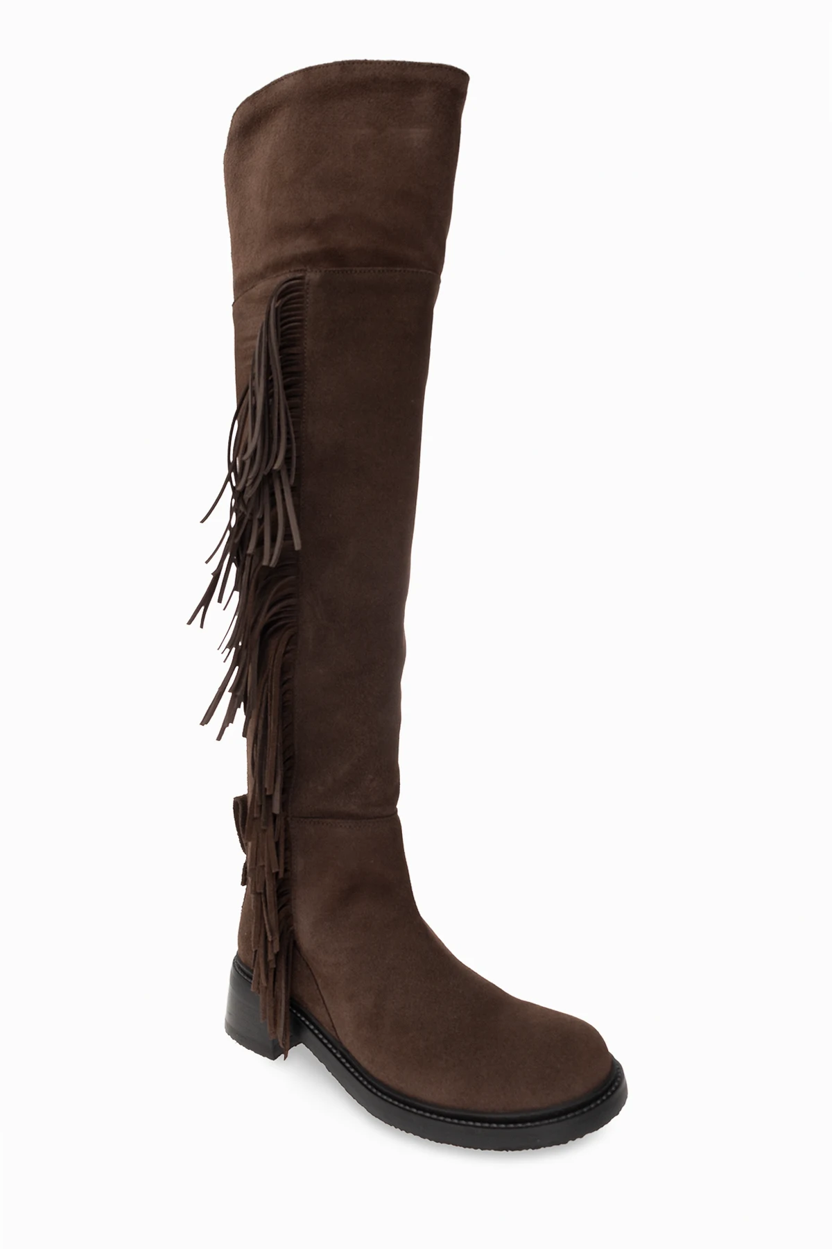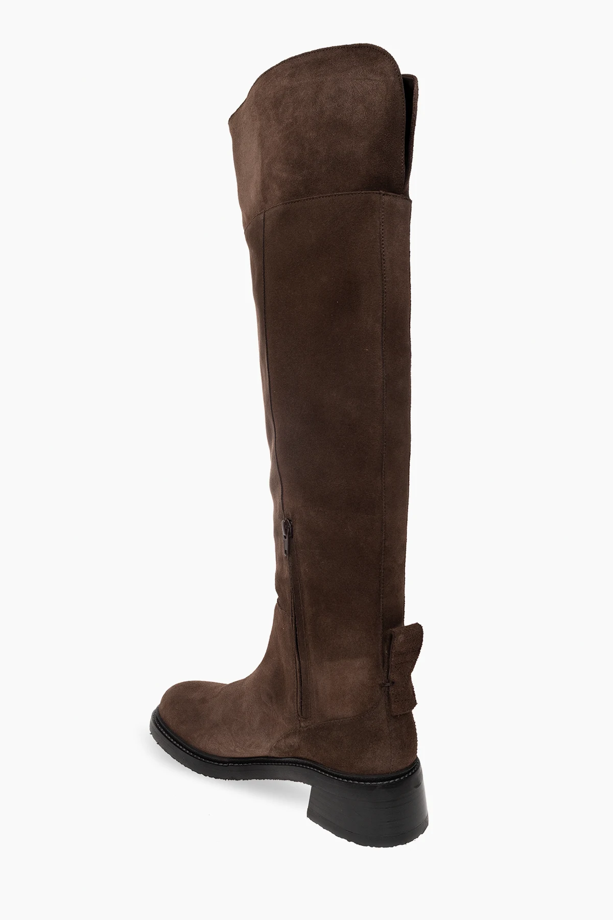 Dark brown ‘Joice’ suede boots from See By Chloe. Made of suede with a round toe, this model sits on a black rubber sole and features a side short zipper and fringe detailing.