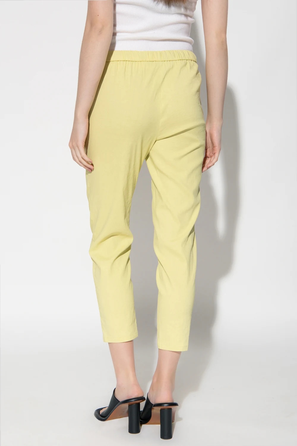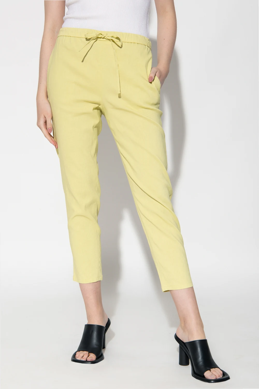 Green trousers from Theory. Made of linen, this pair falls with tapered legs and features a drawstring waist and two slip pockets.
