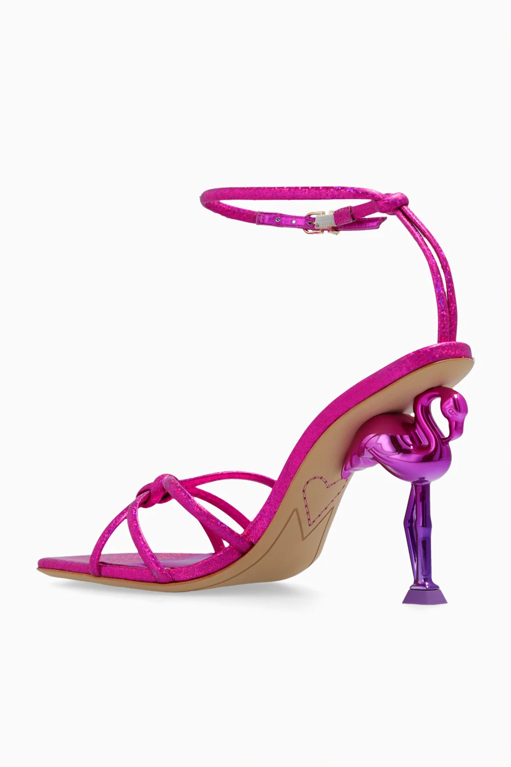 Pink ‘Flo Flamingo’ heeled sandals from Sophia Webster. Made of glittery leather with a square toe, this model sits on a beige leather sole and features an adjustable ankle strap and a decorative flamingo-shaped heel in pink and purple with a gradient effect,