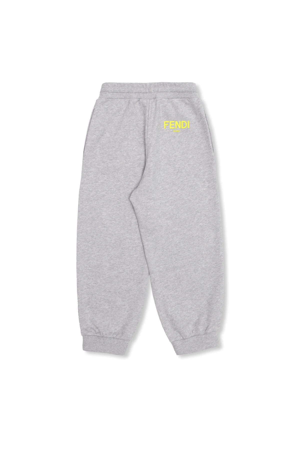 Grey sweatpants from Fendi Kids. Made of cotton, this pair is cinched with drawstrings at the waistband and showcases a neon yellow logo print and elasticated cuffs.