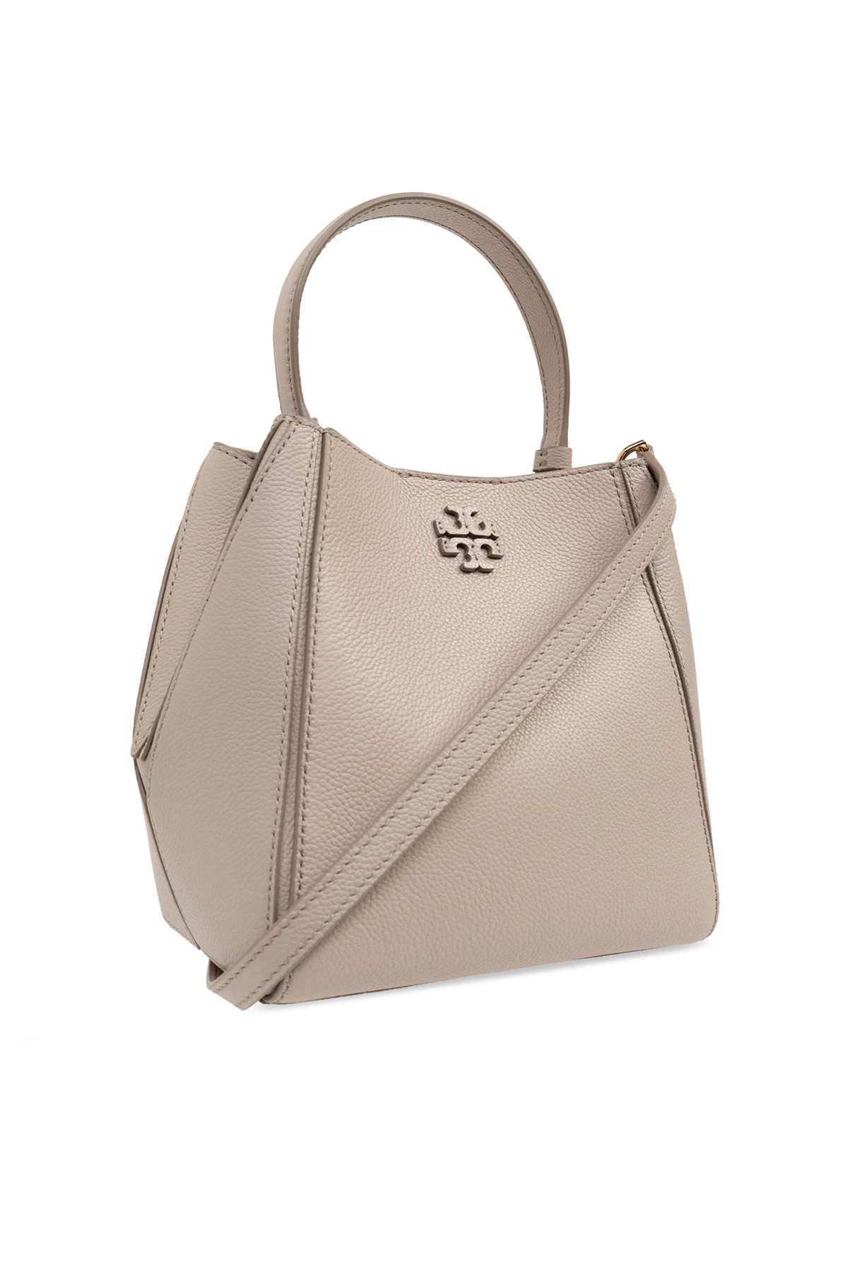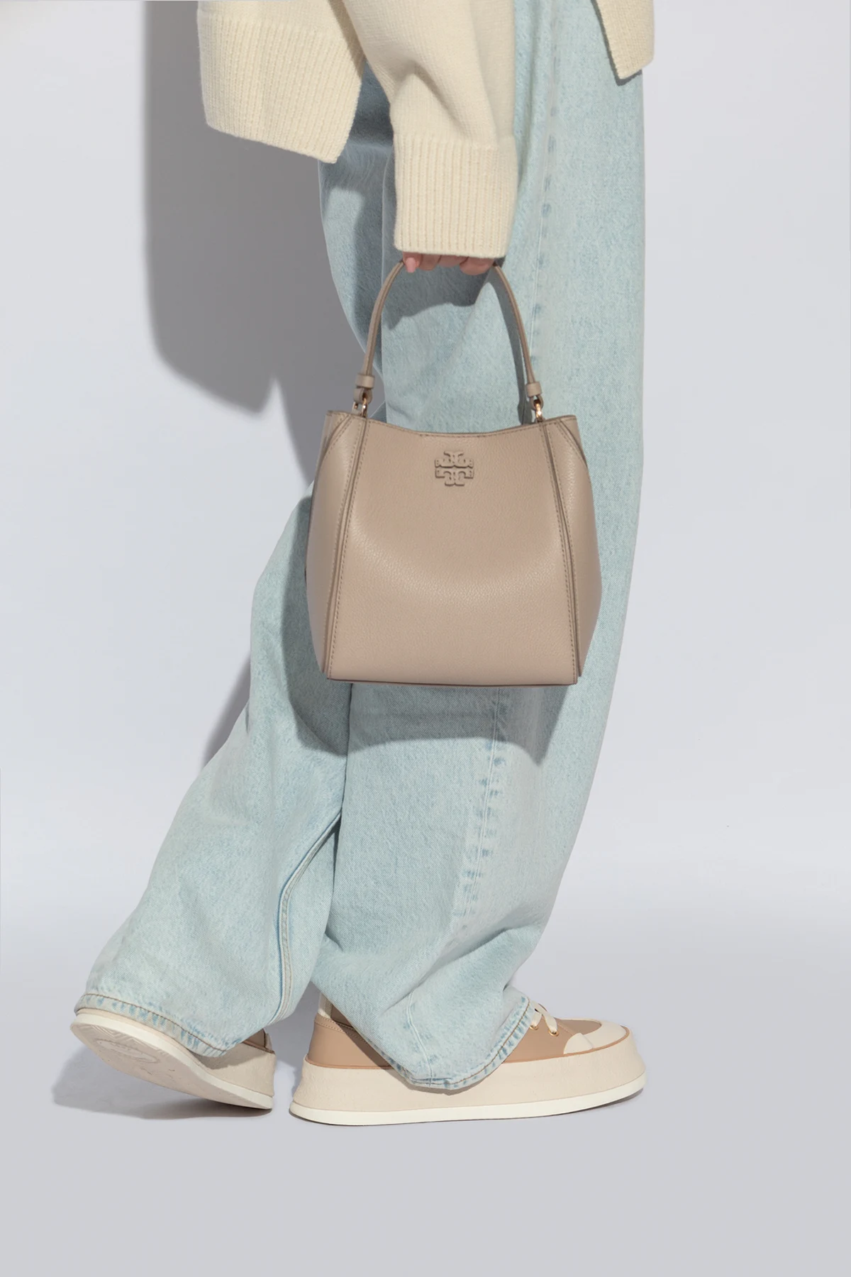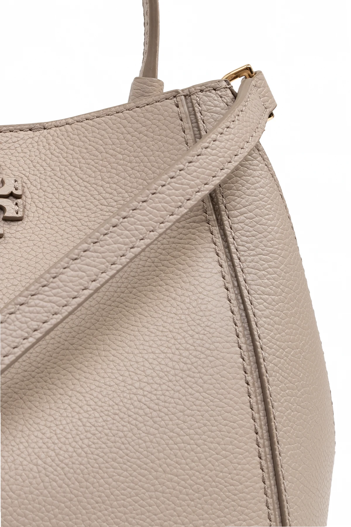Wir präsentieren Ihnen die Quintessenz von Eleganz und Funktionalität - die Schultertasche Mcgraw Small vom renommierten Designer Tory Burch . Gefertigt aus hochwertigem genarbtem Leder in Grau-Beige-Tönen, besticht diese flache Tasche durch ihre subtile Ästhetik und raffinierte Designkunst. Auf ihrer Vorderseite, knapp unter dem oberen Rand, prangt stolz das metallene Logo des Designers und verleiht dem Ganzen einen exklusiven Charakter.