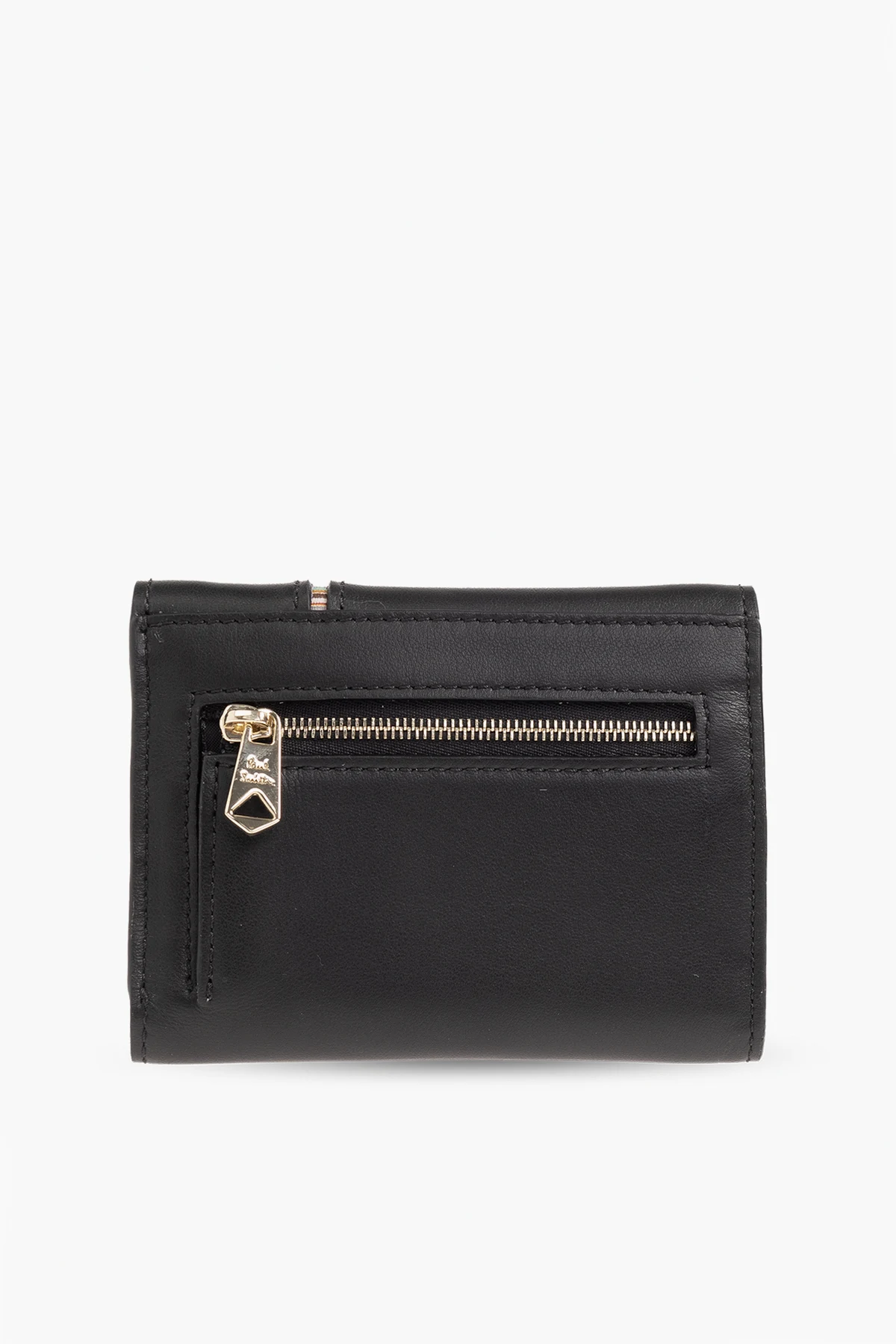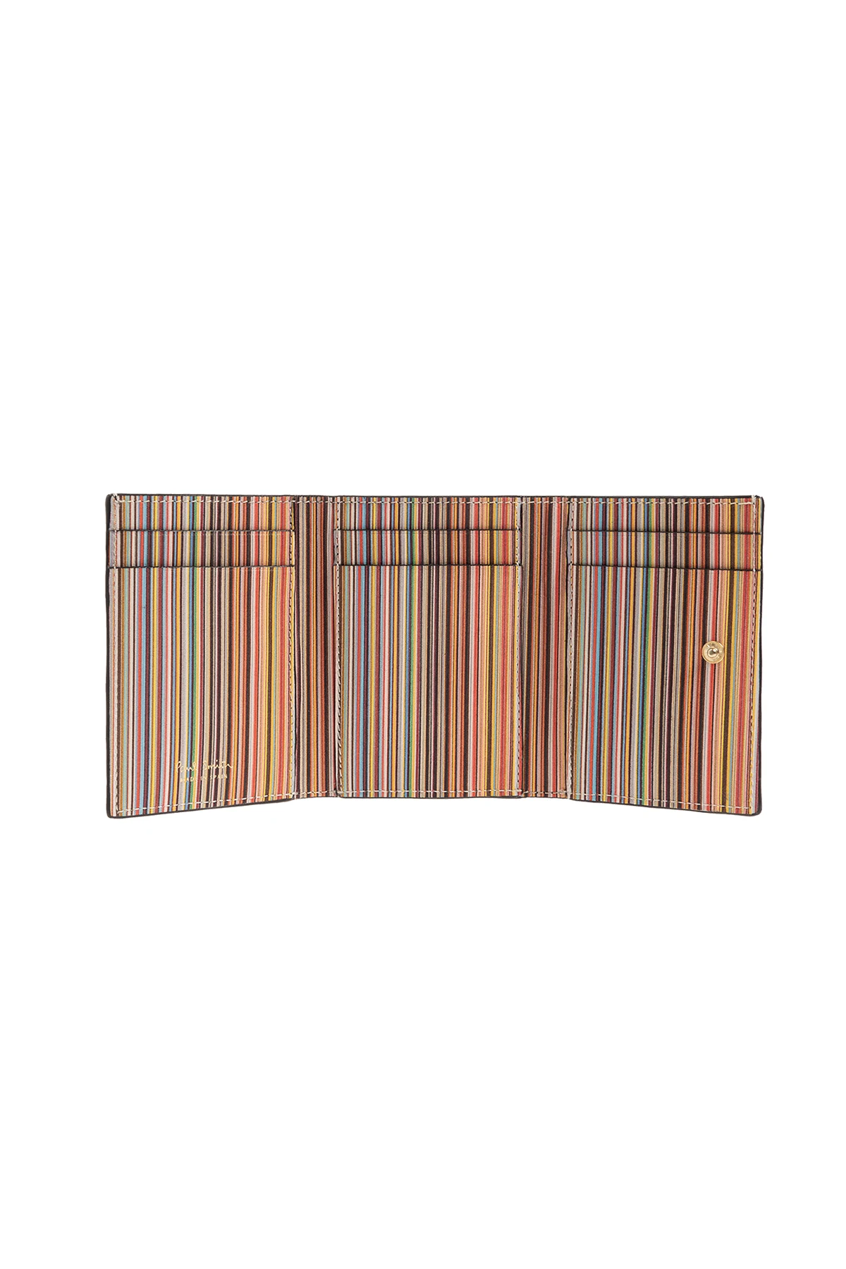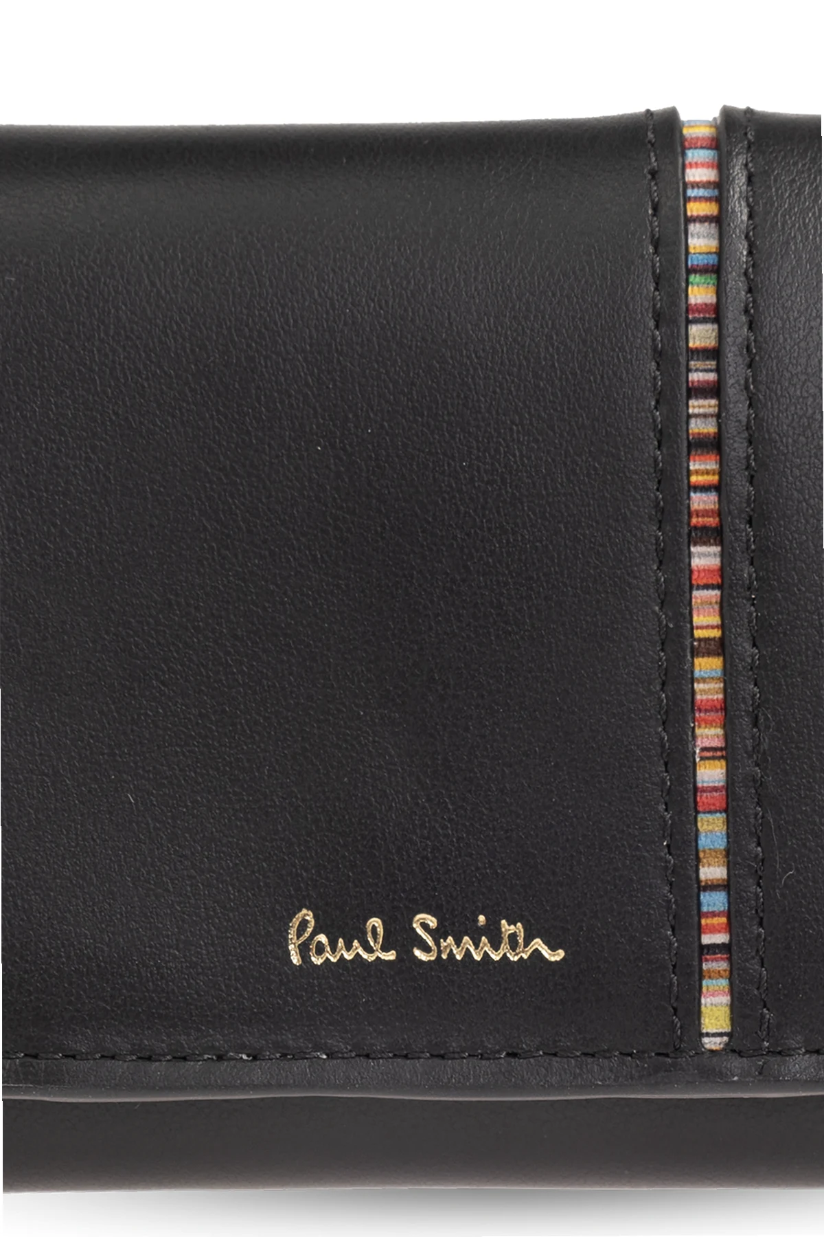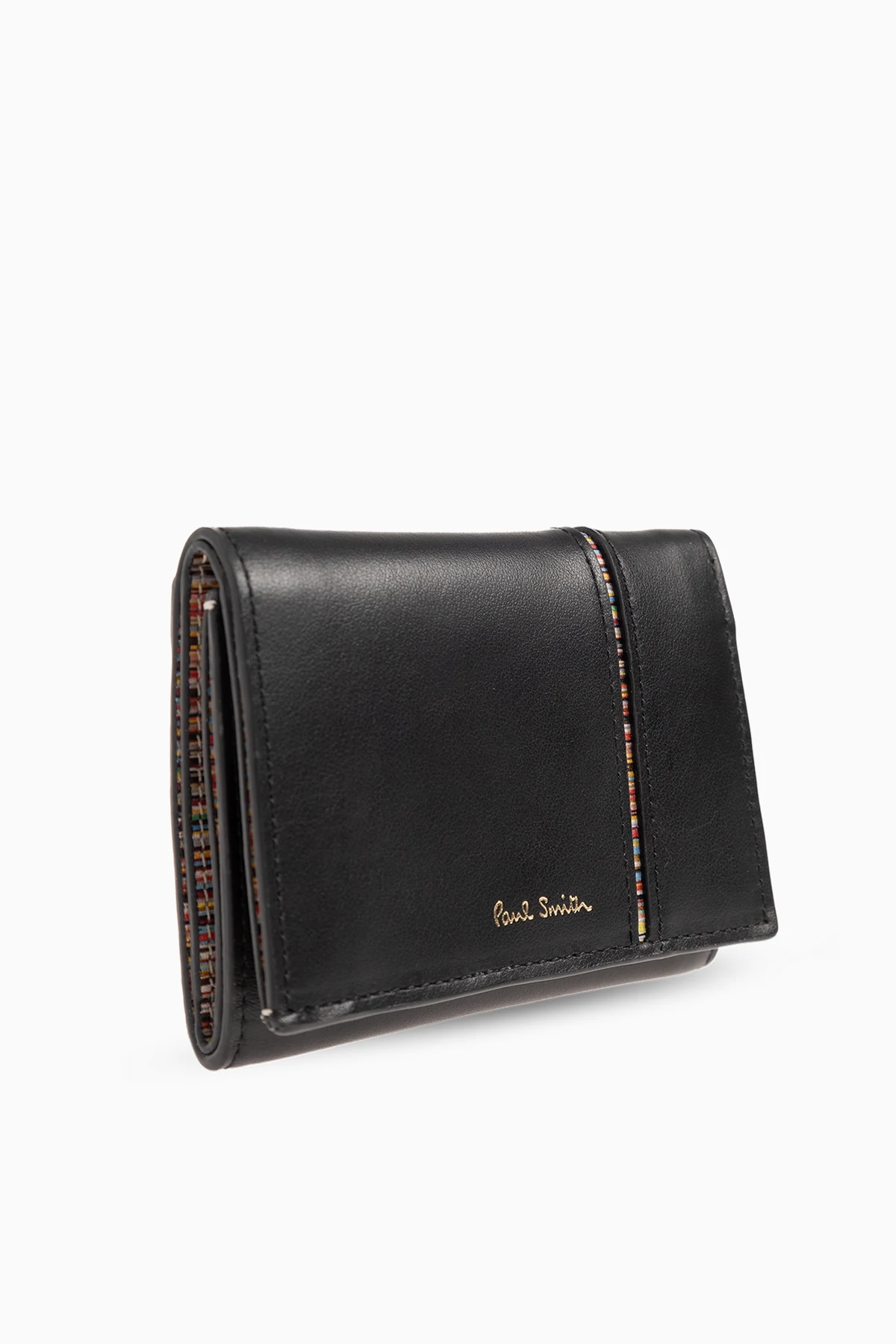 Black folding wallet from Paul Smith. Made from smooth leather, this item fastens via a snap and showcases a colourful insert with signature stripe trim and gold-tone logo print on the front one zip coin pocket on the back as well as one bill pocket, six card slots and a colourful lining with stripes inside.