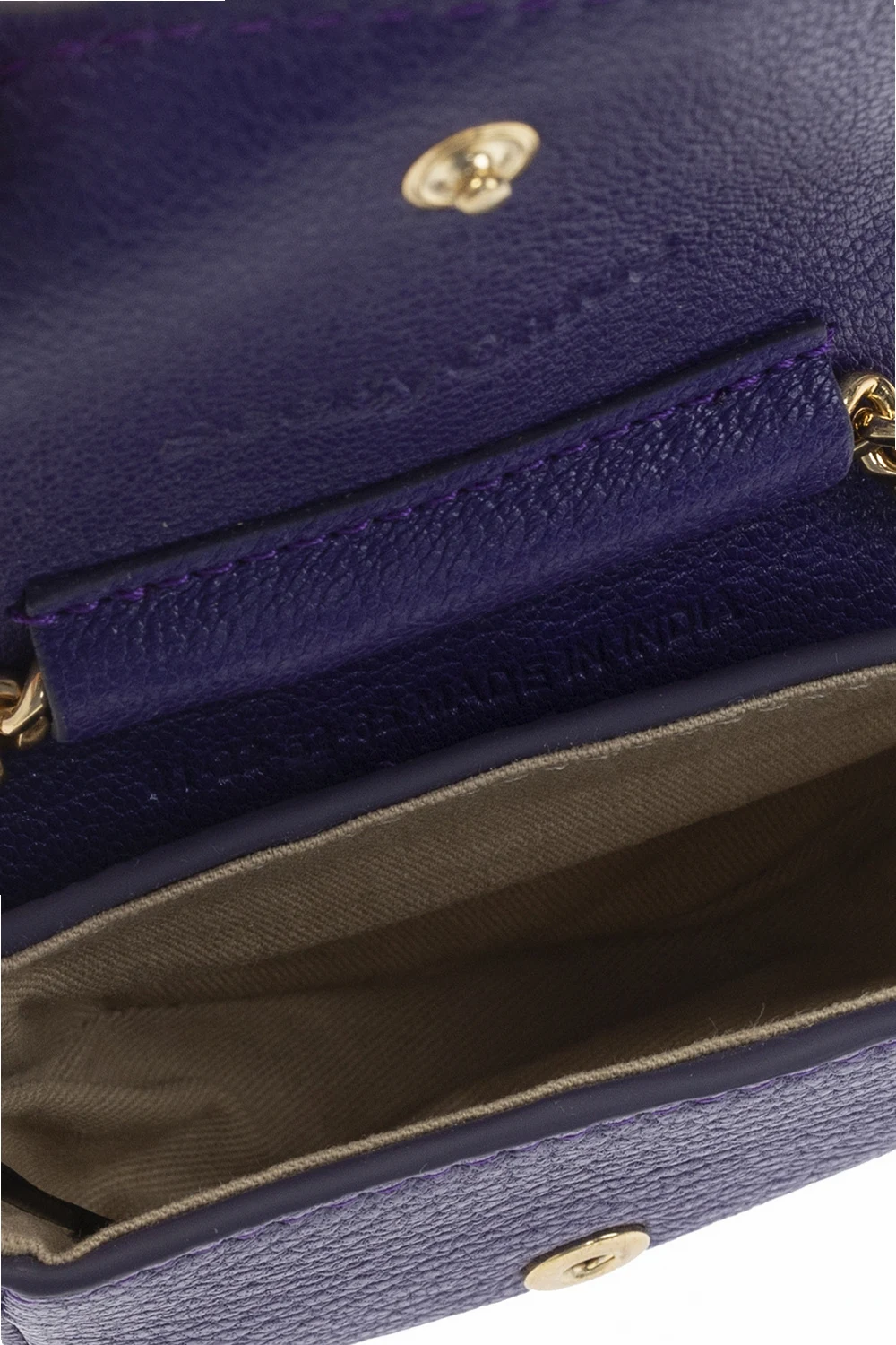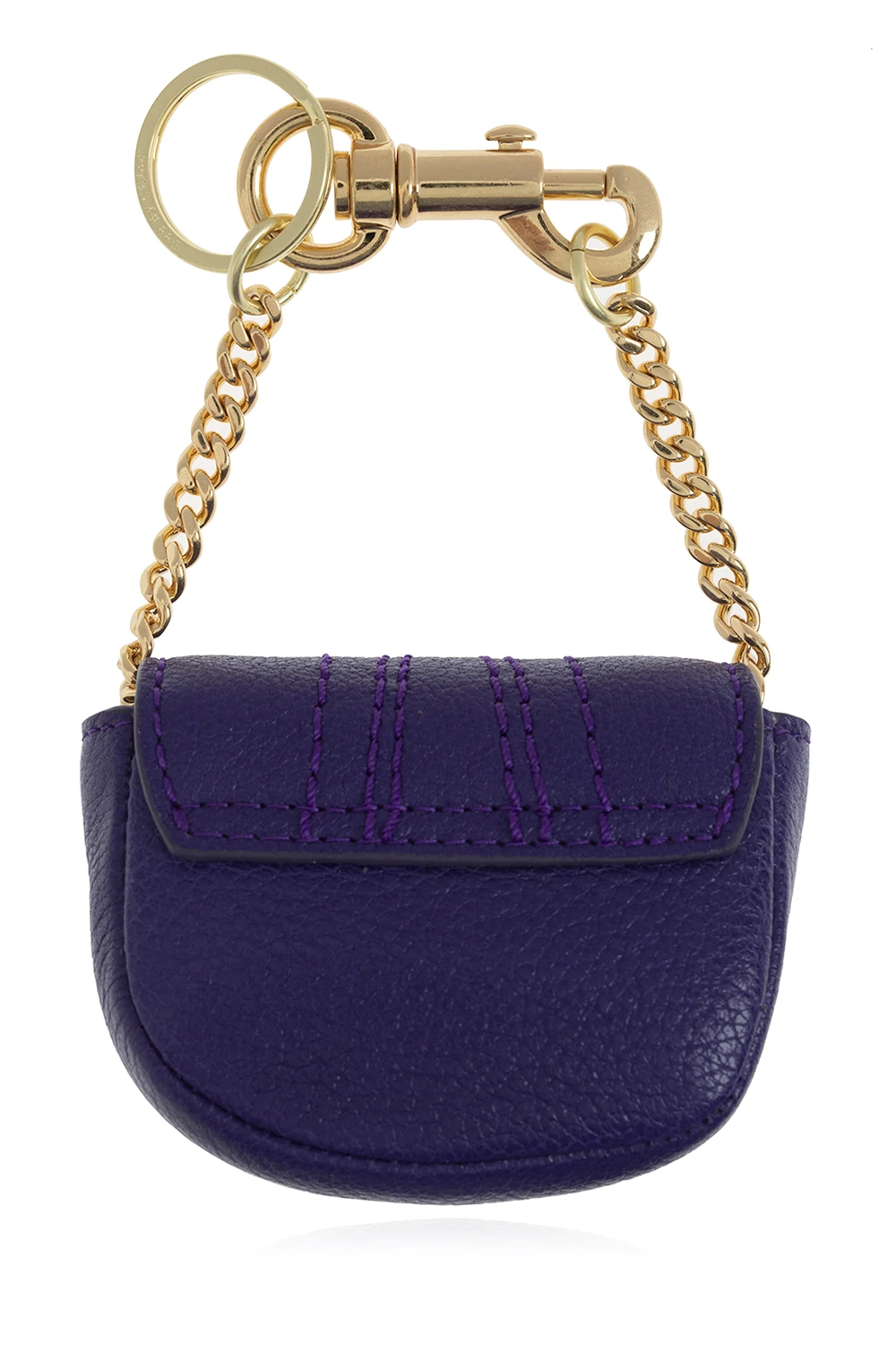 Dark purple 'Hana' keyring from See By Chloé. Made of goat leather, this design showcases a distinctive ring accompanied by logo charms on the front, an attached short chain strap with a lobster clasp fastening, gold-tone metal hardware and one internal compartment.