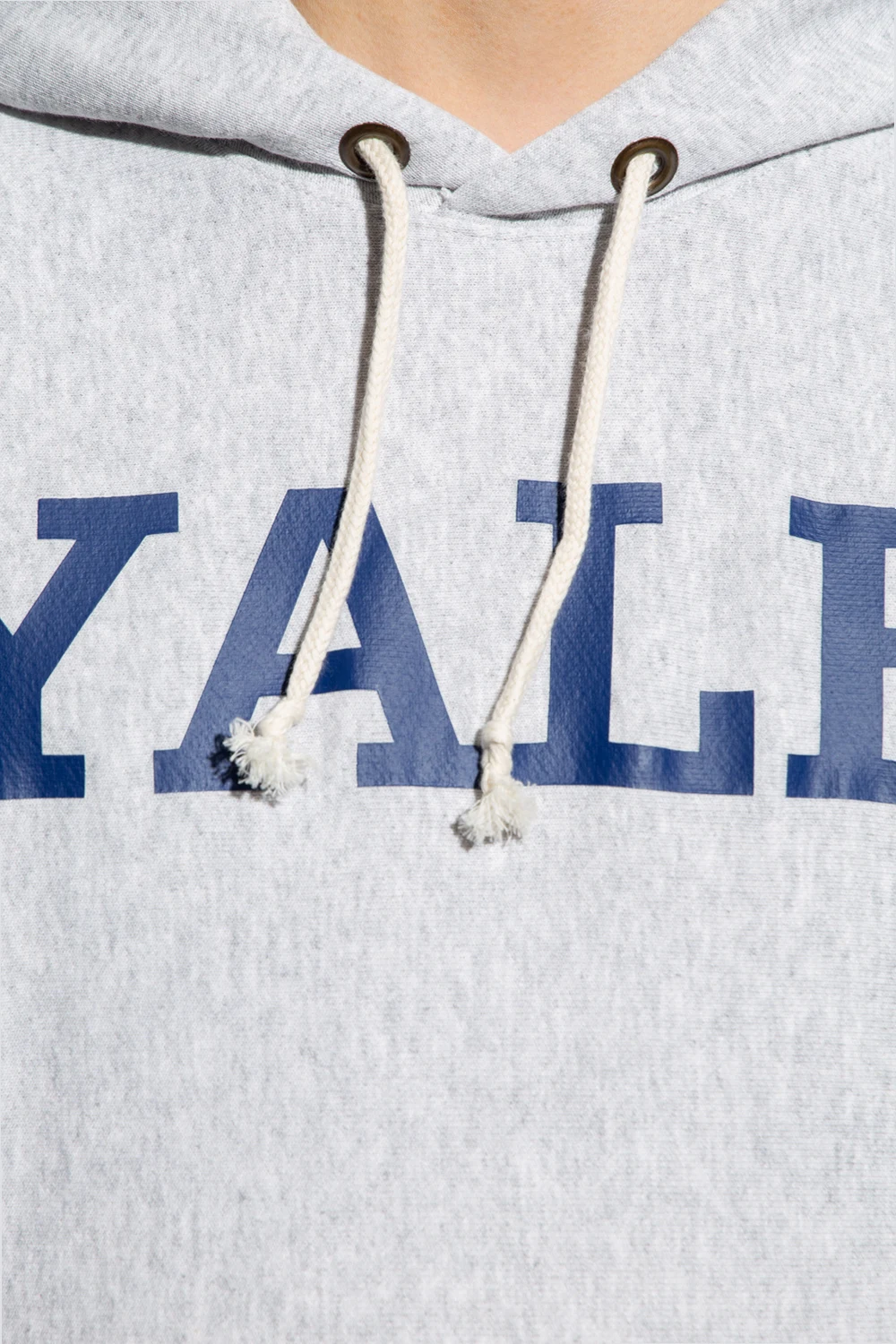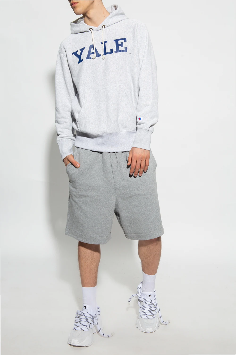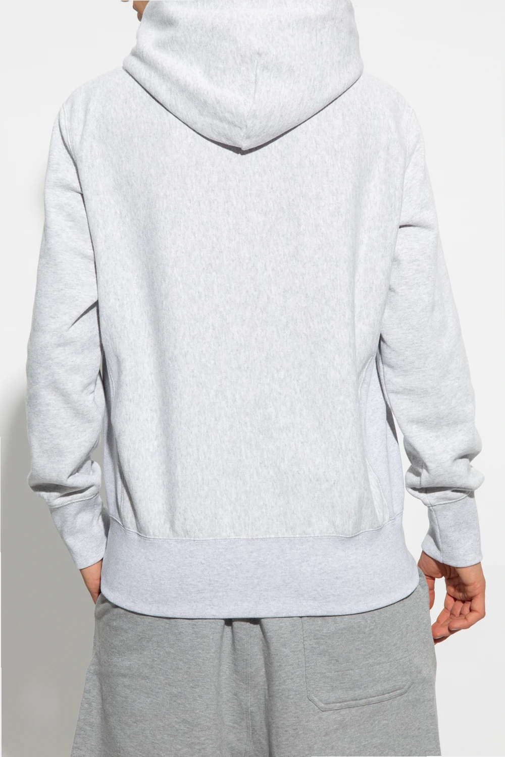 Grey sweatshirt with a drawcord-adjustable hood from Champion. Crafted from cotton-blend jersey, this style showcases a navy blue ‘Harvard’ print, a logo patch, a kangaroo pocket and an elasticated bottom hem and cuffs.
