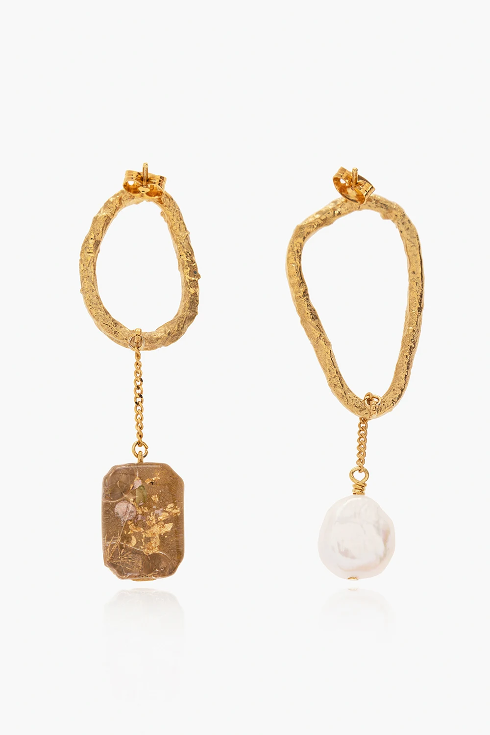 Gold-tone earrings in different sizes from Forte Forte. Crafted from textured brass plated with 24-carat gold, they secure with push back closures. One has a white pearl pendant, the other one has a pendant made of resin.
