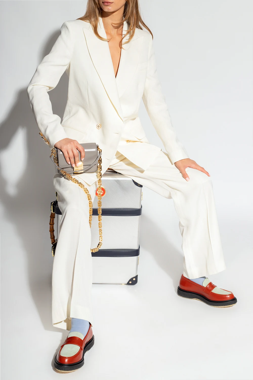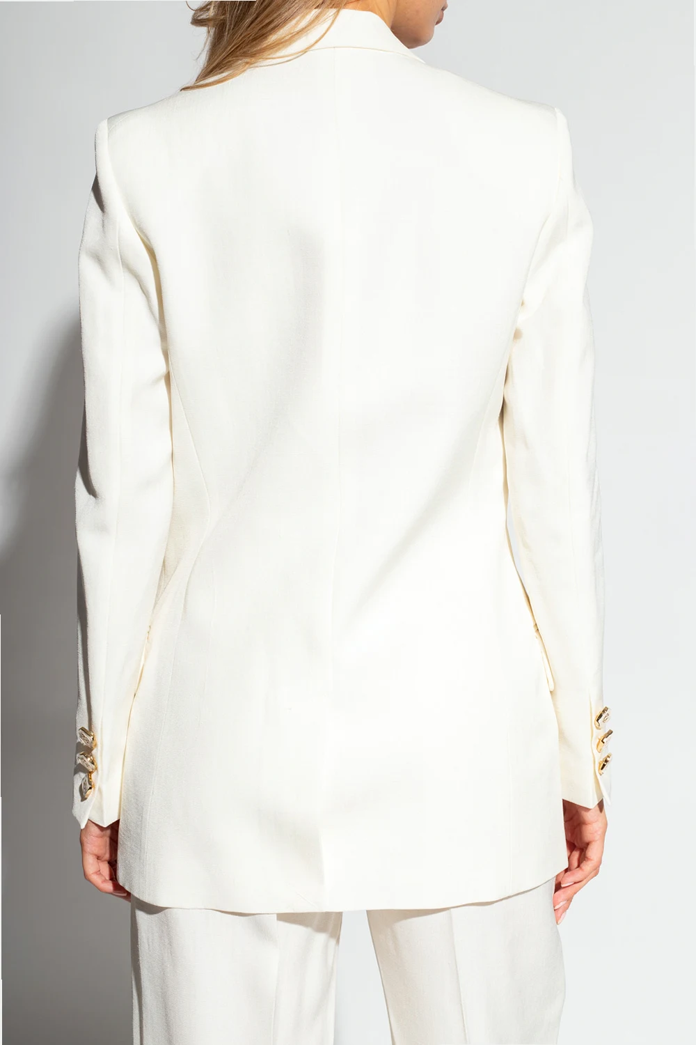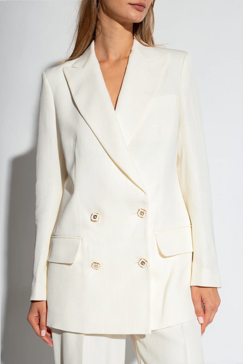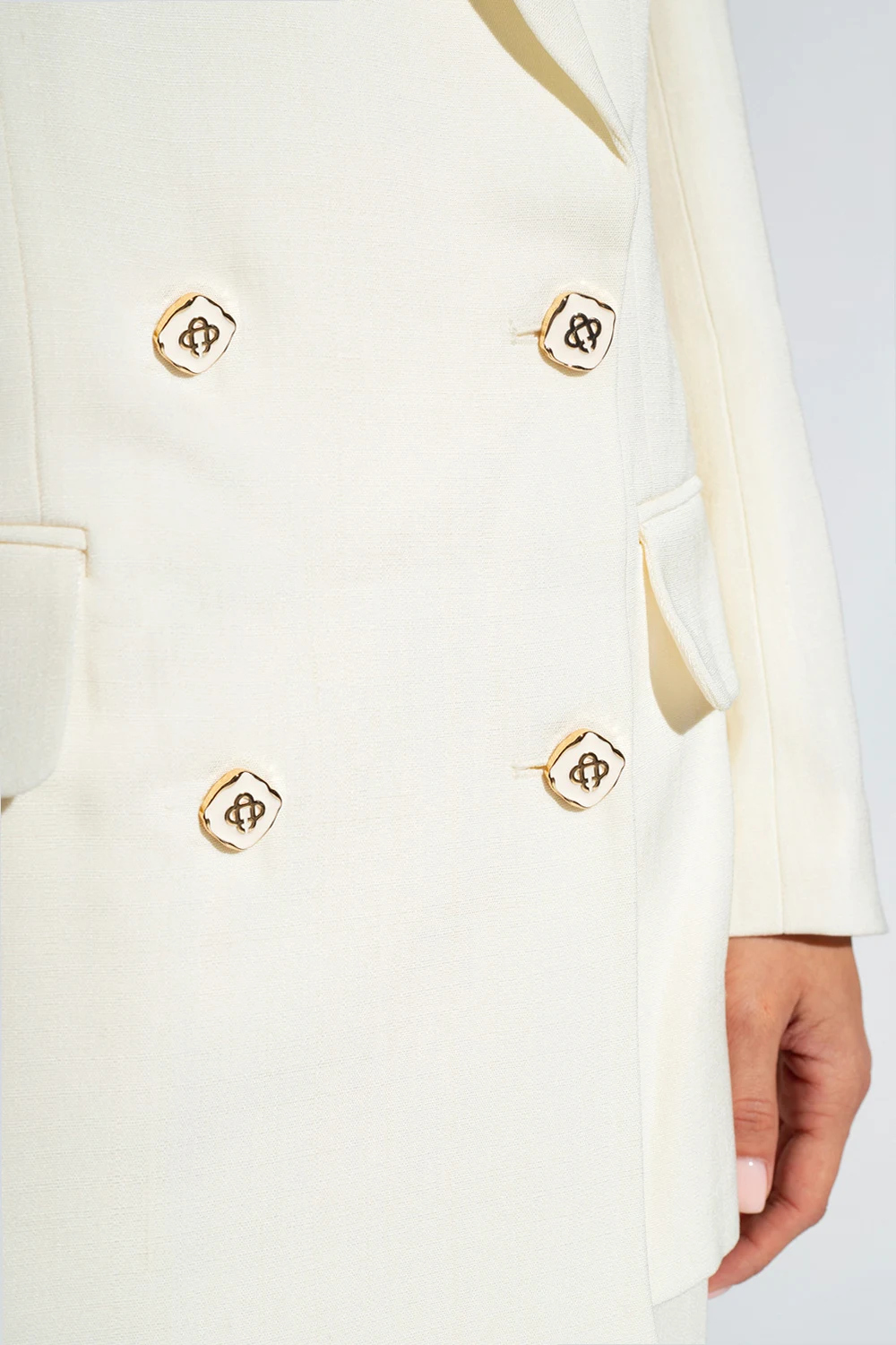 Cream blazer from Casablanca. Crafted from a silk blend with a double-breasted silhouette, this item features a collar with peak lapels, decorative branded buttons with a glossy enamel trim, one slip pocket, two flapped pockets, a single back vent and long sleeves with button cuffs.