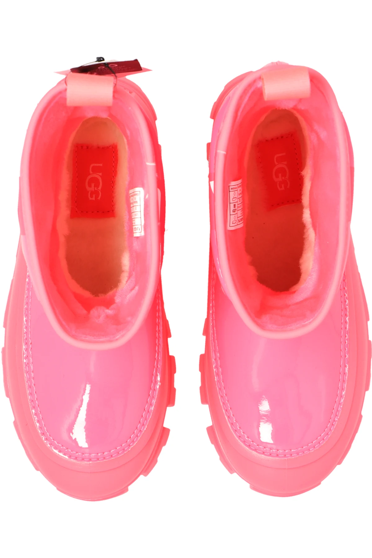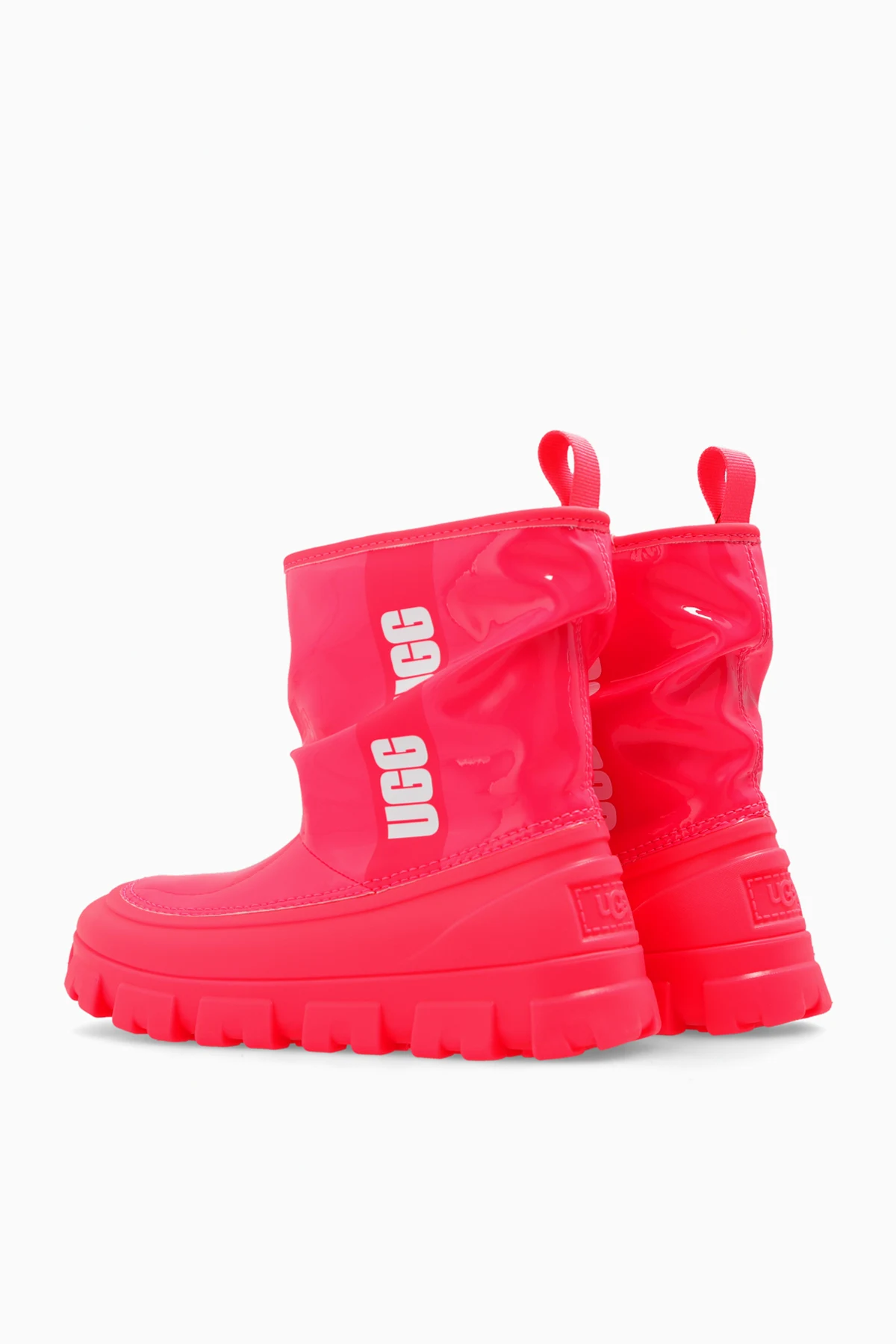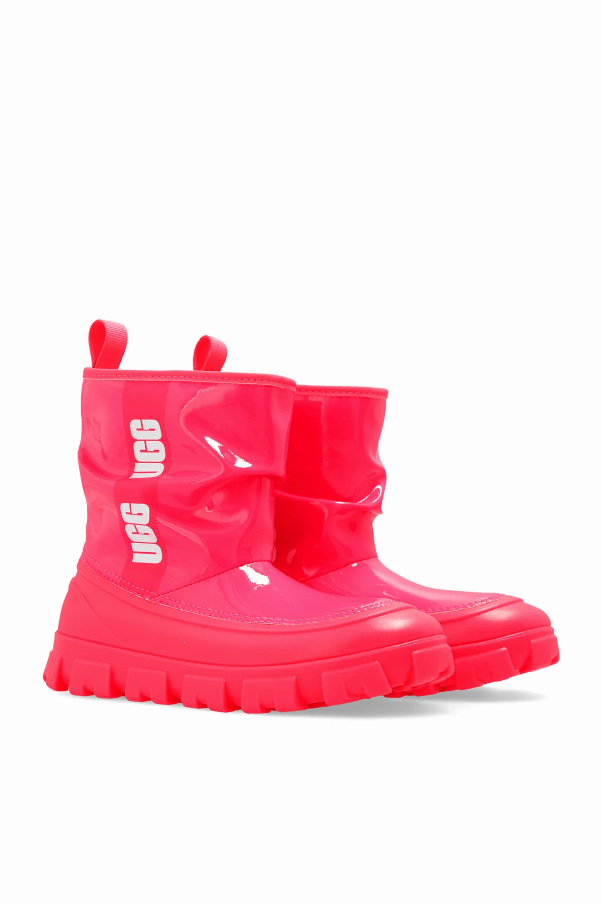Neon pink ‘Classic Brellah Mini’ snow boots from UGG Kids. Made from synthetic, glossy material with waterproof properties, this model sits on a neon pink rubber sole and features a slip-on silhouette, gathered upper with a printed white logo and a soft UGGplush ™ lining.