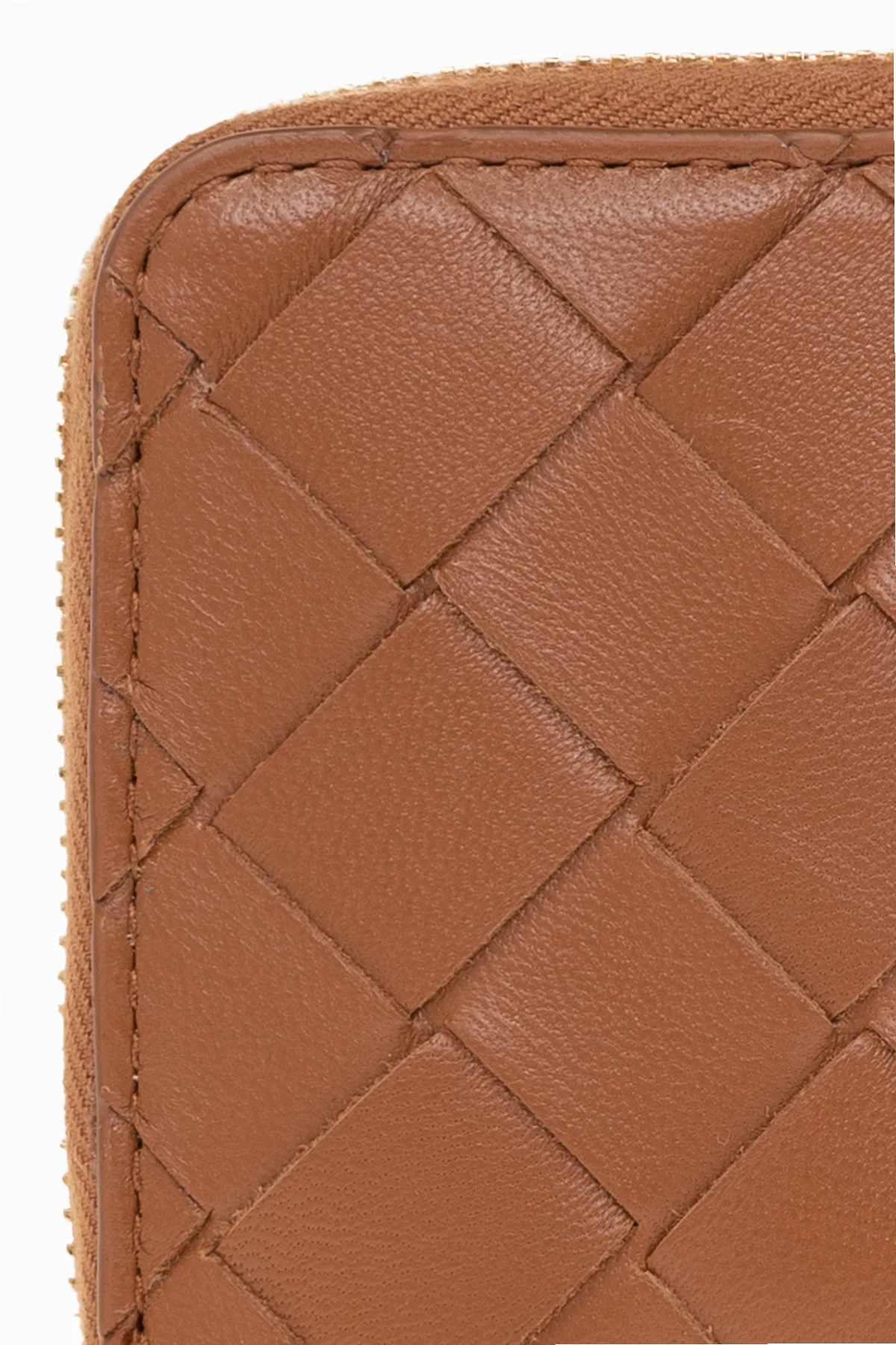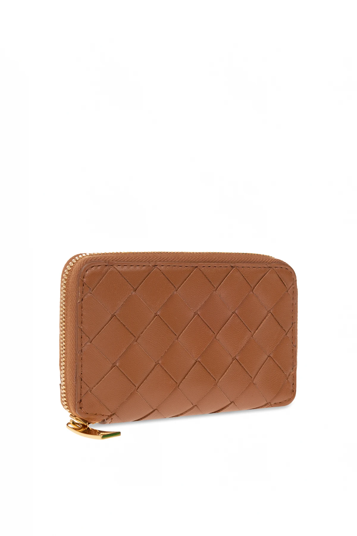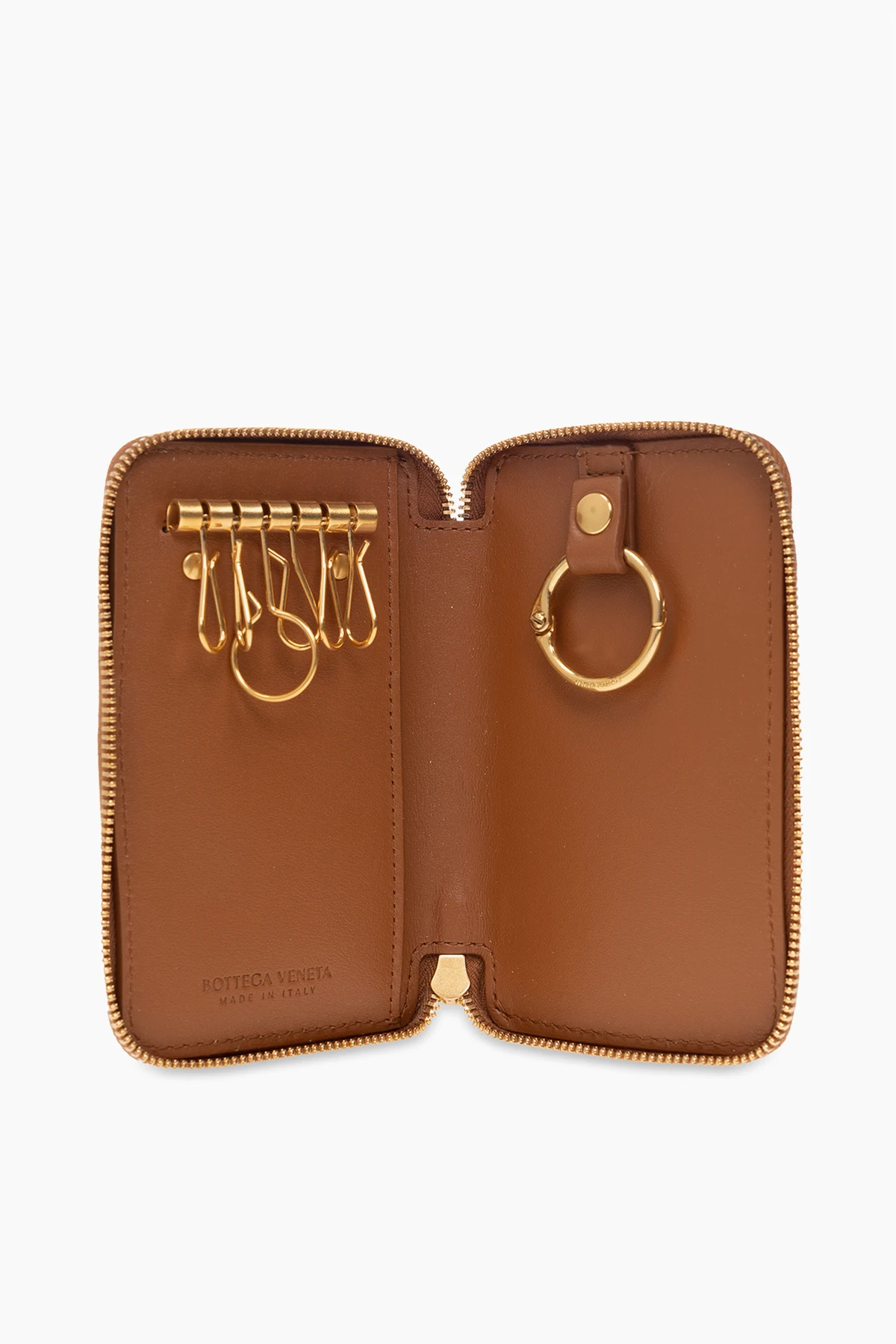 Brown key pouch from Bottega Veneta. Made of lamb leather the brand’s signature Intrecciato weave, this design features a zip fastening, gold-tone metal hardware and one internal compartment and six key hooks.