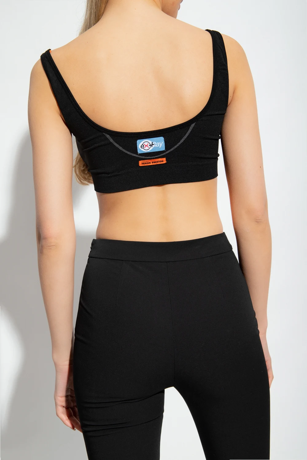 Black sports bra from Heron Preston. Made of recycled fabric, this design features a grey logo embroidery on the front and logo patches at the back.