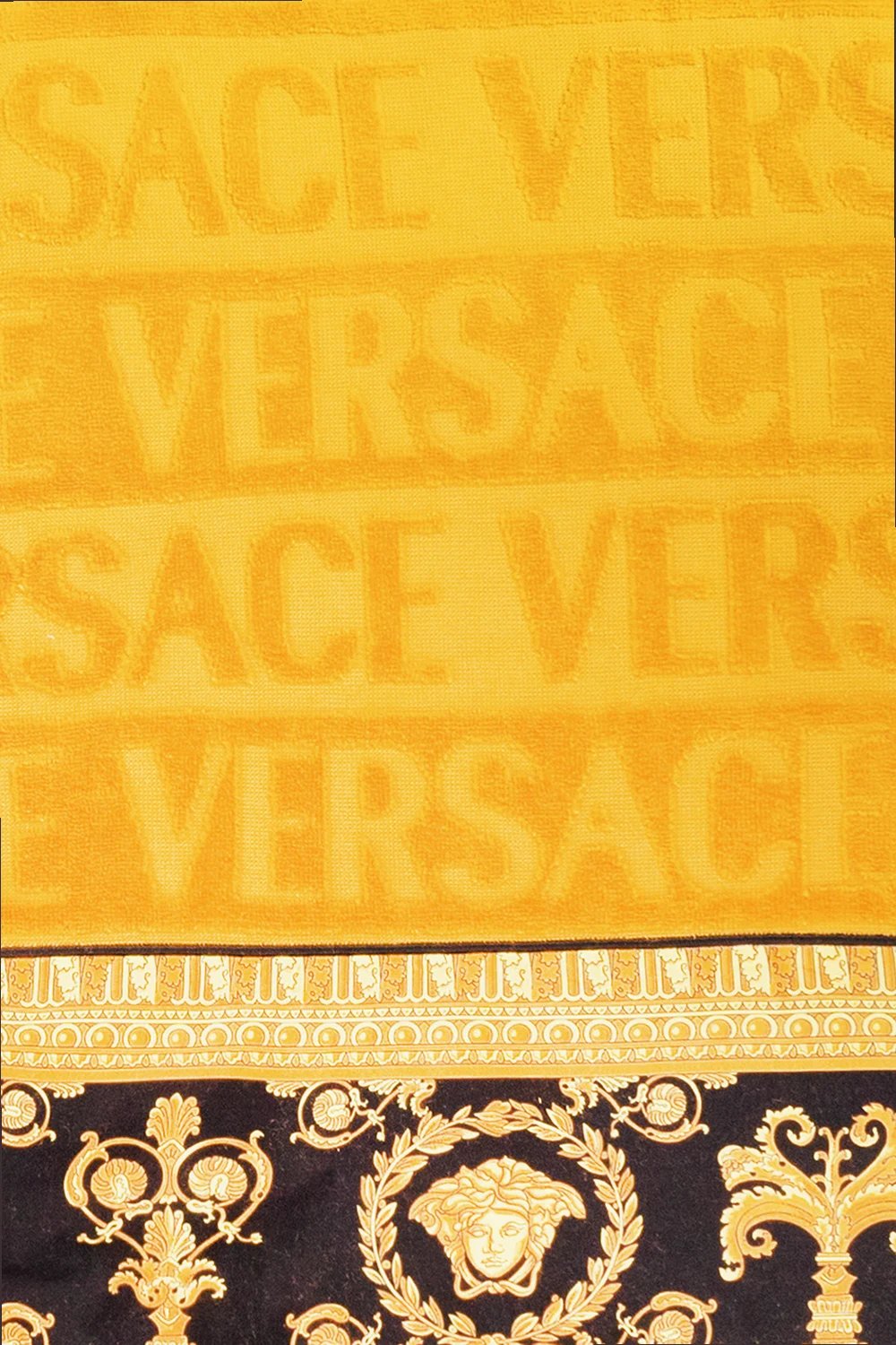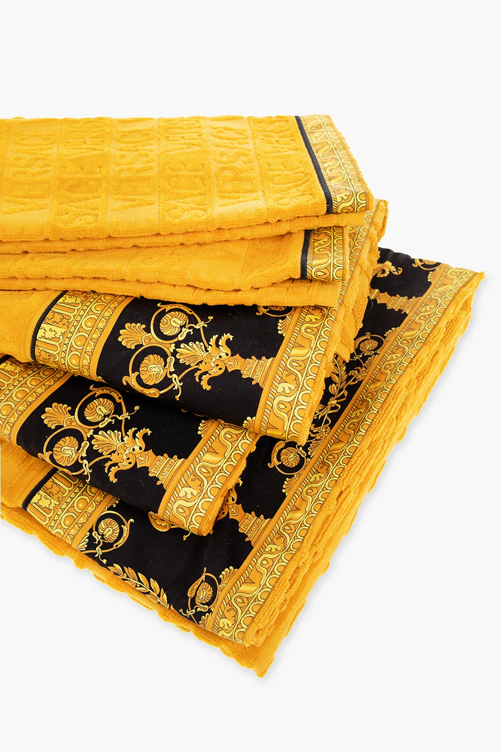Set of 5 yellow towels from Versace Home. Made of cotton terry, each item is decorated with a jacquard logo pattern and stripe pattern with the I Love Baroque in black, yellow and brown. Includes two hand towels, two face towels and one bath towel.
