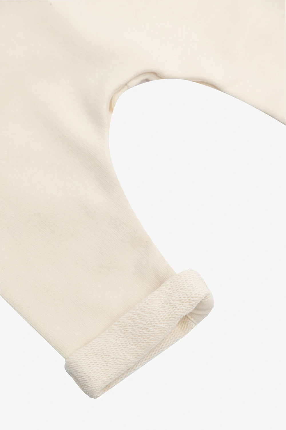 -a baby romper suit with a collar, long legs and sleeves with turned-up hems and snap closures at the crotch and back,