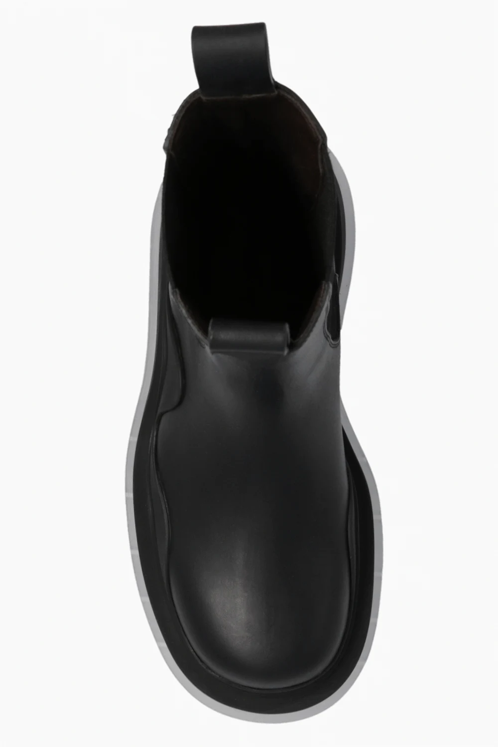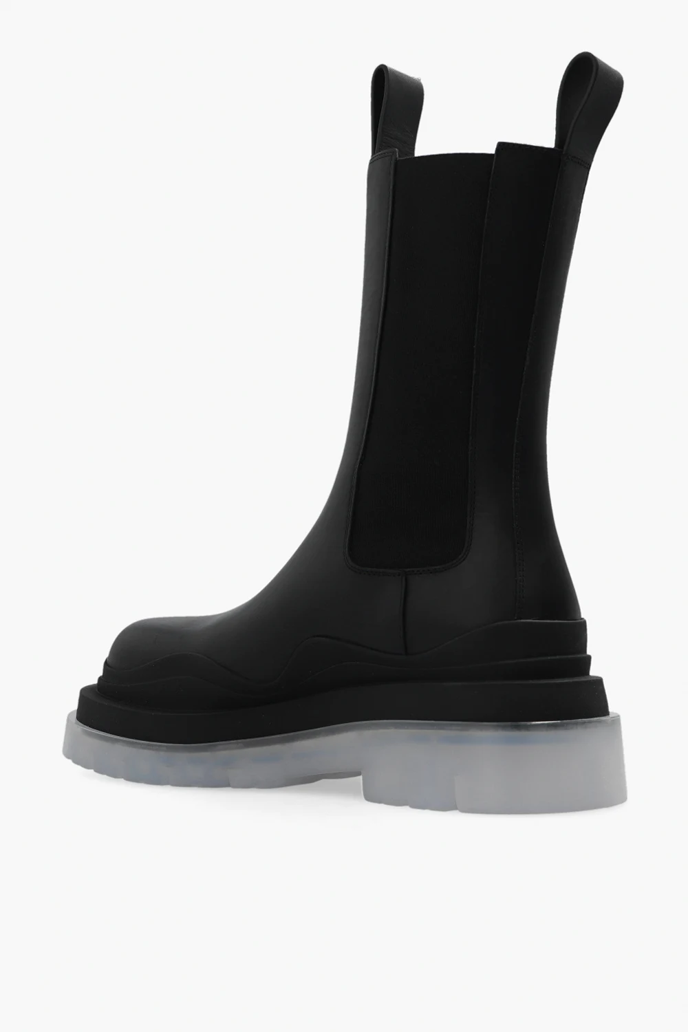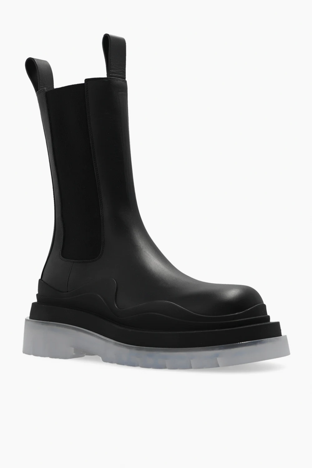 Black ‘Tire’ ankle boots from Bottega Veneta. Crafted from calf leather, this model features rubber trims, elastic panels on the sides and a light grey transparent rubber sole.
