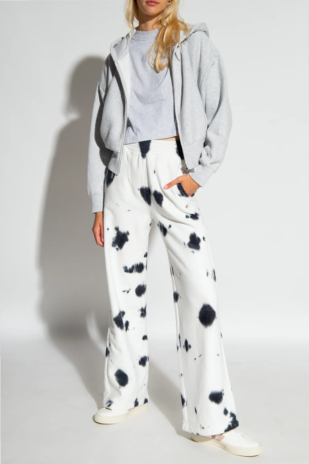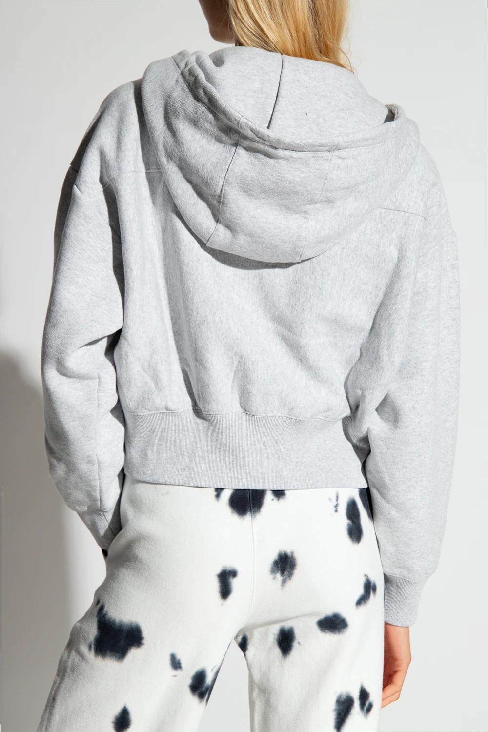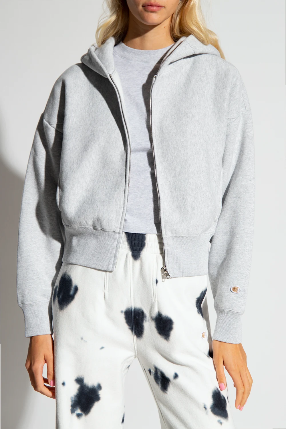 Grey hoodie from Champion. Made of cotton, this garment features a zip fastening, two slip pockets and ribbed trims at the hem and cuffs.