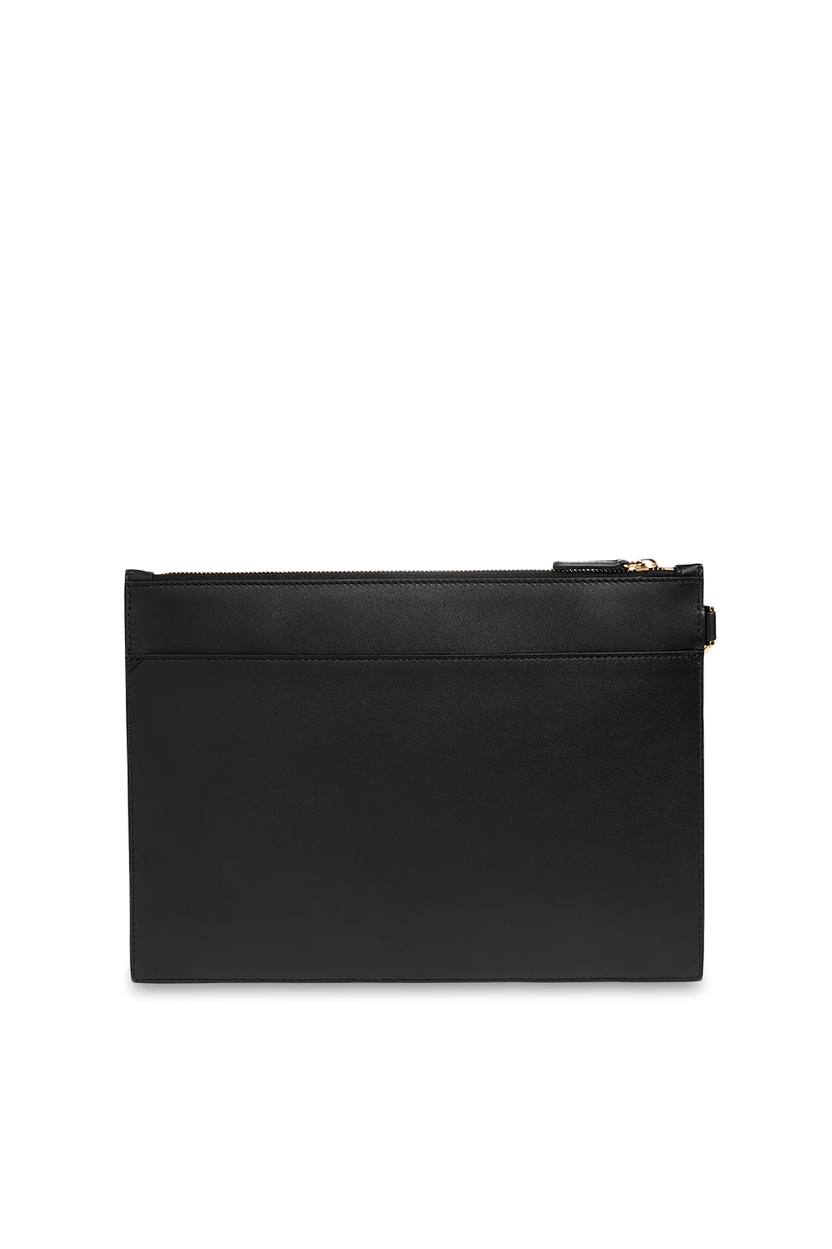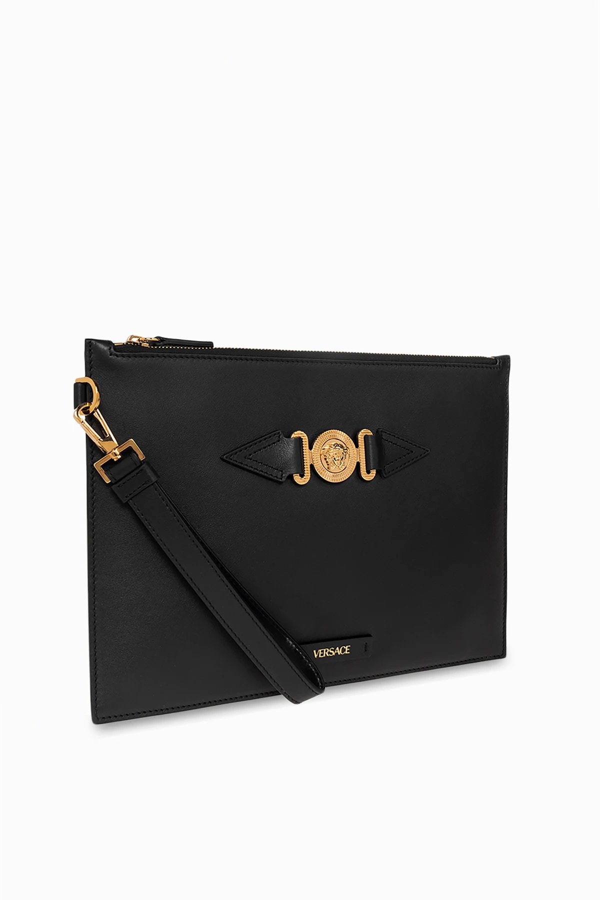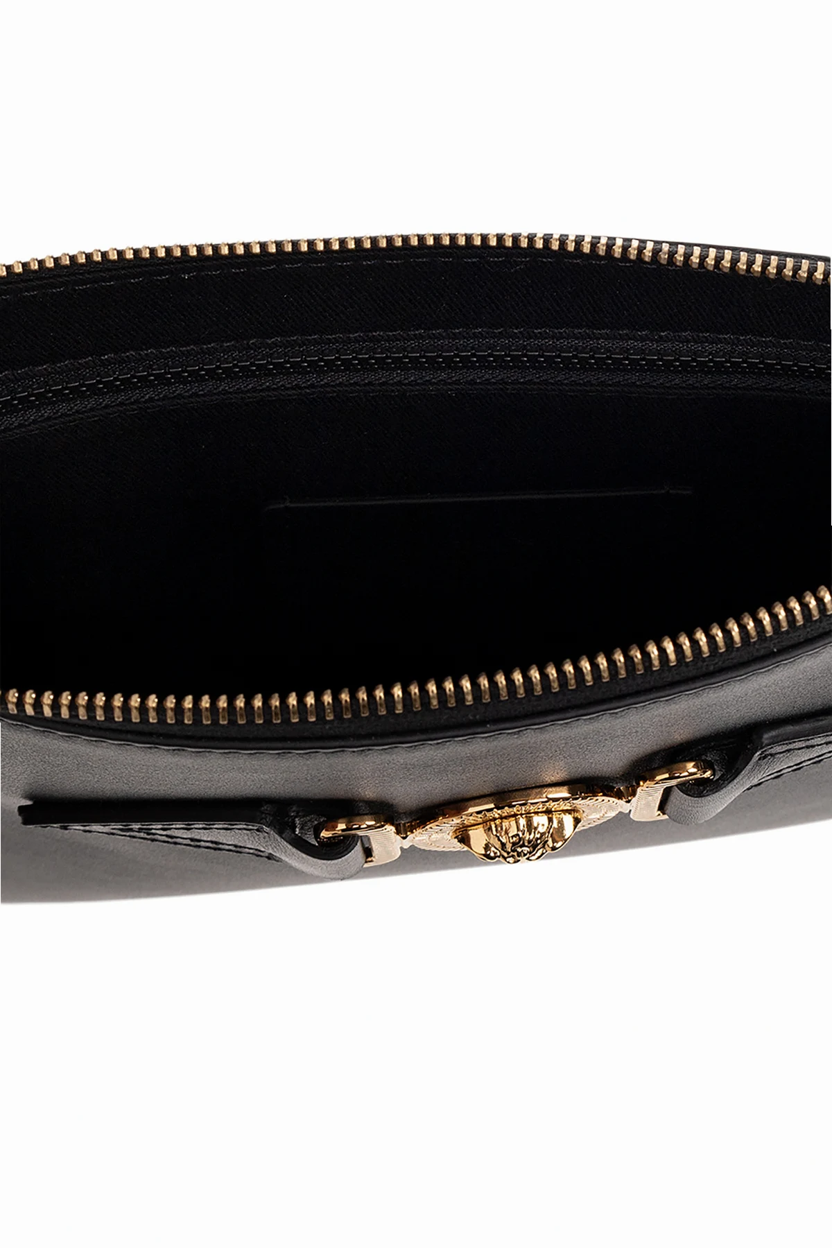 Black ‘Medusa Large’ handbag from Versace. Crafted from leather, this design secures with a zip and showcases a logo patch and brass Medusa hardware on the front, a detachable wrist strap on the side, gold-toe metal elements and one internal compartment with one slip pocket.