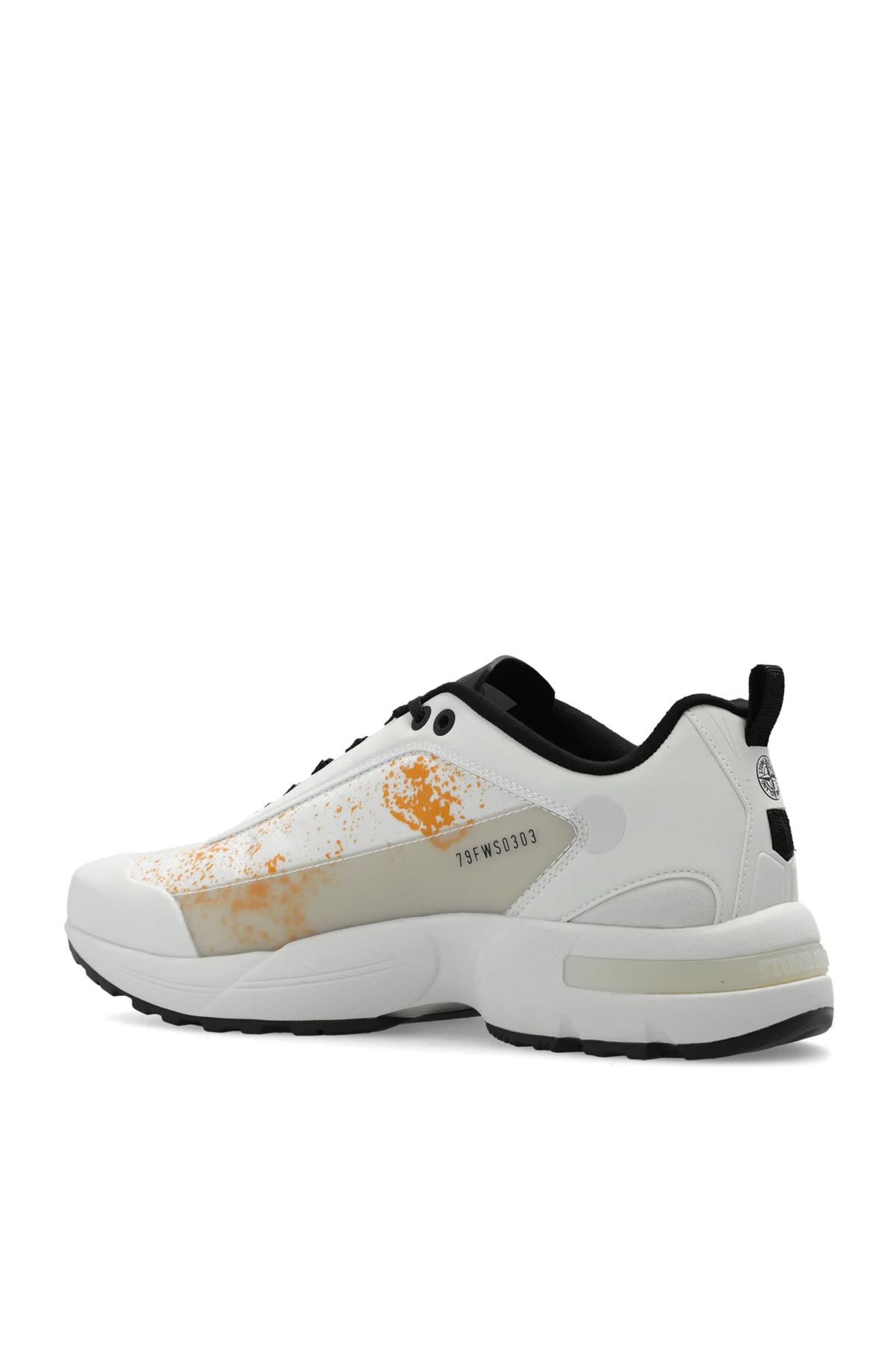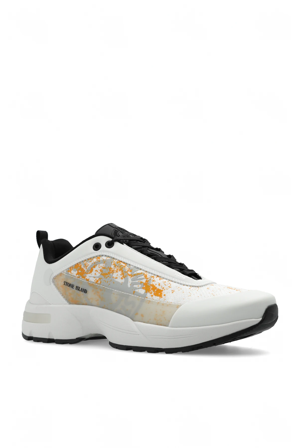 Grey, orange and white ‘Grime’ sneakers from Stone Island. The handcrafted upper of this model is combined with rubberised leather, a reinforced military-inspired strap and an articulated sole for functional reasons. A black and grey rubber sole and a distressed logo print complete the design.