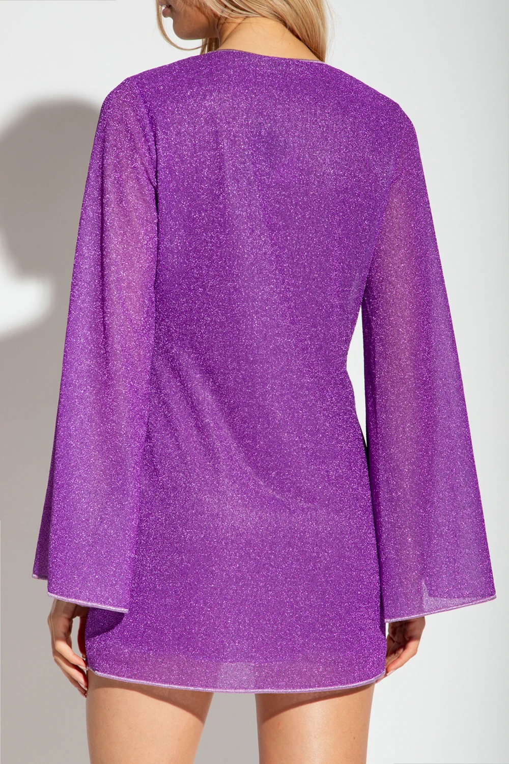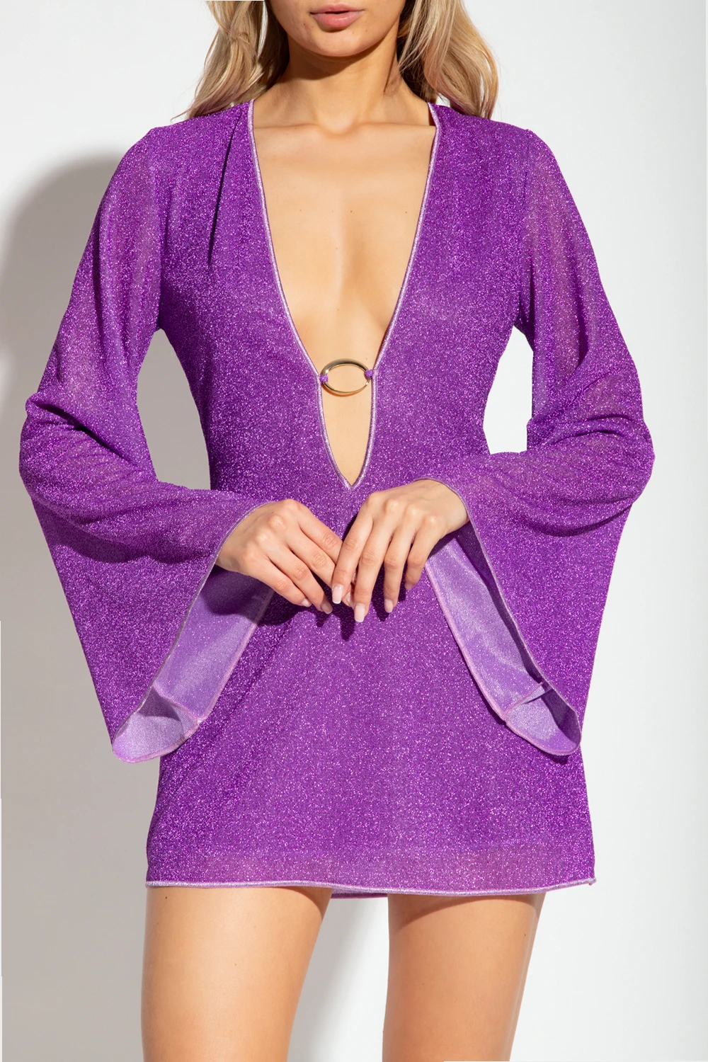 Purple mini dress from Oseree. Inlaid with lurex yarn, this style features a plunging V-neckline accentuated with a round application in gold-tone, and long flared sleeves.