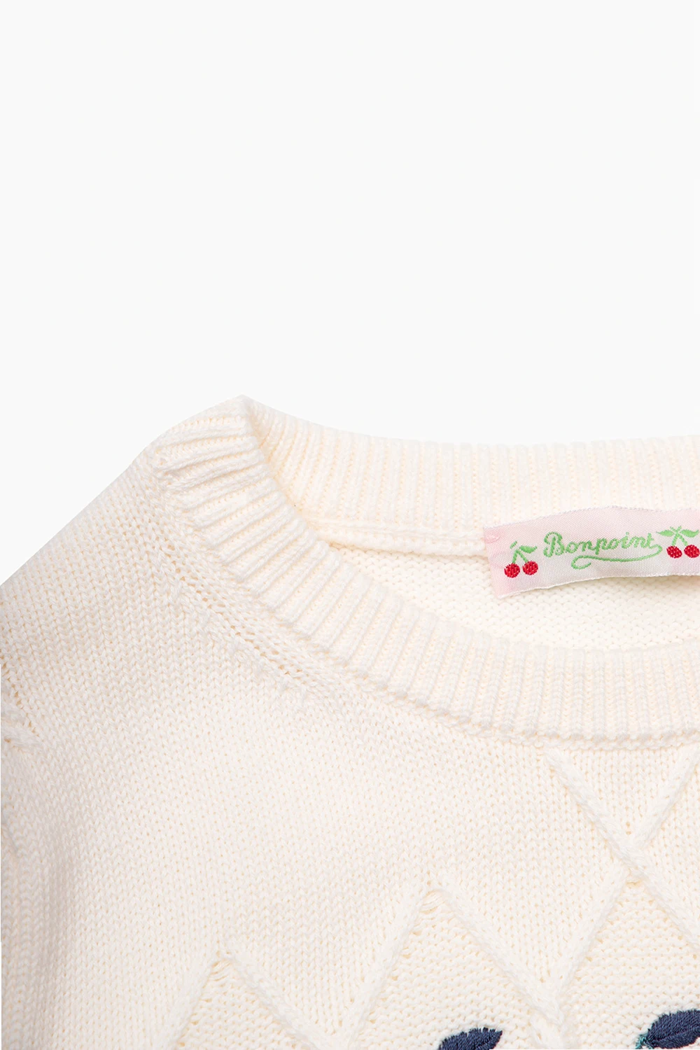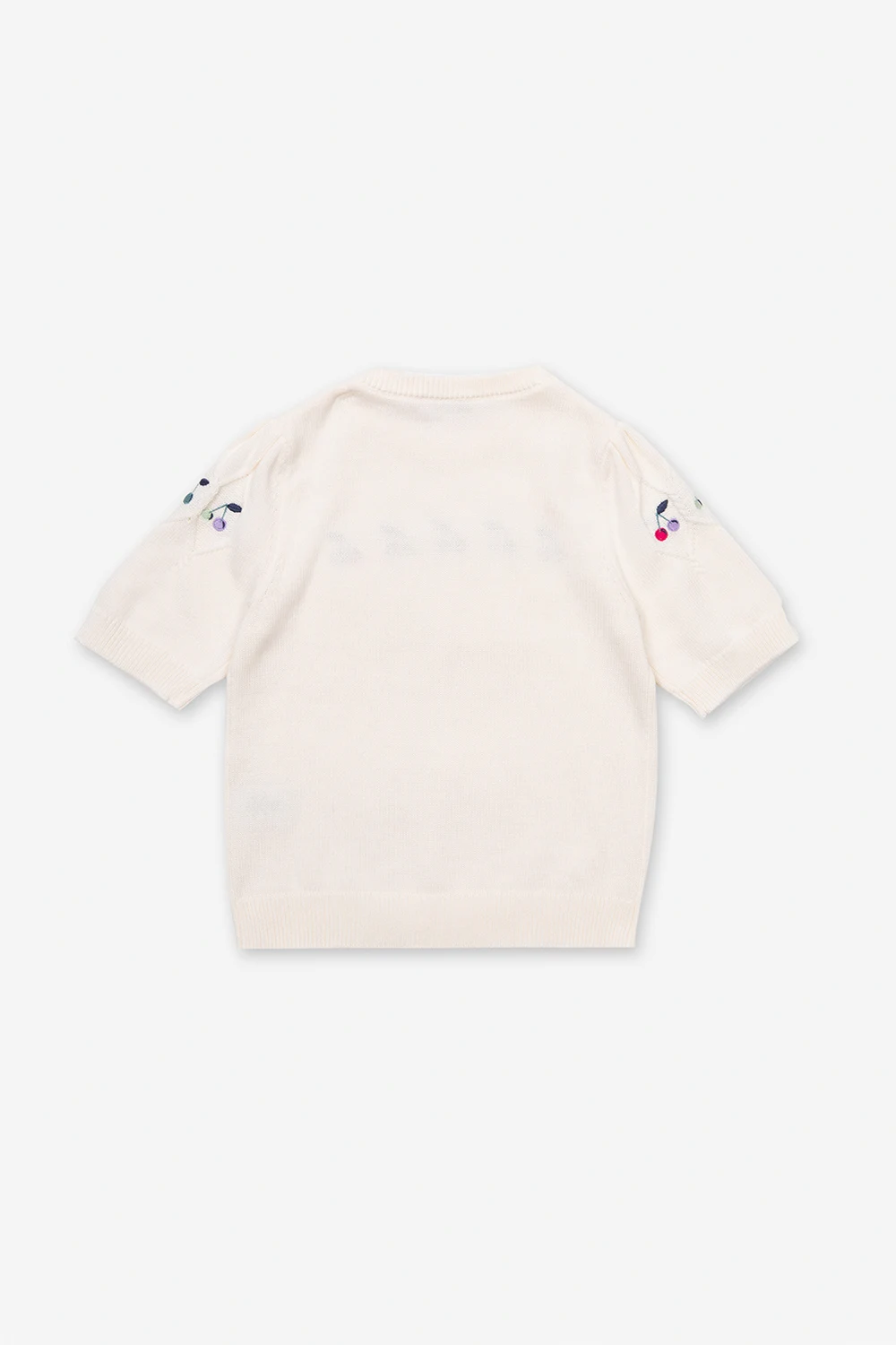 Cream ‘Alphonza’ sweater from Bonpoint. Crafted from cotton, this short sleeve design features a multicolored embroidered fruit pattern and ribbed trims at the round neck, hem and cuffs.