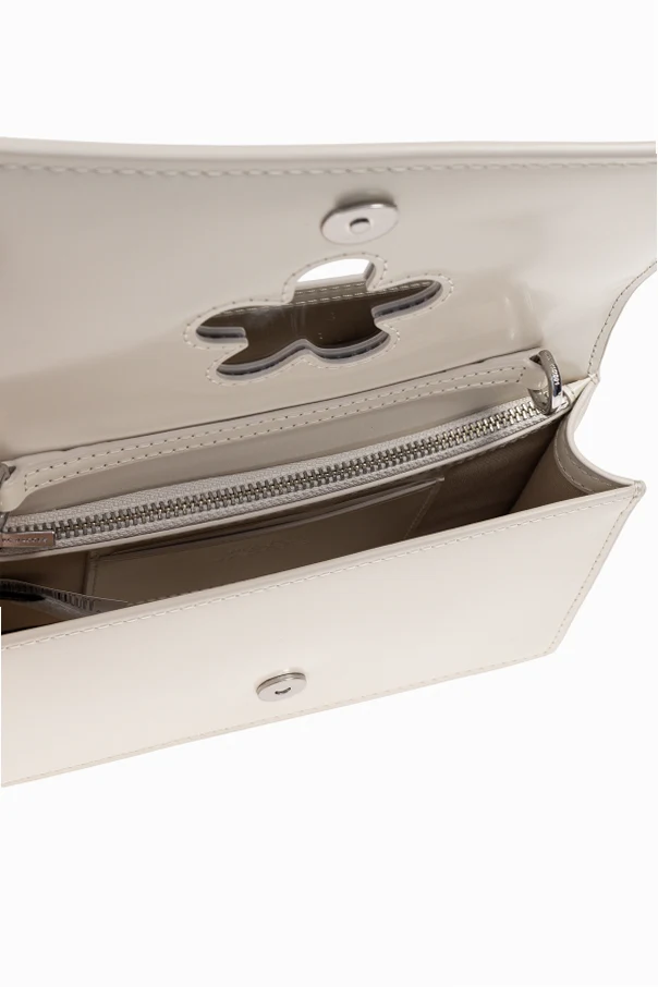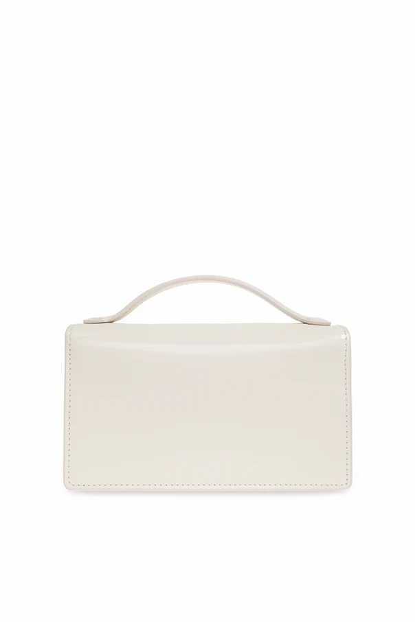 Die äußere Schicht aus weichem, cremefarbenem Leder glänzt dezent und unterstreicht den exklusiven Charakter der Tasche. Der kurze Griff, gefertigt aus demselben Material, sorgt für angenehmen Tragekomfort in der Hand. Das minimalistische, silberne Logo sowie die dekorative, massive Kette verleihen einen Hauch von Raffinesse und bilden ein außergewöhnliches Detail.