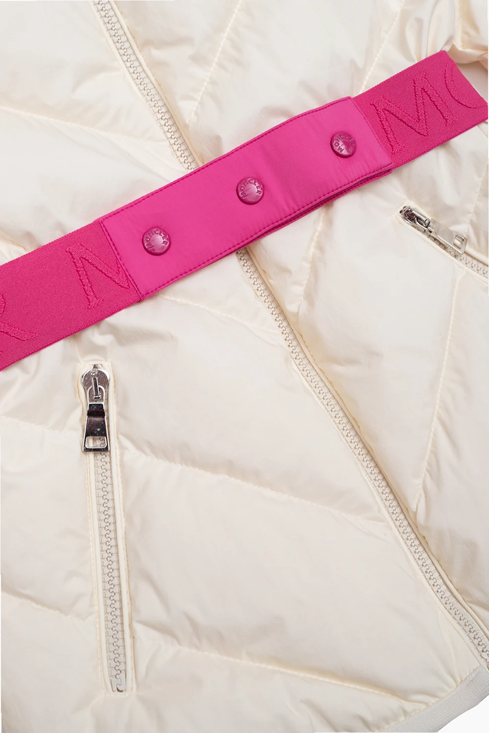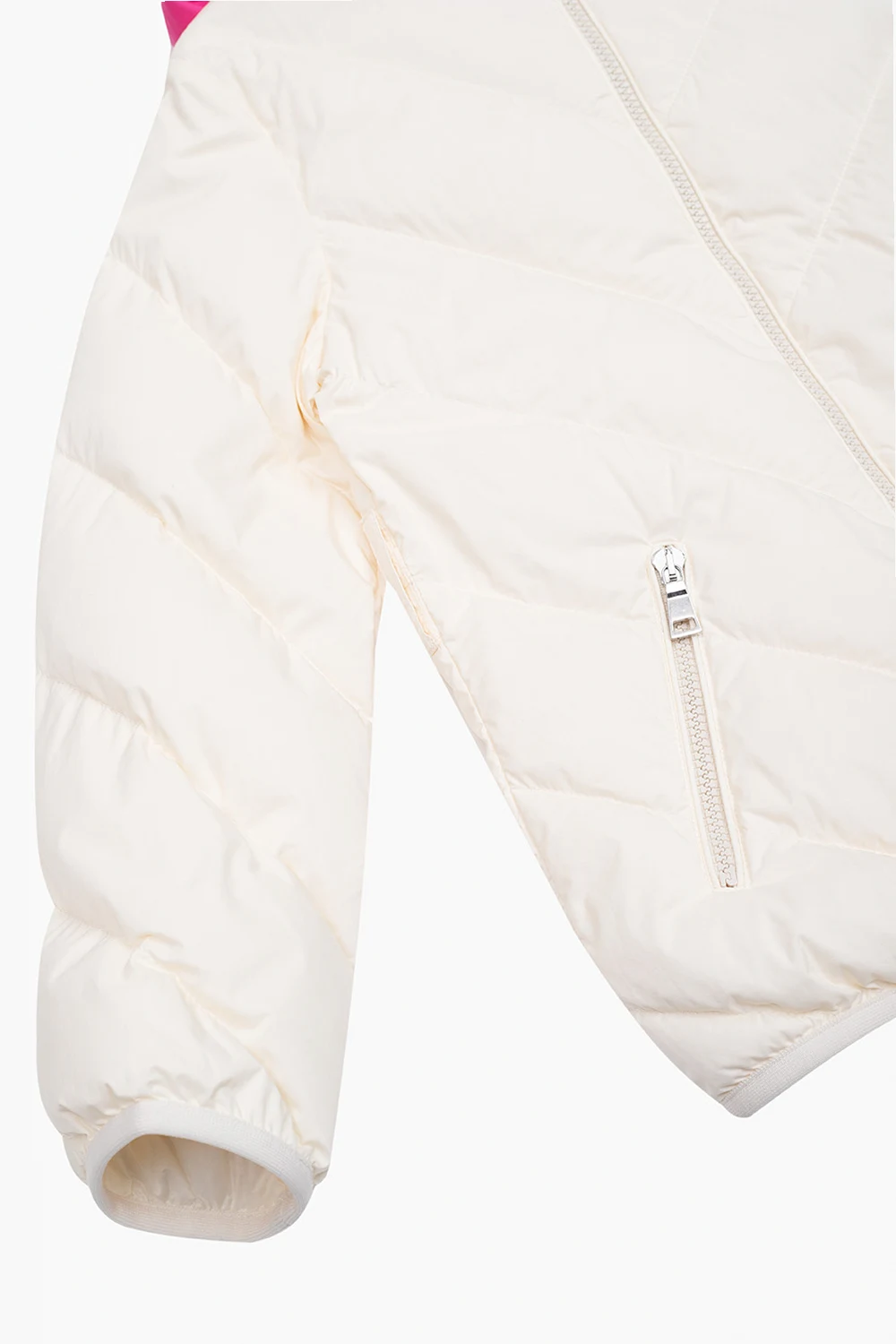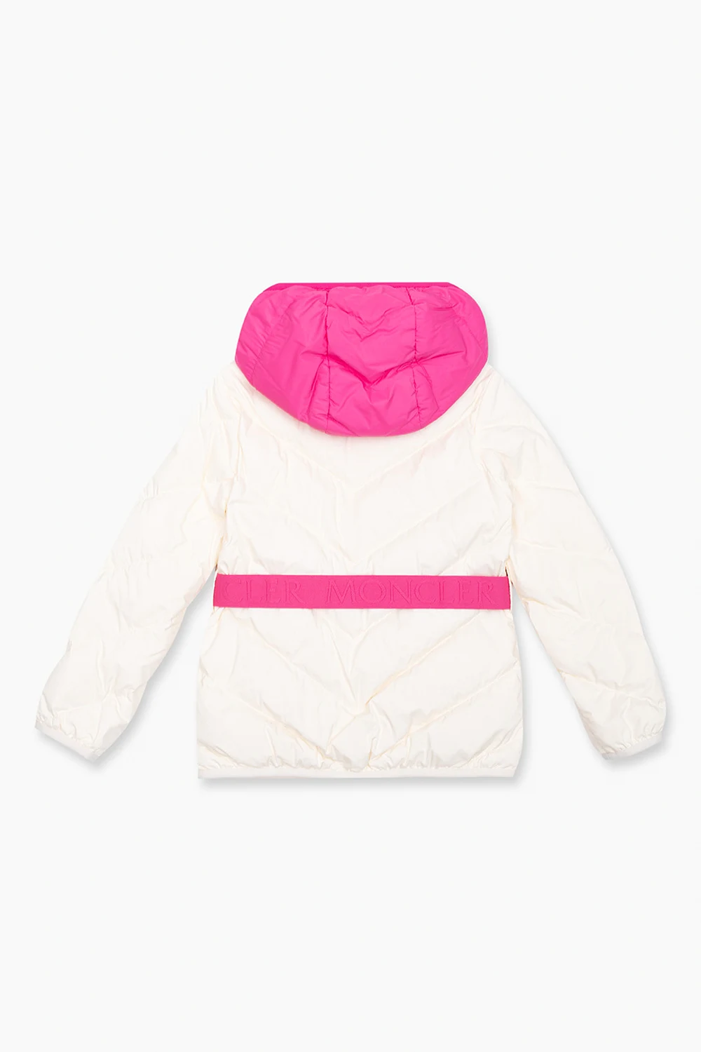 Cream and pink ‘Kaori’ quilted jacket with a hood from Moncler Enfant. Filled with goose down, this style features a zip fastening, two zip pockets, a felt logo patch on the sleeve, long sleeves and elasticized trims on the bottom hem and cuffs.