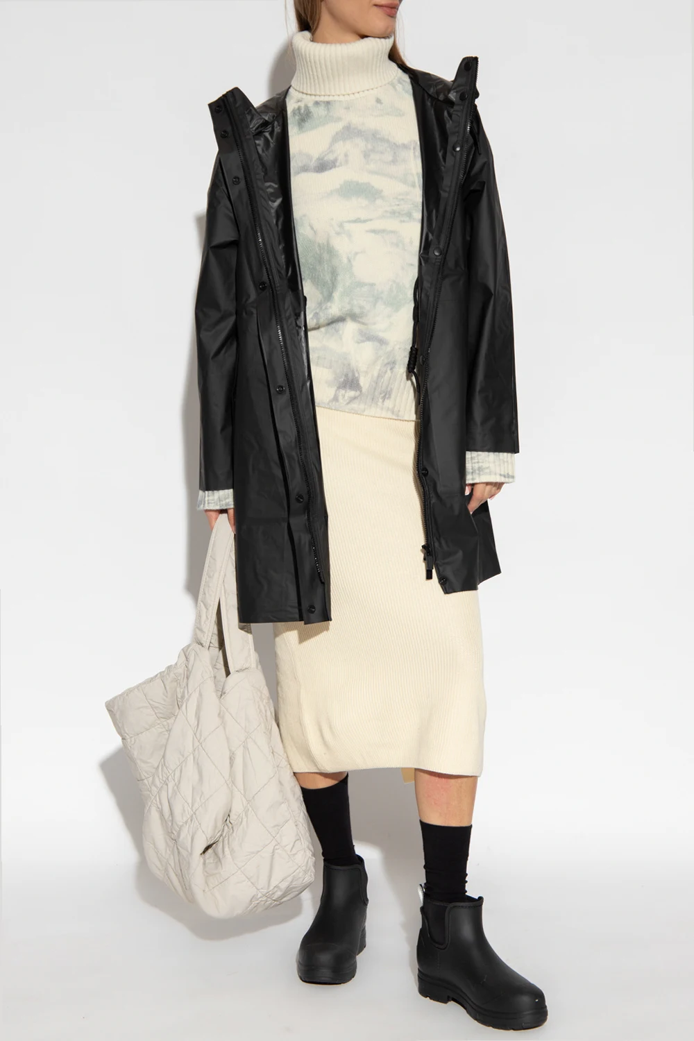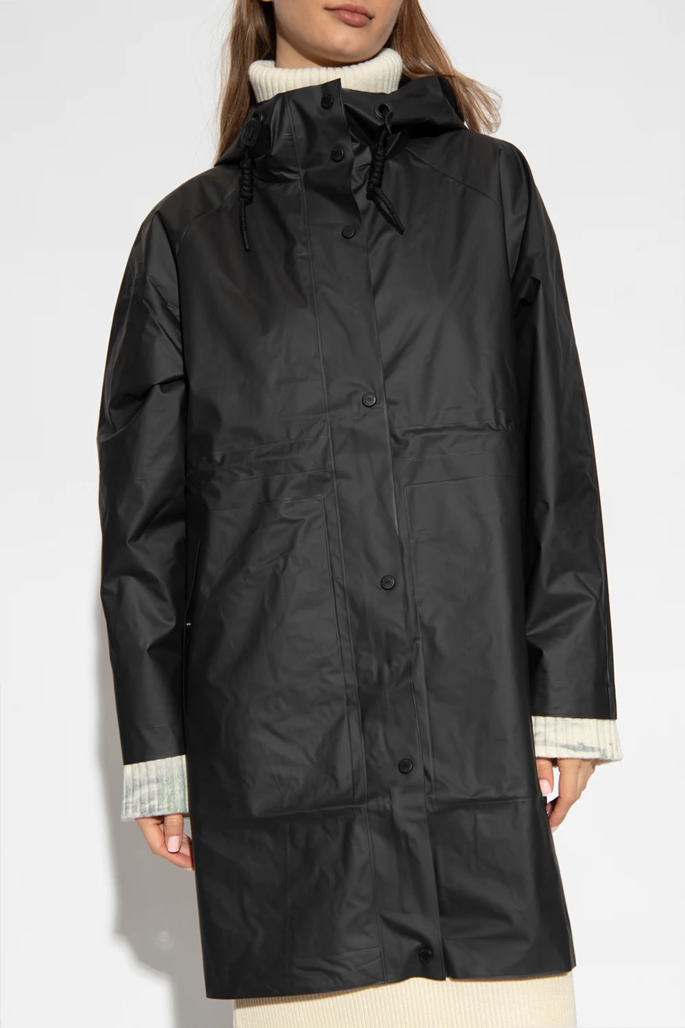 Black rain coat from Hunter. Fastened with a zip and snaps, this design features a drawstring hood, two snap-fastened pockets, long sleeves and logo patch in white, red and black.