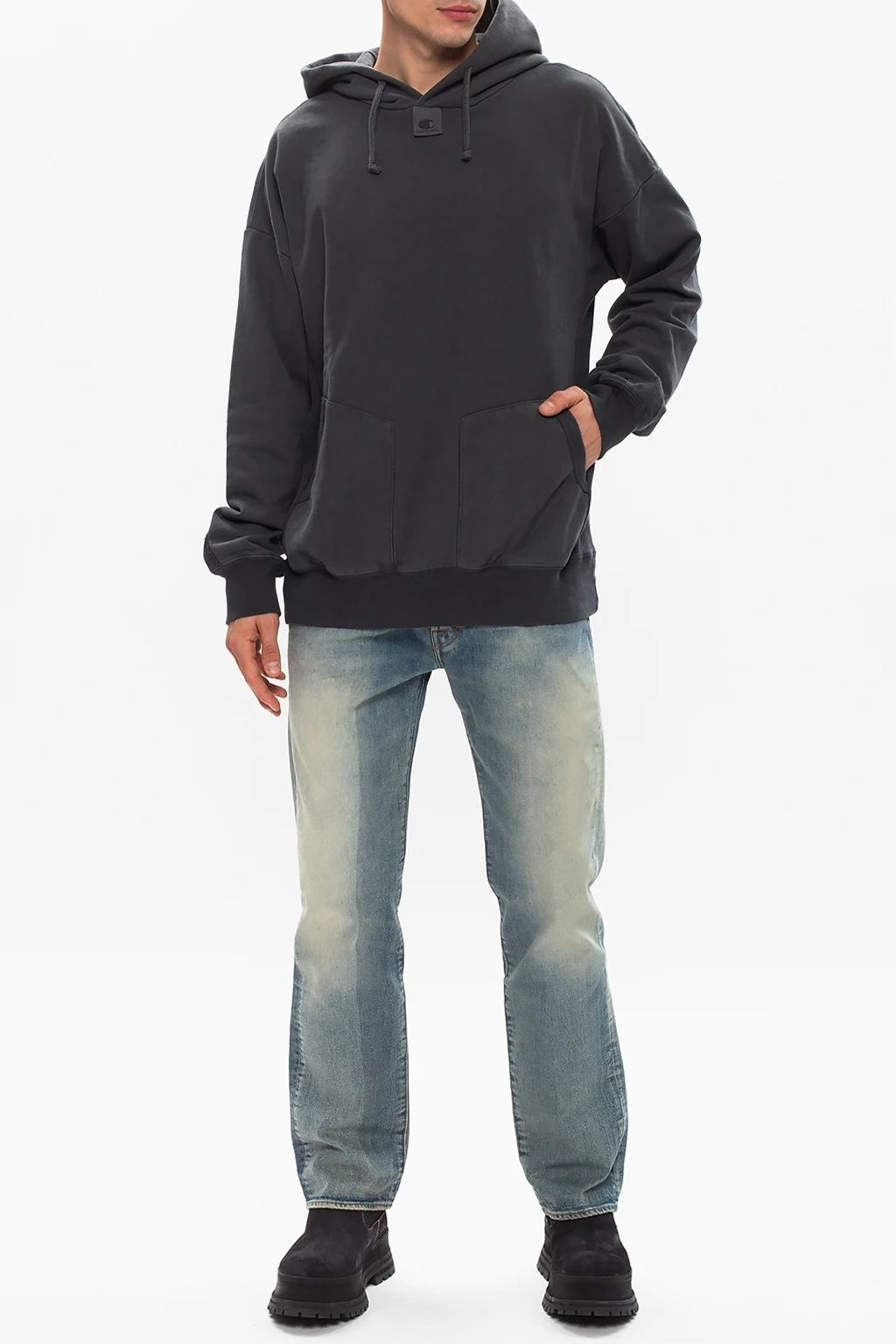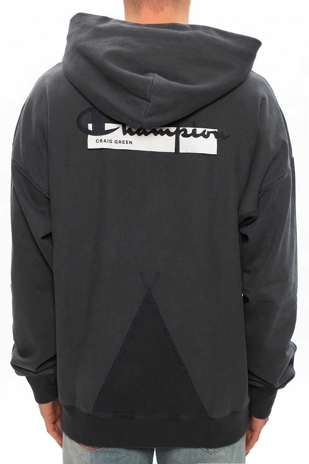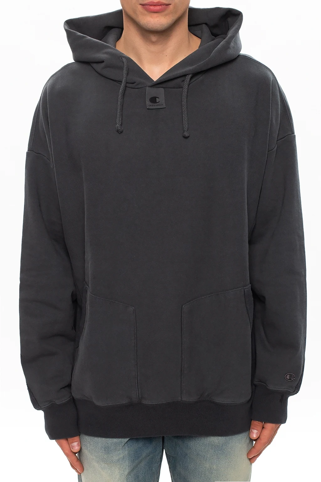 Grey sweatshirt with a drawcord-adjustable hood from Champion x Craig Green. Crafted from cotton jersey, this hoodie showcases ribbed trims, a kangaroo pocket and logo-embroidered patches on both front and back.