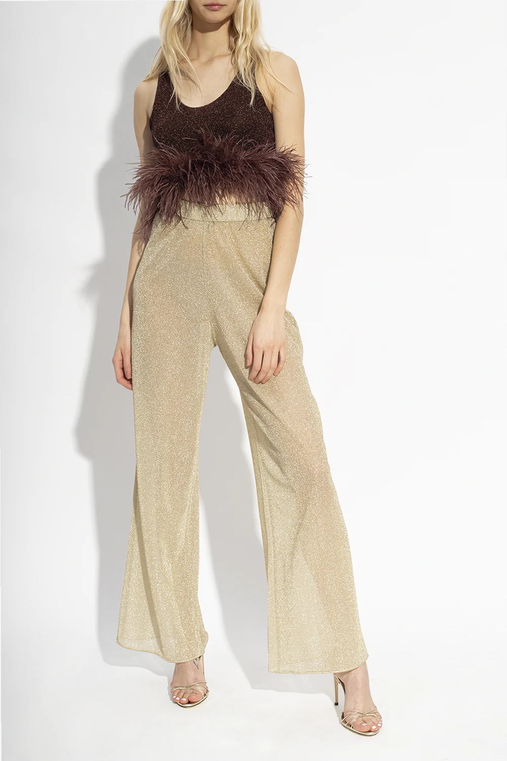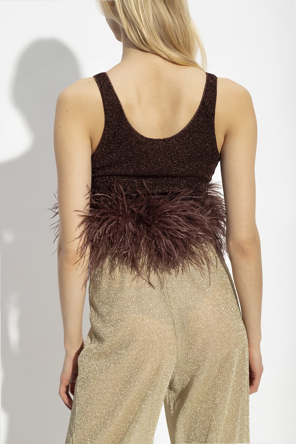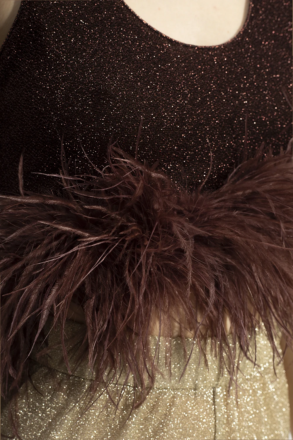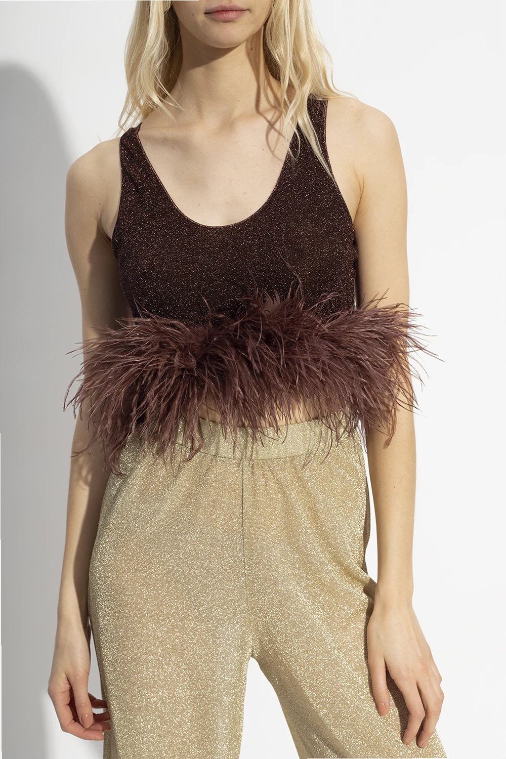 Dark brown crop top from Oseree. Inlaid with lurex fibers, this round neck design is enriched by ostrich feathers.