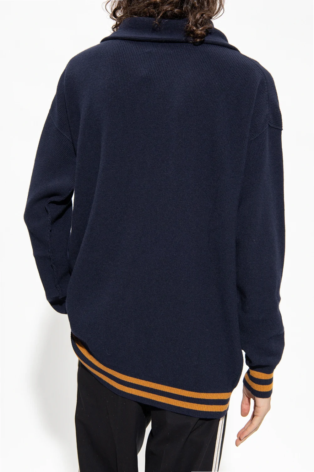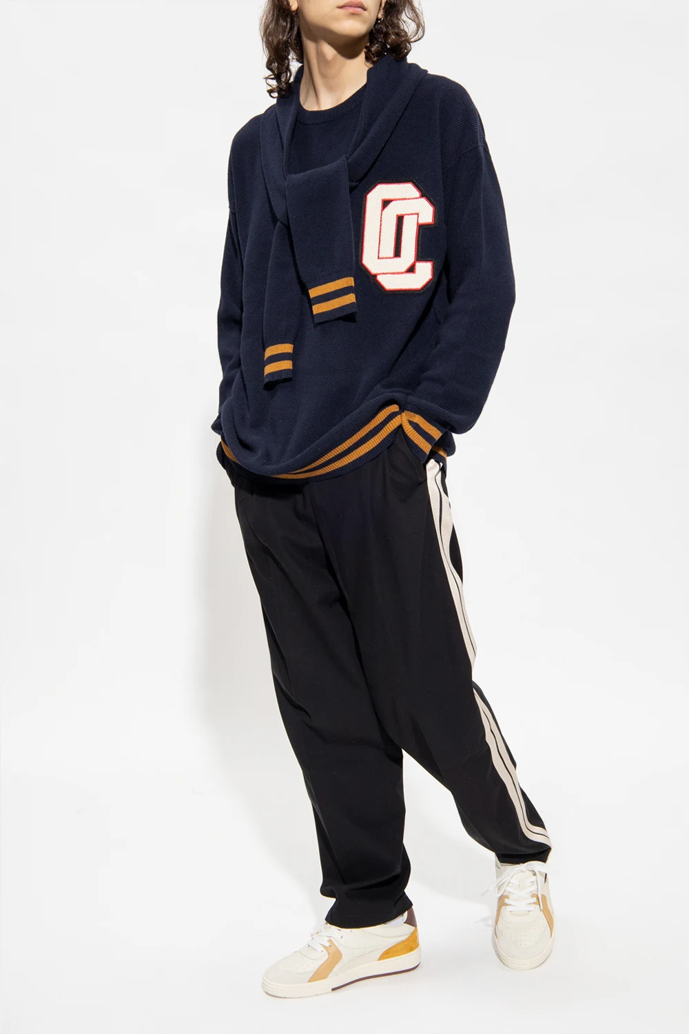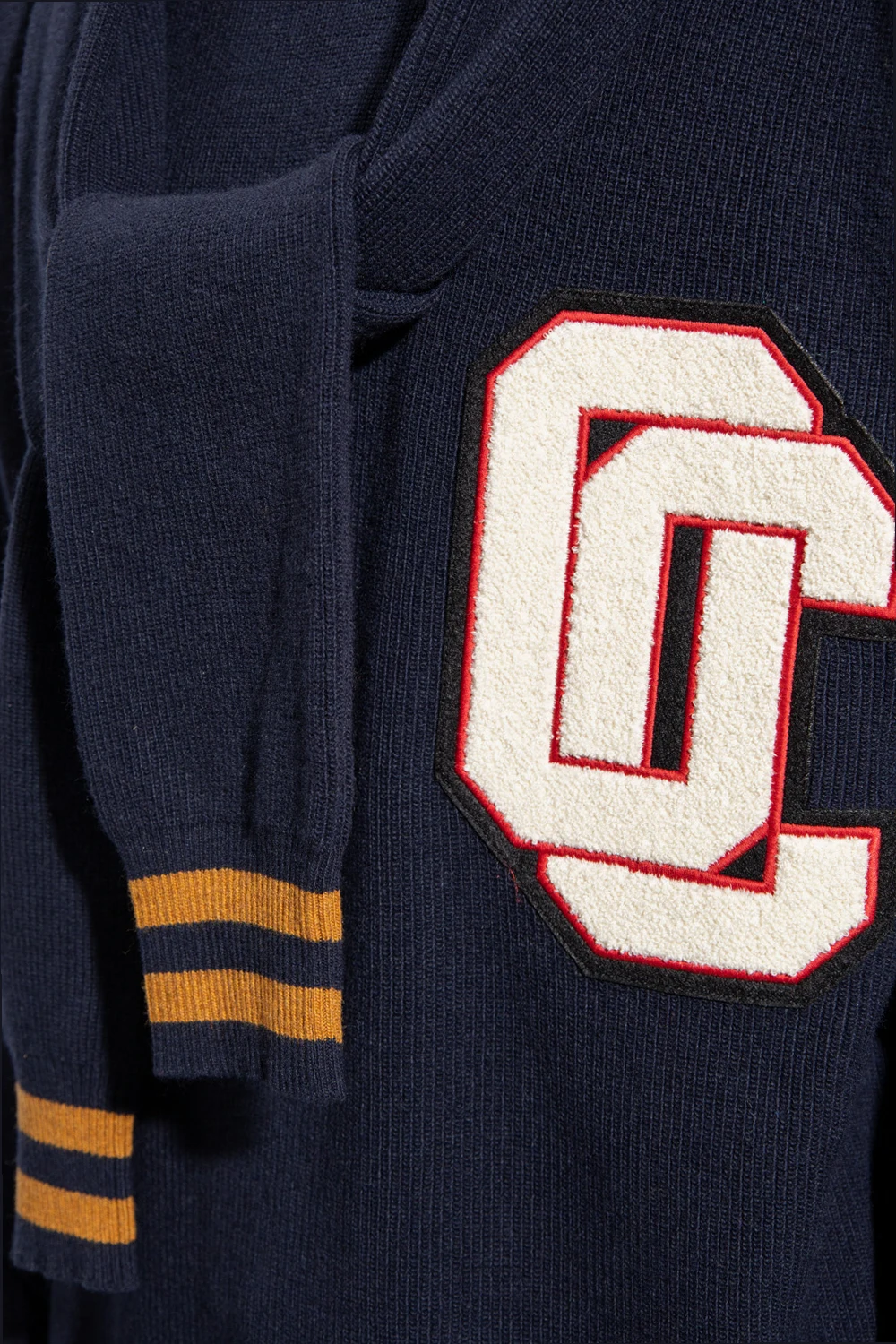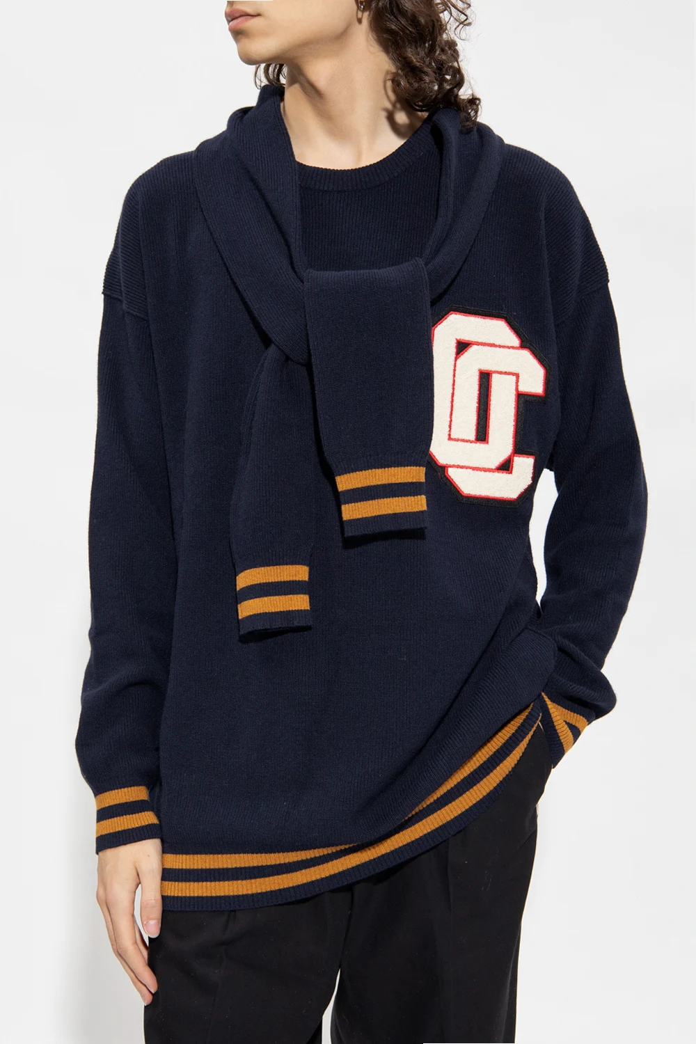 Navy blue and brown crewneck sweater from Opening Ceremony. Crafted with a relaxed fit, this style features long sleeves, a white and red logo patch on the front, a distinctive self-tie detail at the neck and ribbed trims on the collar, bottom hem and cuffs.