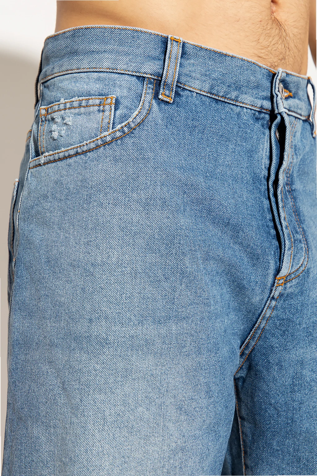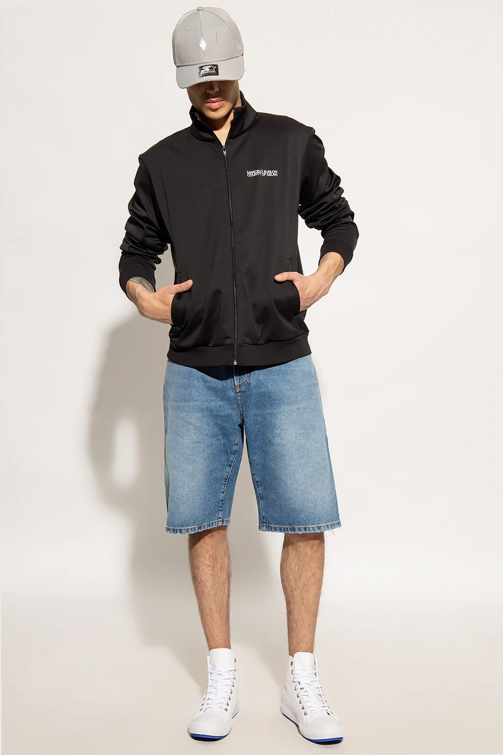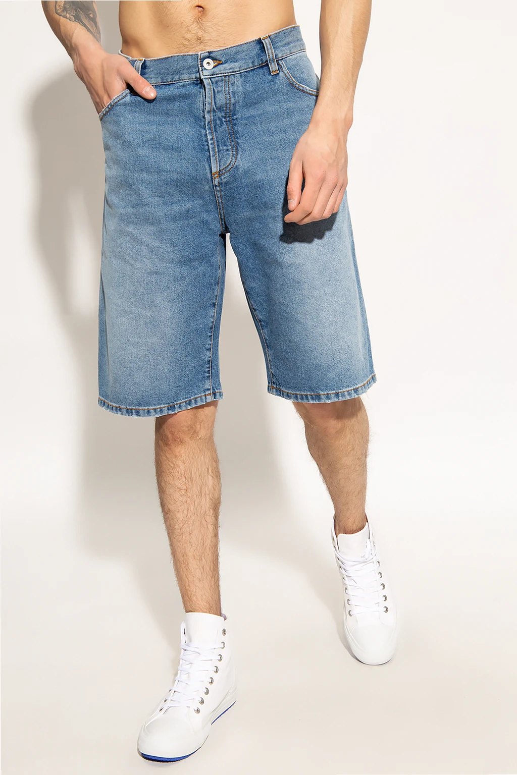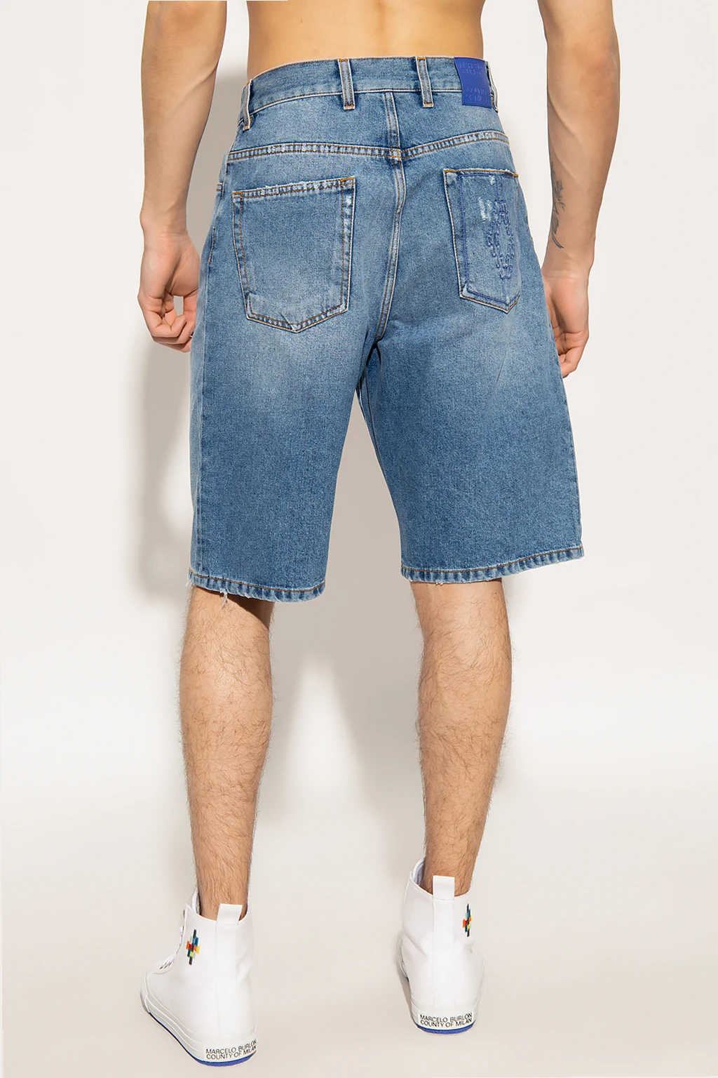 Blue denim shorts from Marcelo Burlon. Fastened with buttons, this pair features a logo-embossed patch at the back, five slip pockets and decorative logo embroidery in blue.