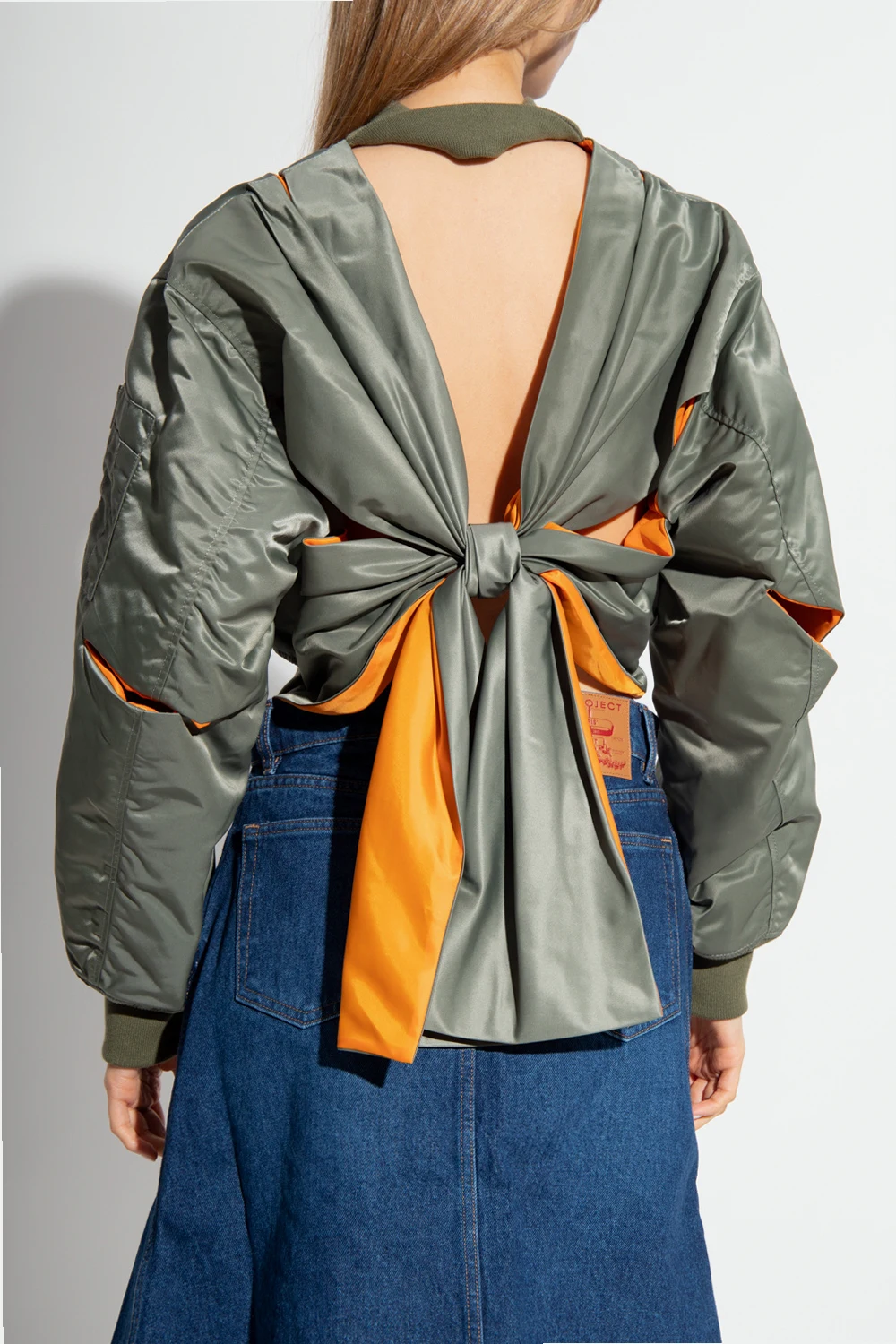 Khaki cropped bomber jacket from Undercover. Fastened with a zip, this design features decorative cut-outs, bow at the back, two snap-fastened pockets, one zip pocket and ribbed trims at the neck, hem and cuffs.