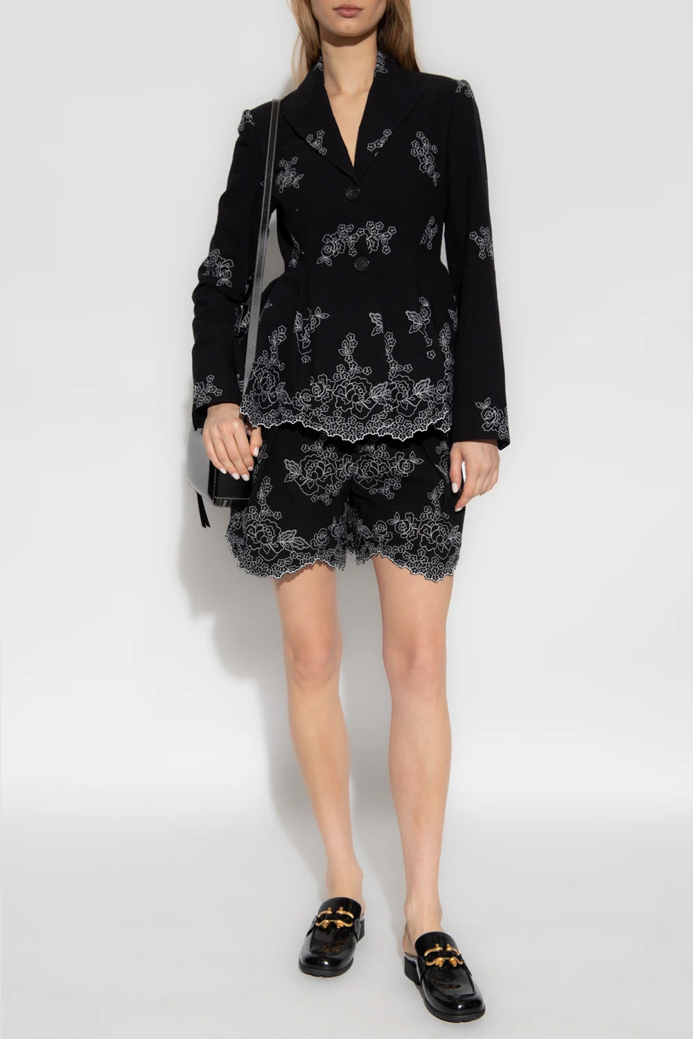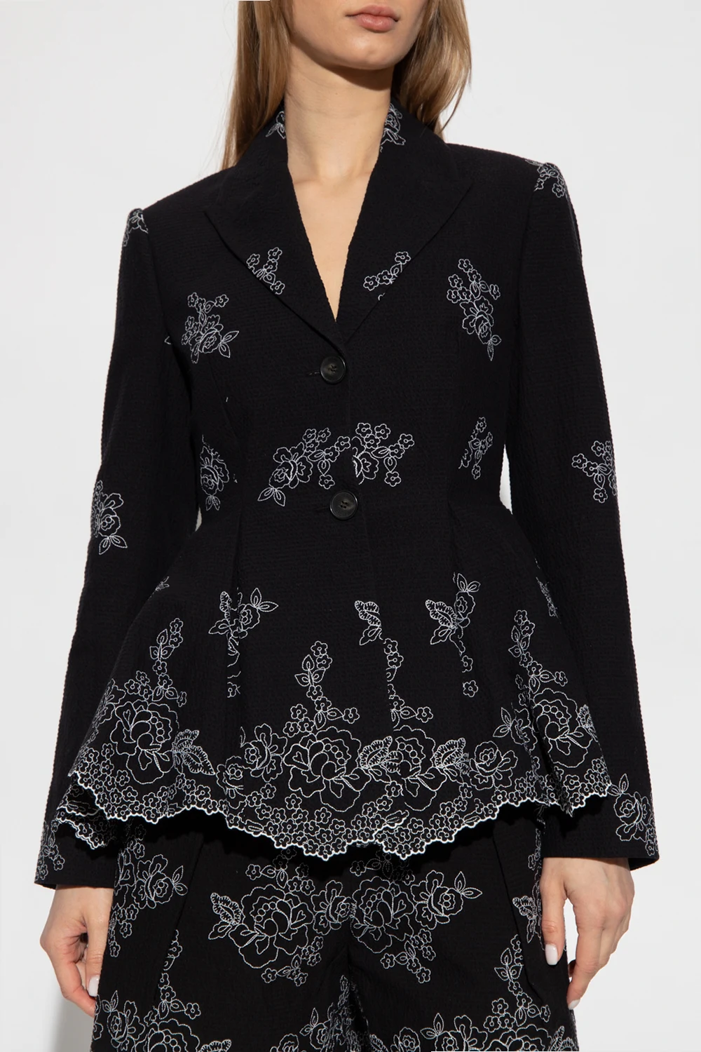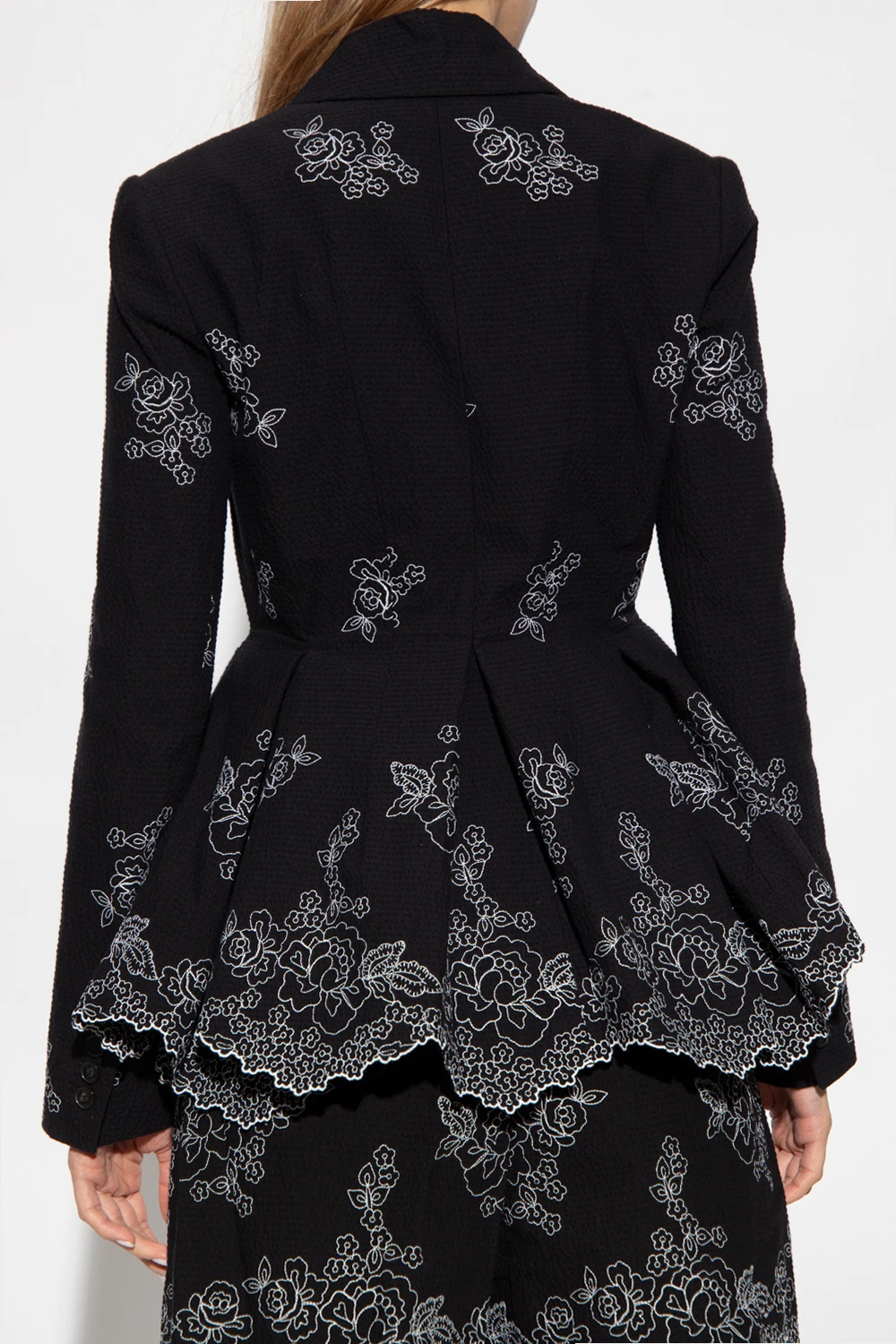 Black ‘Marlene’ single-breasted blazer from Erdem. Crafted from seersucker cotton with white floral embroidery, this style is fitted at the waist and features button fastenings, peak lapels, long sleeves with button cuffs and a scallop-edged, pleated peplum hem.