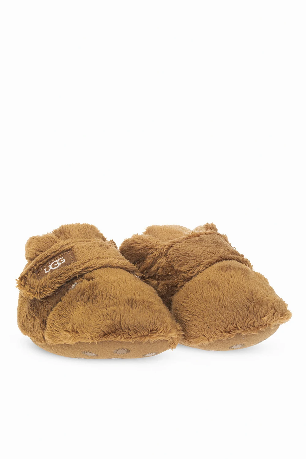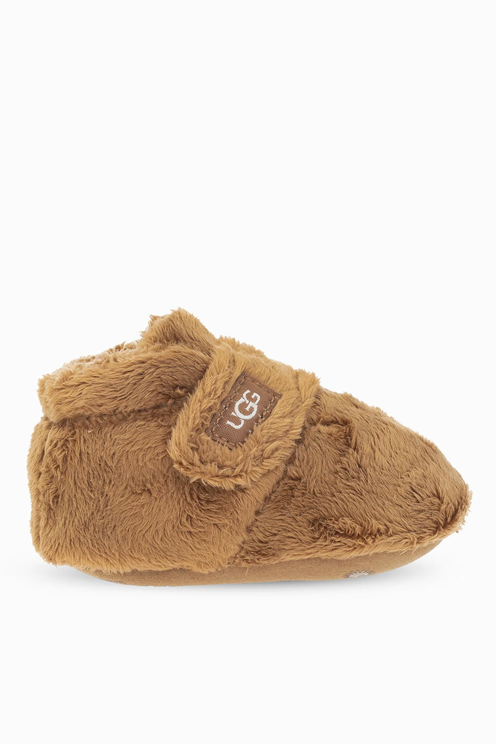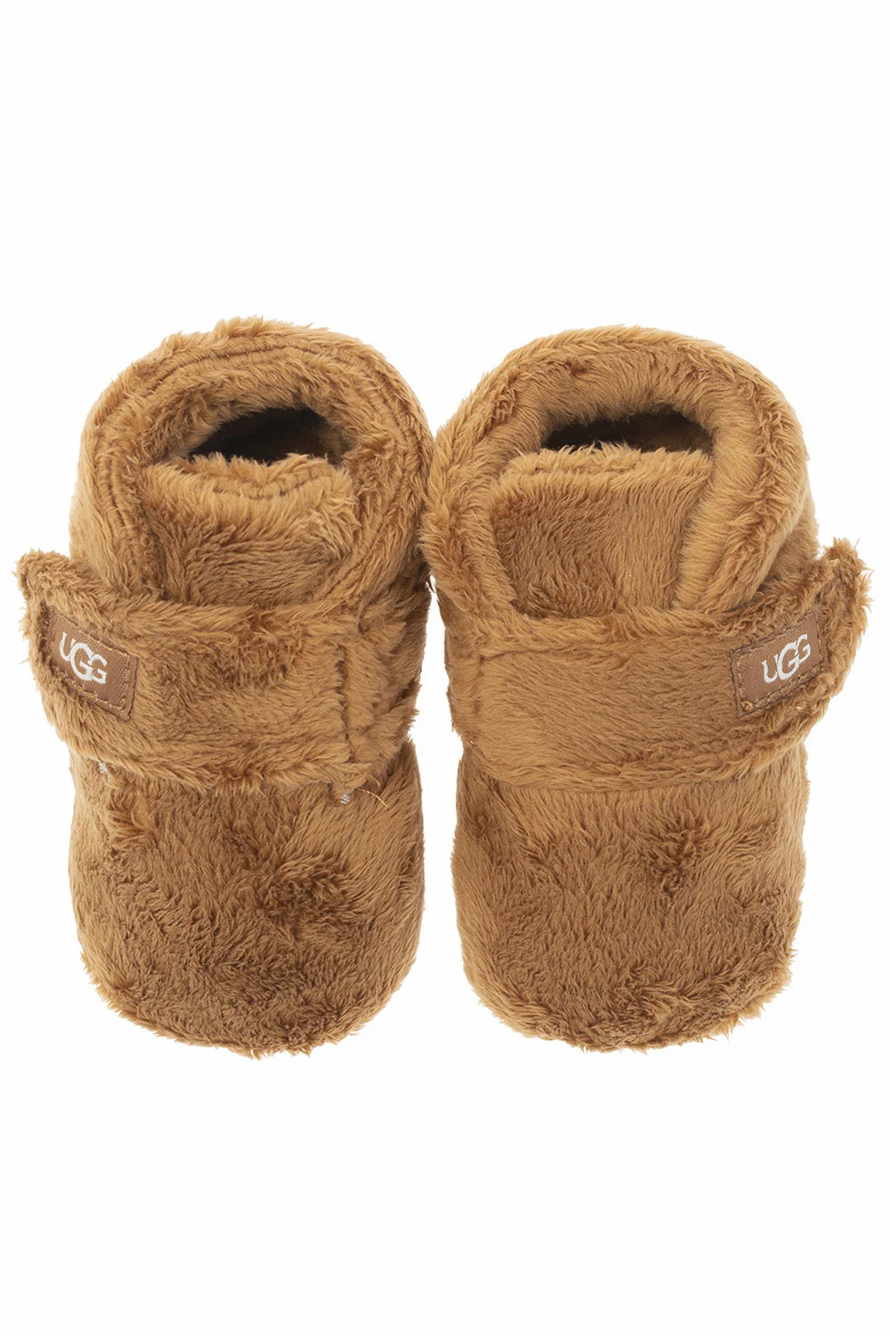 Brown set from UGG. Made of furry fleece, this set includes a beanie with appliqués and a logo patch as well as shoes with hook-and-loop closure, logo patch and brown sole with a slip-resistant rubber print.