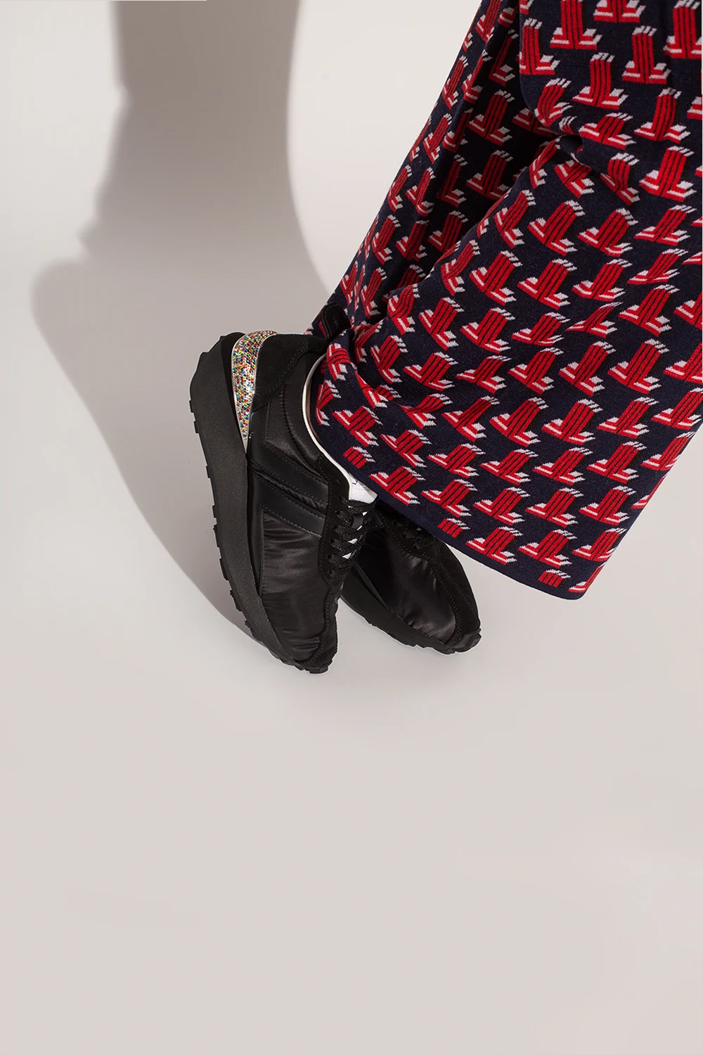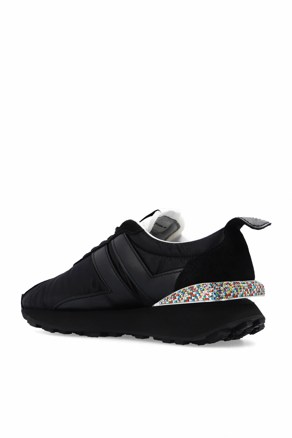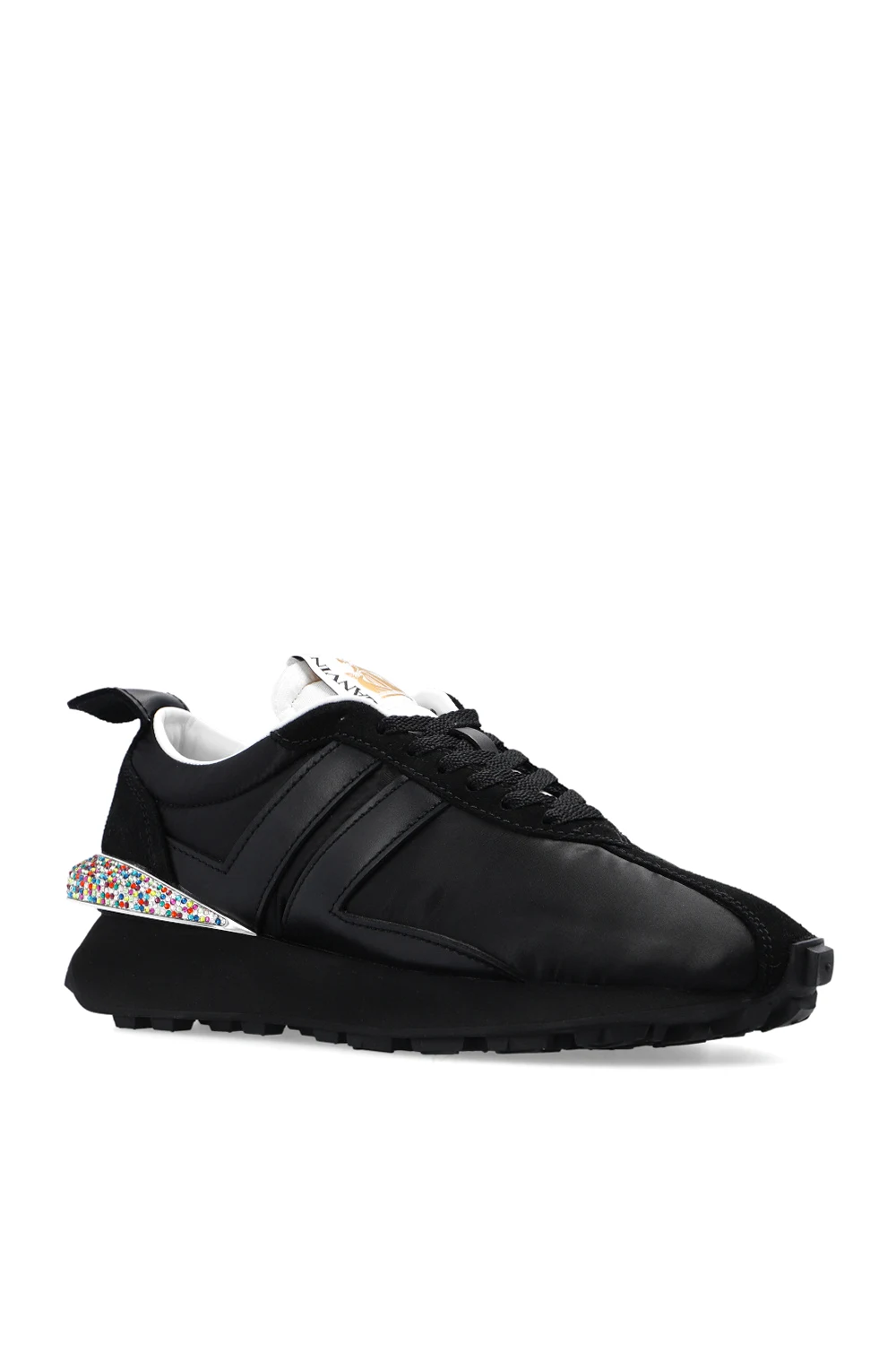 Black 'Bumpr' sneakers from Lanvin. Crafted from glistening fabric with suede and leather overlays, this lace-up model features a white tongue accentuated with a logo patch, a silver-tone heel appliqué covered with sparkling crystals, and a five-layered rubber sole. Inspired by the running shoe from the 70s.