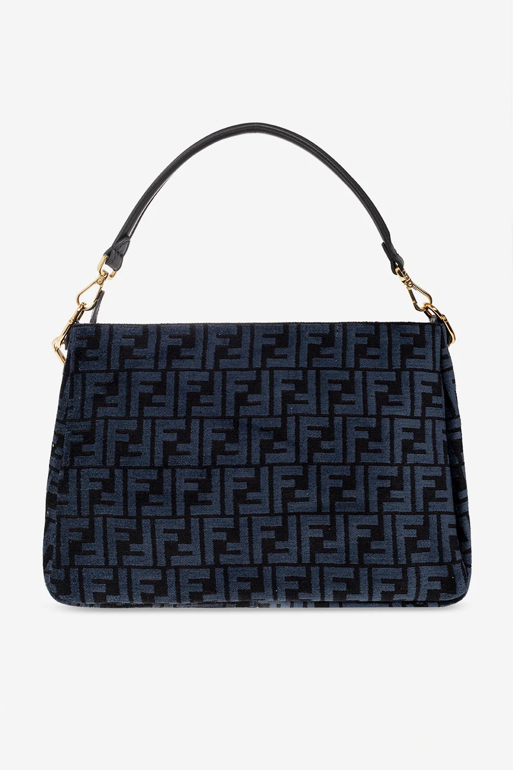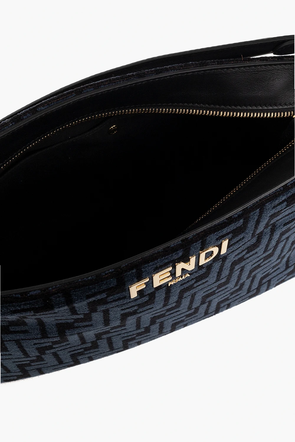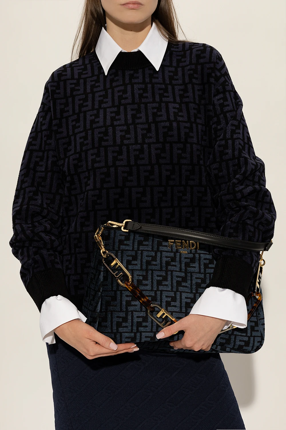 Black and navy ‘O'Lock Zip’ shoulder bag from Fendi. Crafted from canvas embroidered with a monogram, this model features a zip fastening, logo appliqué, detachable half-round handle, shoulder chain with a logo and tortoiseshell effect, gold-tone metal hardware and one internal compartment with one snap-fastened pocket and two slip pockets.