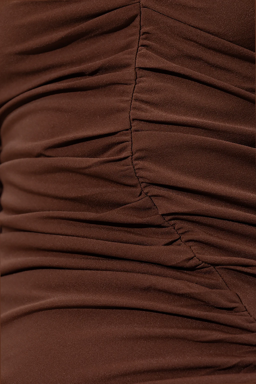 Brown dress from Helmut Lang. Fastened with hooks at the back, decorative draped details, asymmetric neckline, trims and long sleeves.