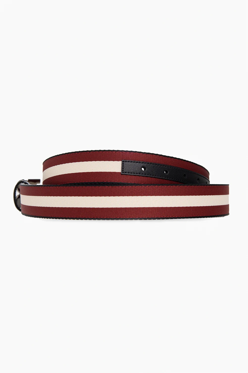 Maroon, cream and black ‘B-Buckle’ belt from Bally. Made of fabric and trimmed with leather, this item features a dark silver-tone B-Buckle closure with a texture.
